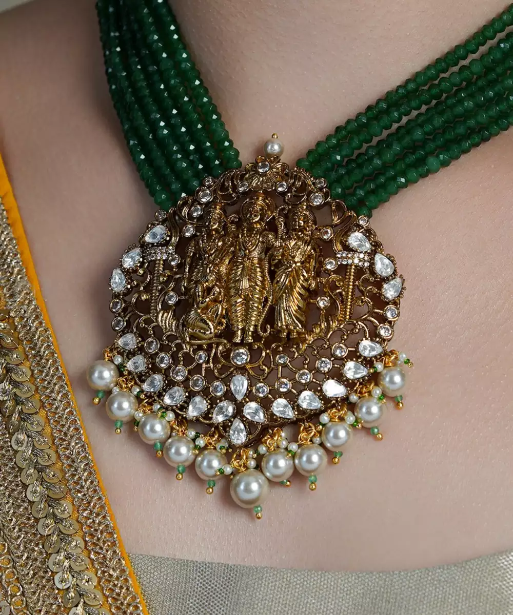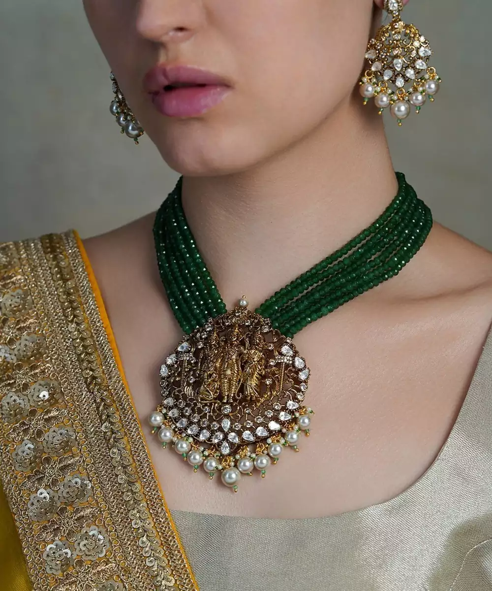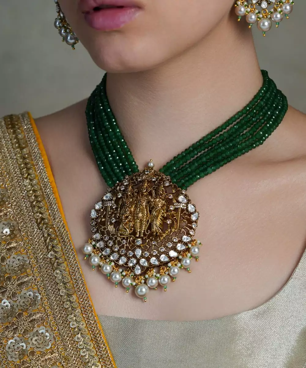Make A Royal Statement With The Emerald Dome Temple Necklace Set—A Traditional Necklace Set Adorned With Emerald Accents And Intricate Temple Inspired Craftsmanship.