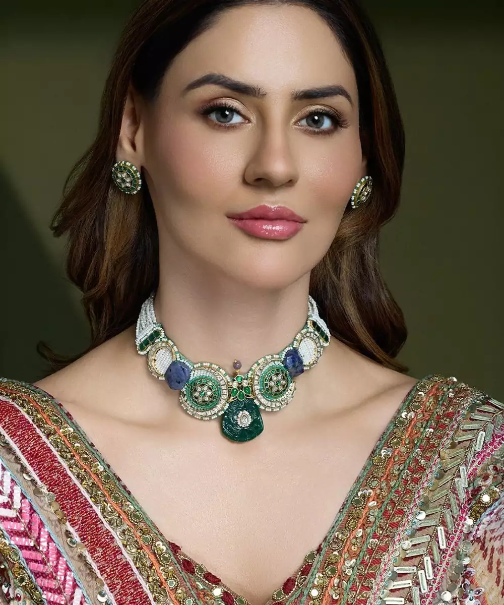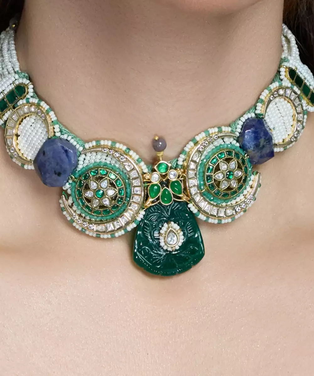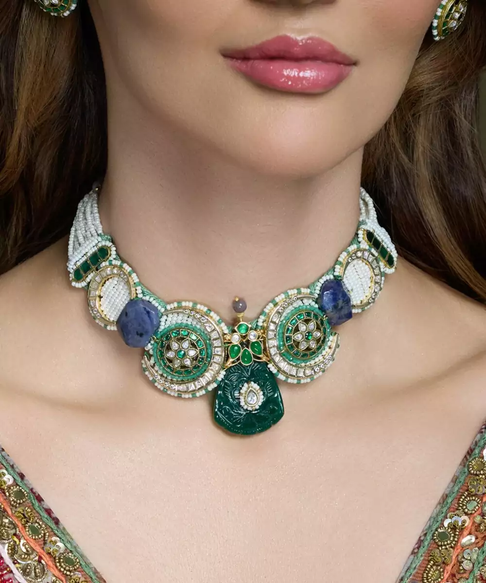 Unique Necklace Set With Pearl Detailing, Blue And Green Stone Accents, And Floral Motifs. Paired With Matching Earrings. Perfect For Ethnic Occasions, Adding A Bold And Regal Touch.