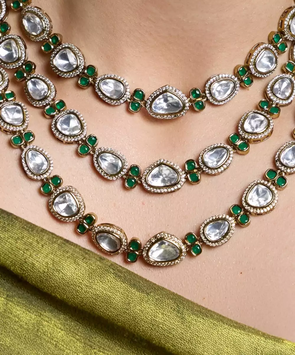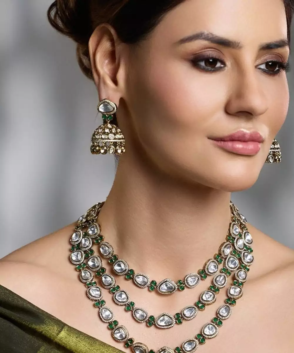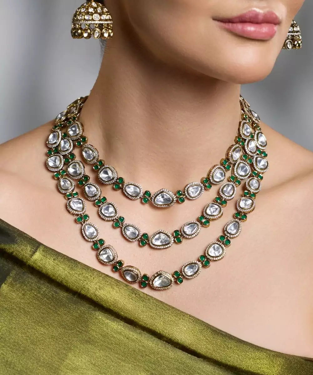 Stunning Three Layered Kundan Rani Haar With Green Accents And Gold Finish, Paired With Traditional Jhumka Earrings. Ideal For Weddings And Festive Celebrations, Offering A Majestic, Regal Appearance.