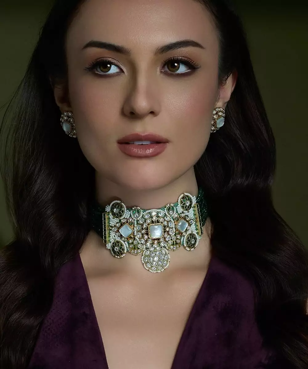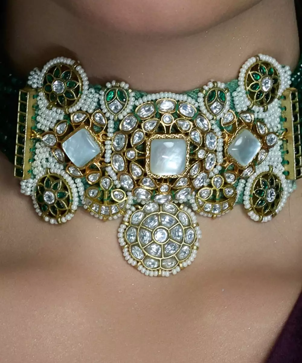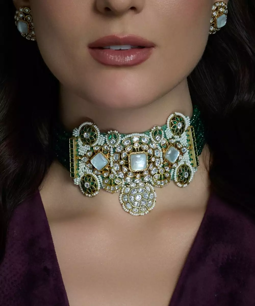 Grab Attention With This Regal Green Thread Choker, Studded With Dazzling Stones And Paired With Elegant Earrings. Designed To Evoke Heritage, Power, And Refined Beauty In Every Look.