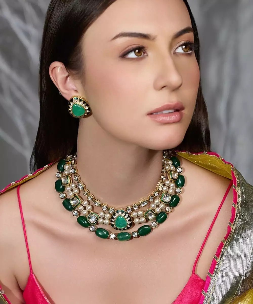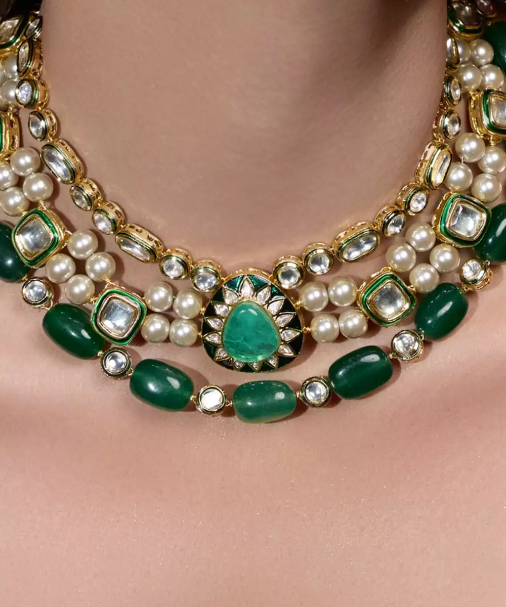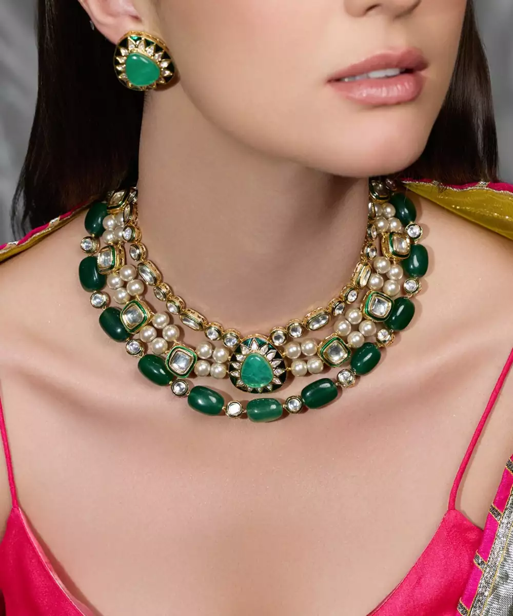 Grace Your Neckline With This Opulent Green Stone And Pearl Necklace Set. It's Designed To Reflect Timeless Royalty, Luminous Charm, And An Aura Of Powerful Sophistication For Any Grand Occasion.