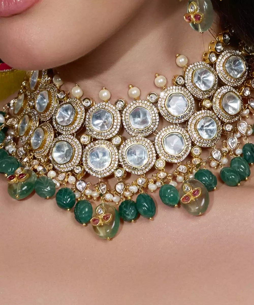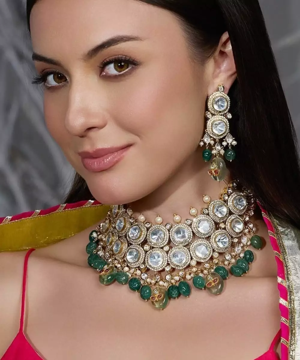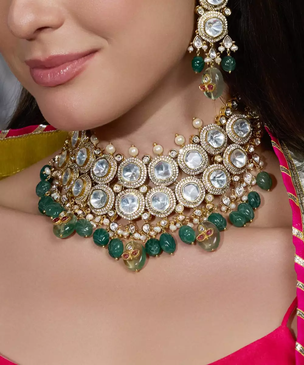 An Elegant Blend Of Mirror Polished Stones And Emerald Green Beads. This Necklace Set Captures Festive Glamour And Traditional Opulence, Making Every Occasion Feel Like Royalty.