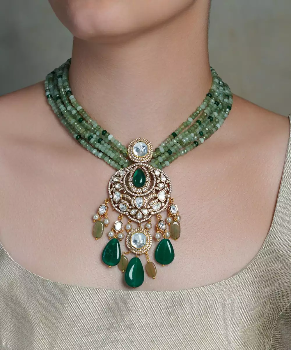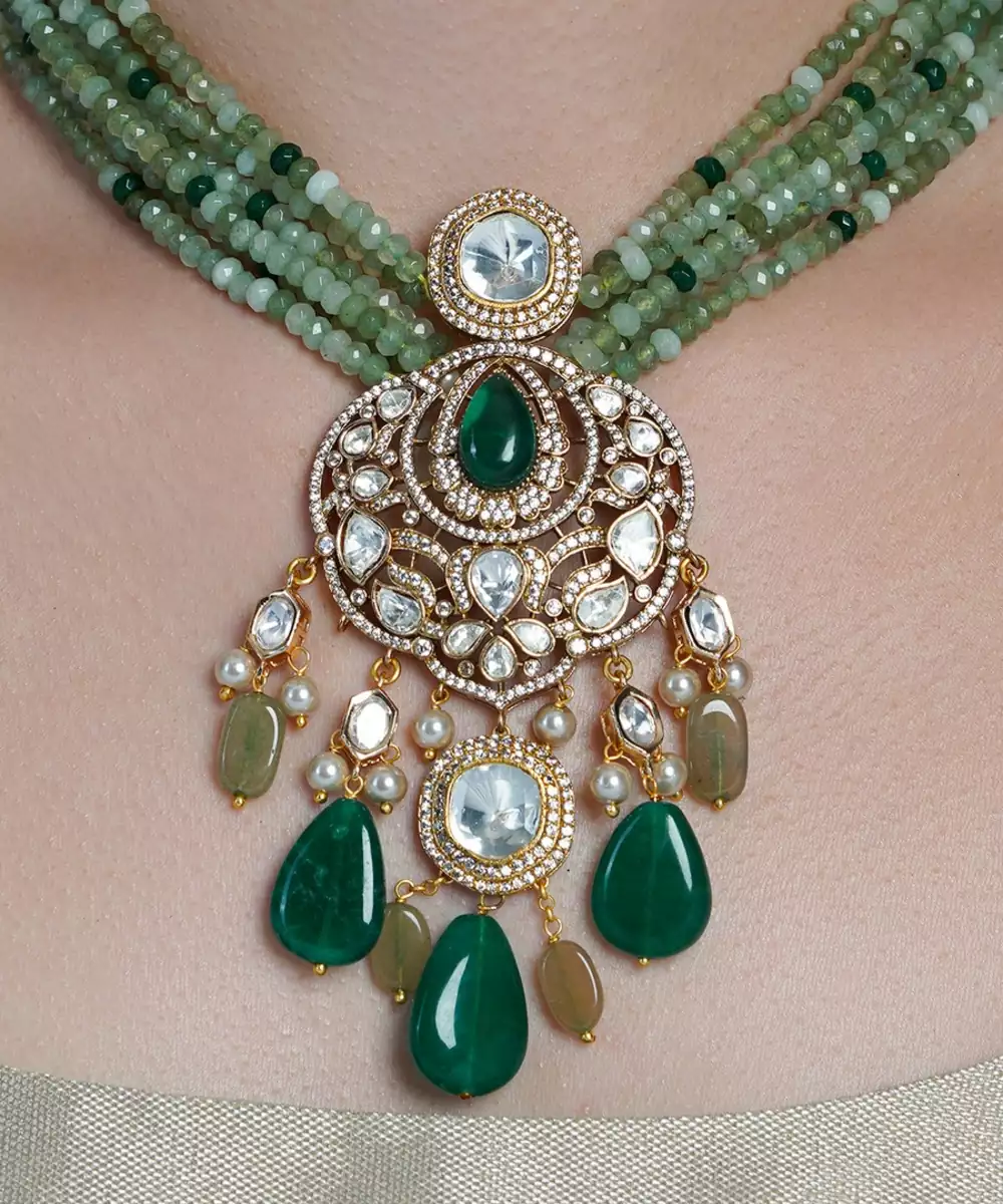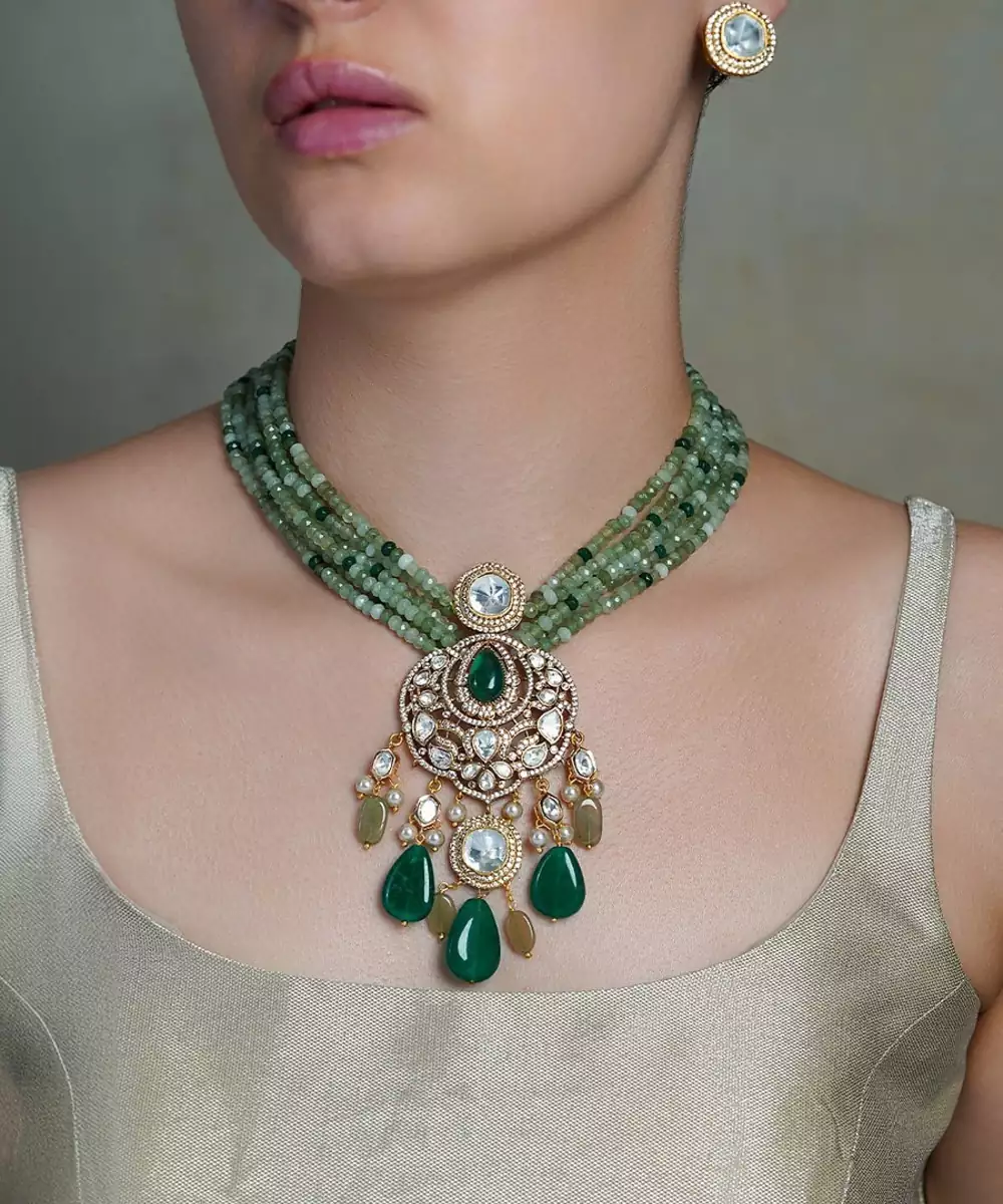 Make A Regal Statement With The Jade Polki Emerald Drop Necklace Set—A Luxurious Necklace Set Adorned With Polki Stones And Emerald Drops For Graceful Allure.