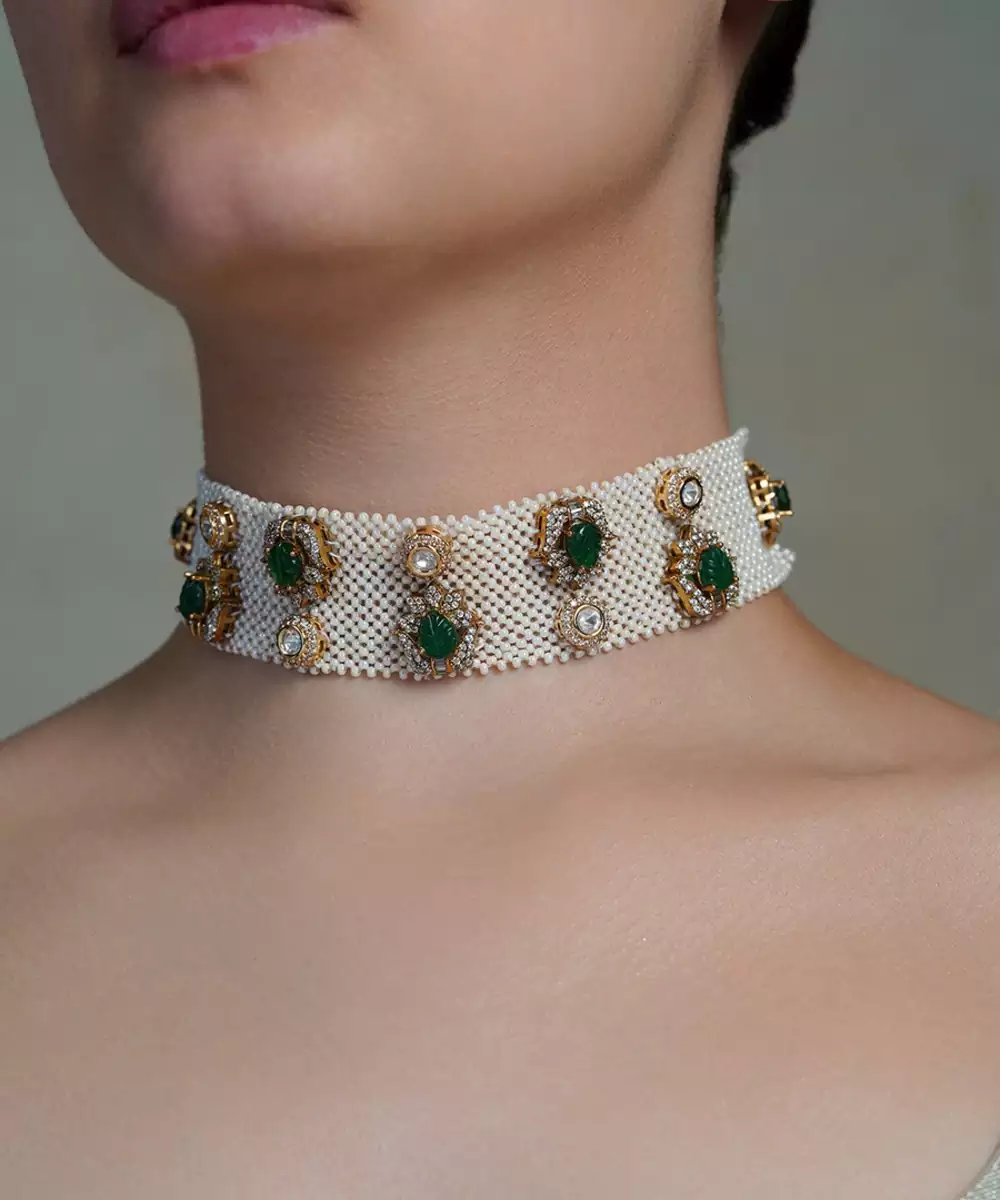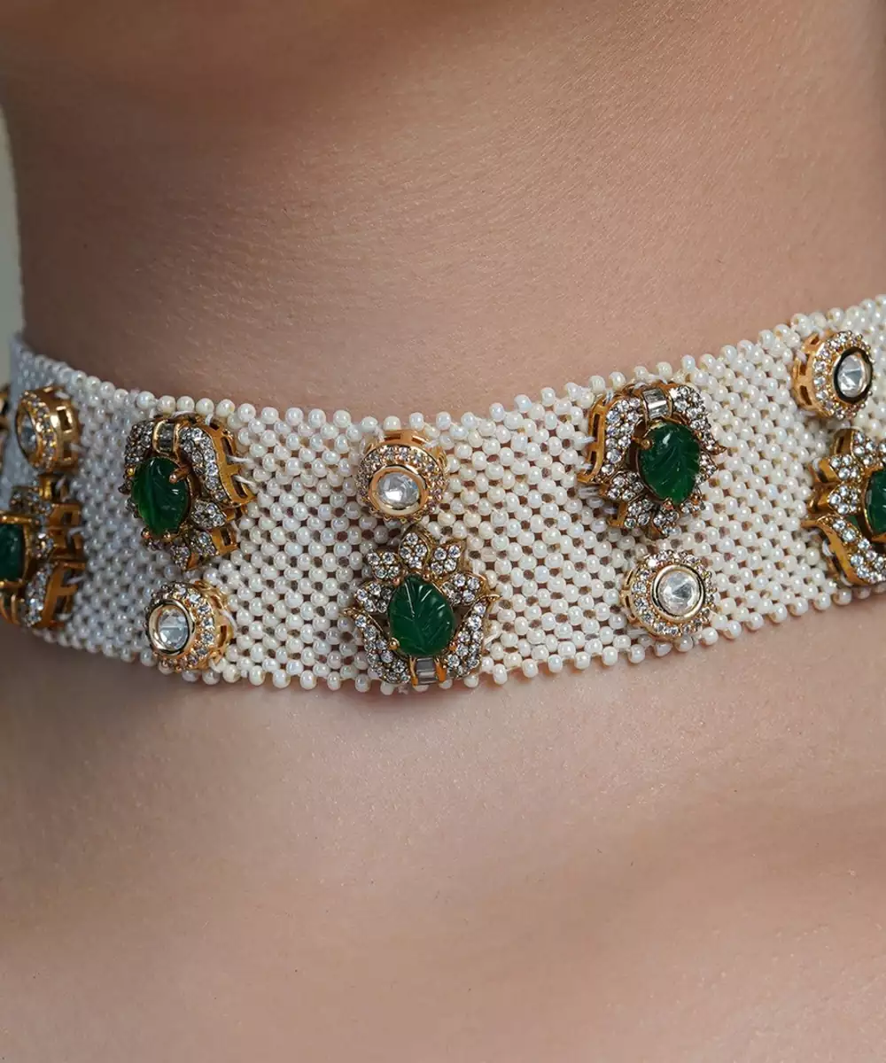 The Pearl Emerald Bloom Choker Blends Classic Pearls With Radiant Emeralds In A Floral Design. This Elegant Bloom Choker Adds Grace To Any Occasion.
