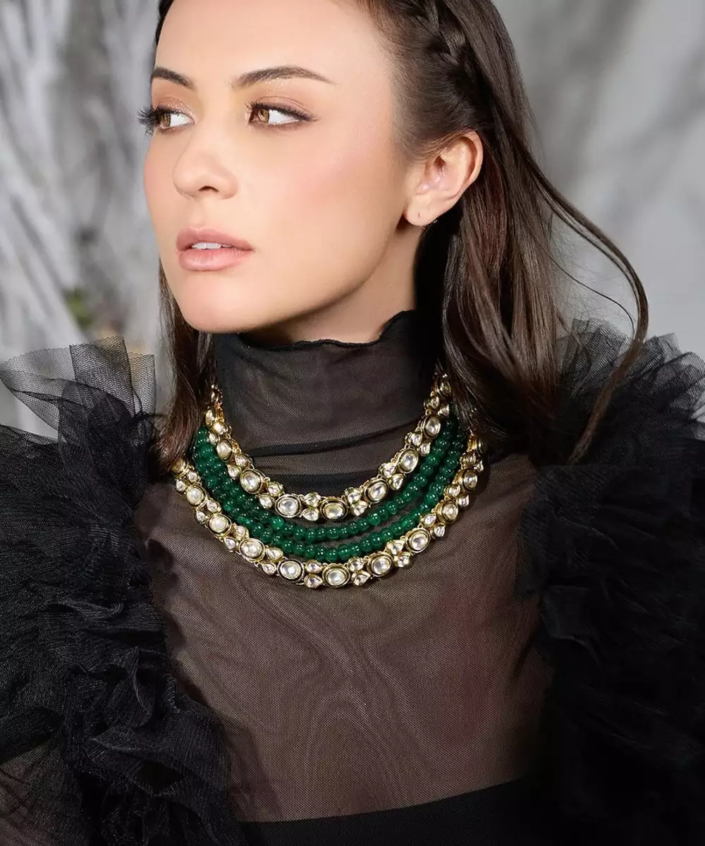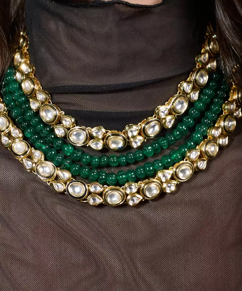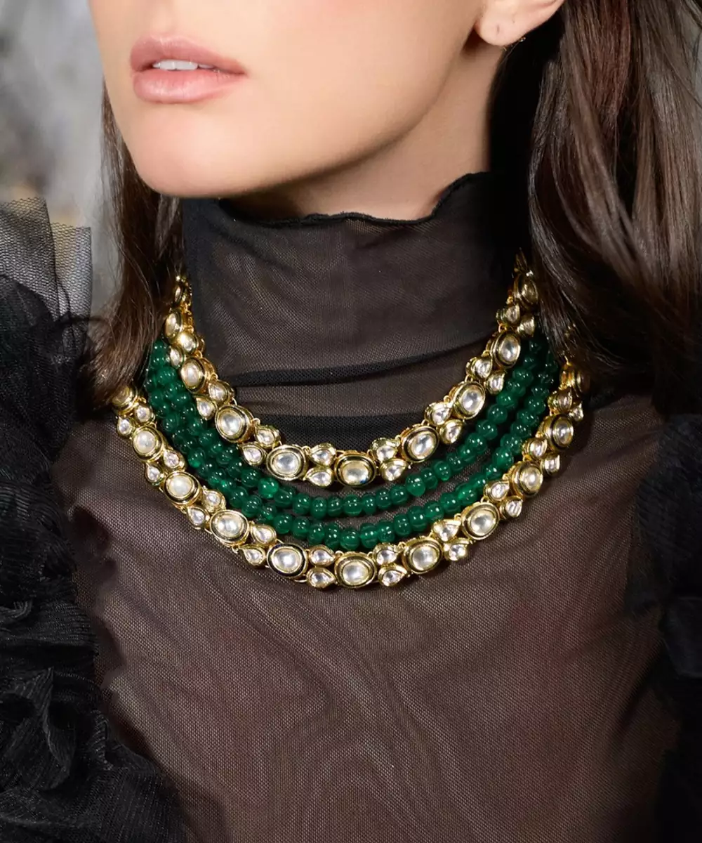 Elevate Your Ethnic Look With This Regal Aura Green Polki Necklace. Featuring Layers Of Rich Green Beads And Sparkling Polki Stones, It Exudes Timeless Elegance—Perfect For Weddings, Festivals, Or Traditional Celebrations.