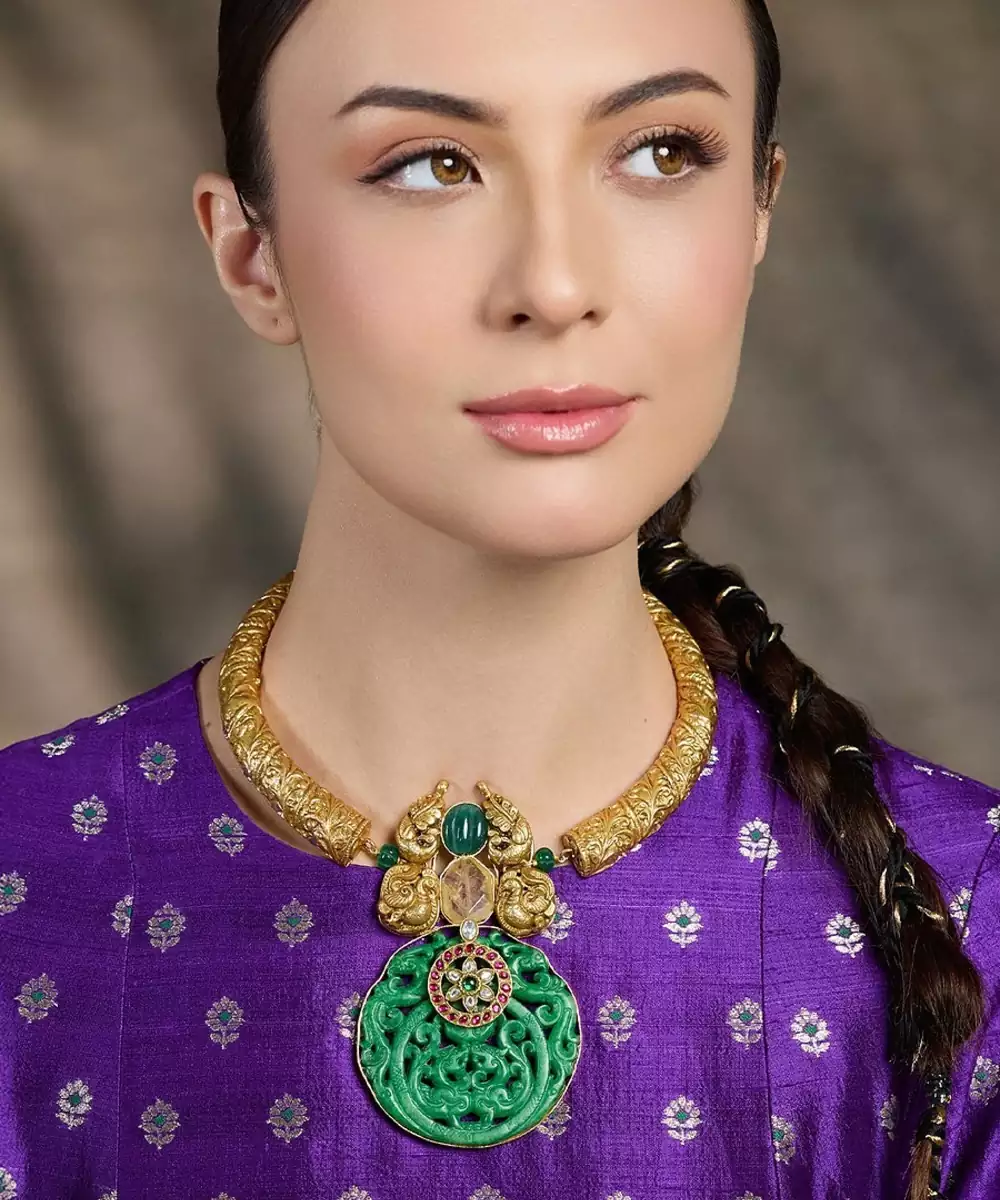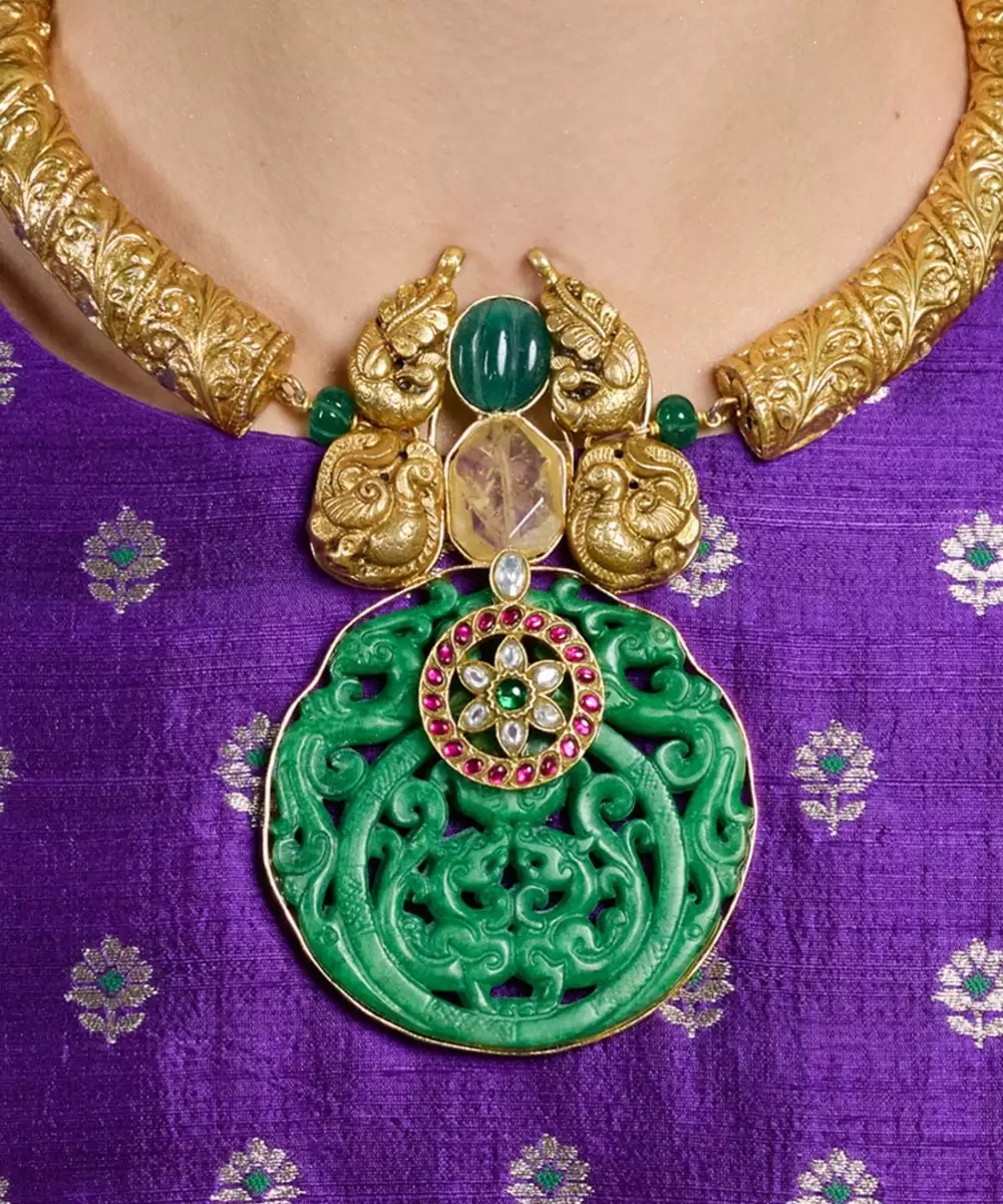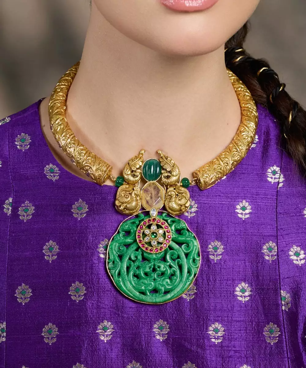 A Regal Blend Of Gold And Green, This Handcrafted Necklace Features Intricate Design And Bold Elegance, Perfect For Traditional Wear And Timeless Sophistication.