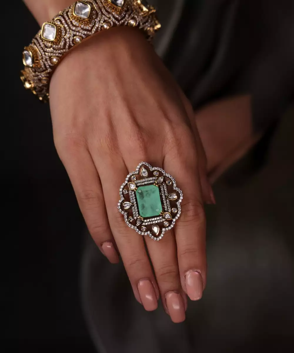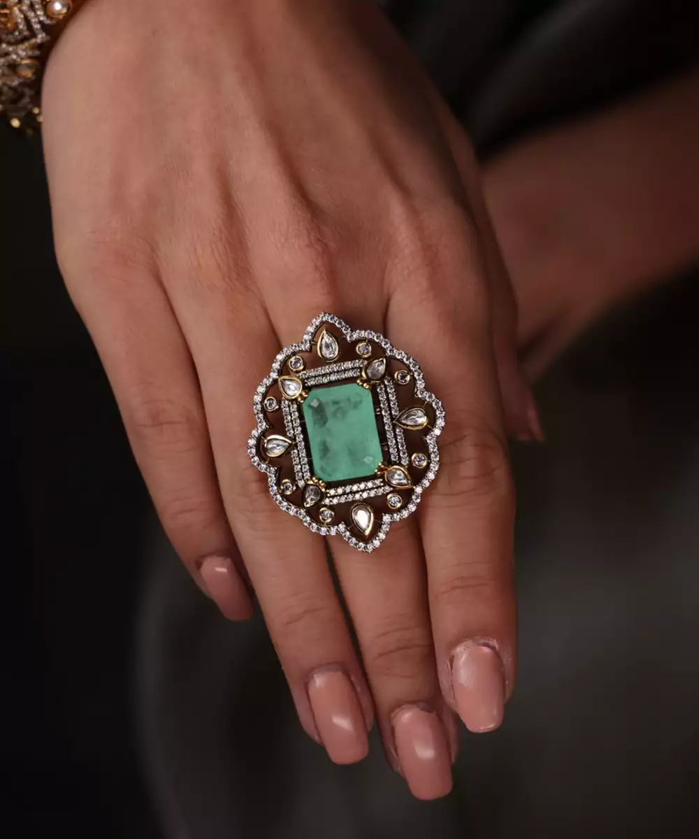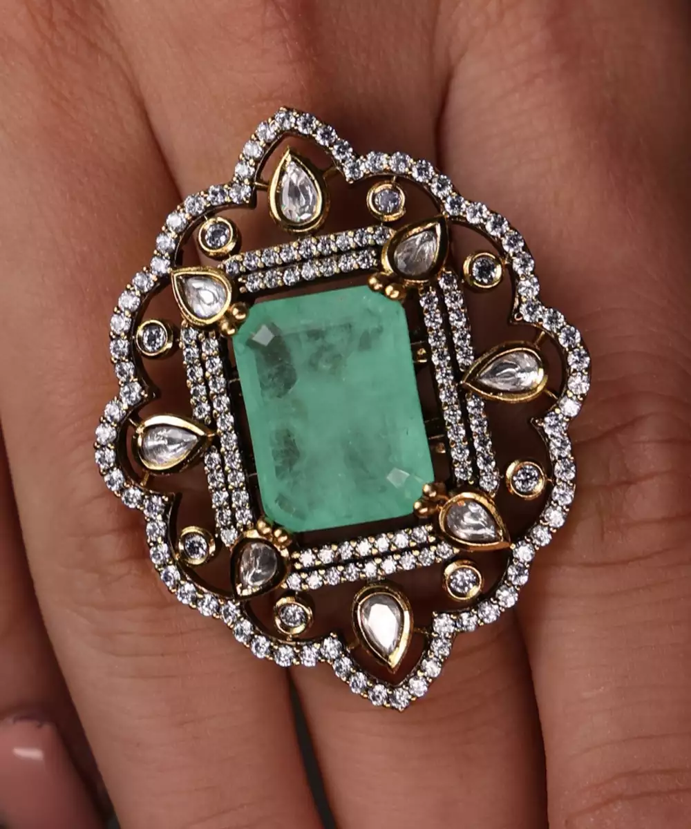 Inspired By Ocean Hues, The Ocean Glow Polki Ring Sparkles With Aqua Stones And Polki Detailing. A Radiant Piece For Parties Or Festive Occasions, Adding Fresh Elegance To Your Style.