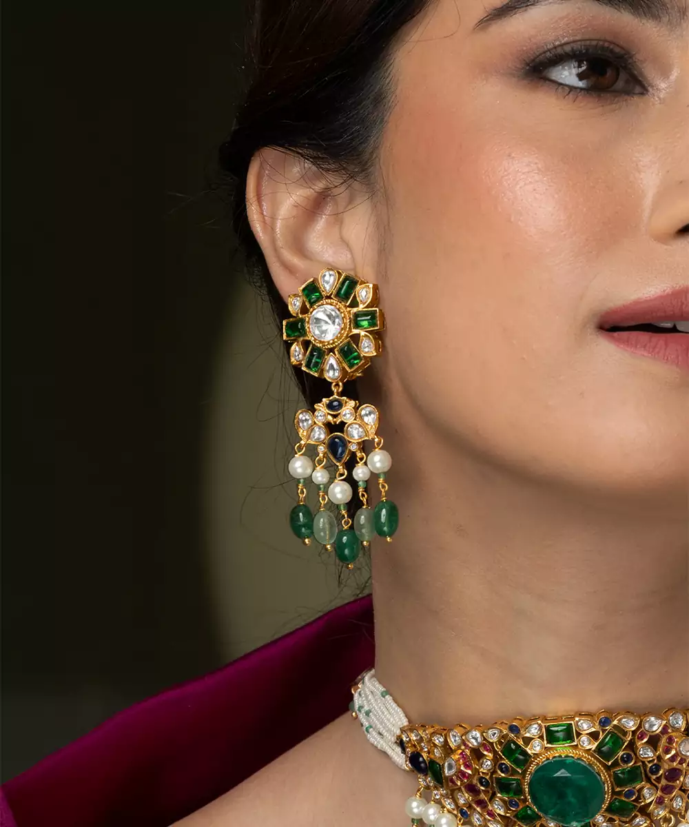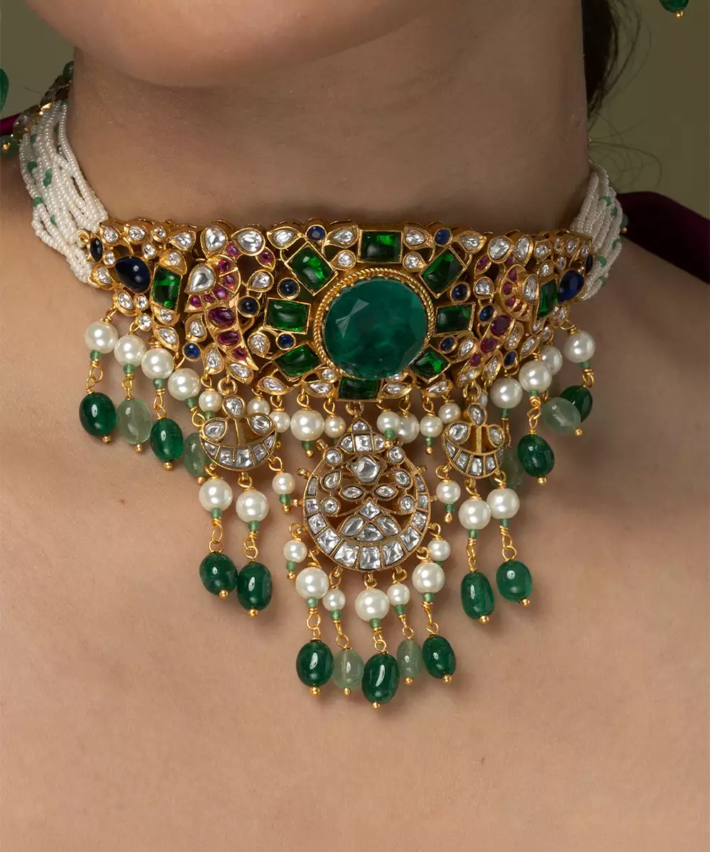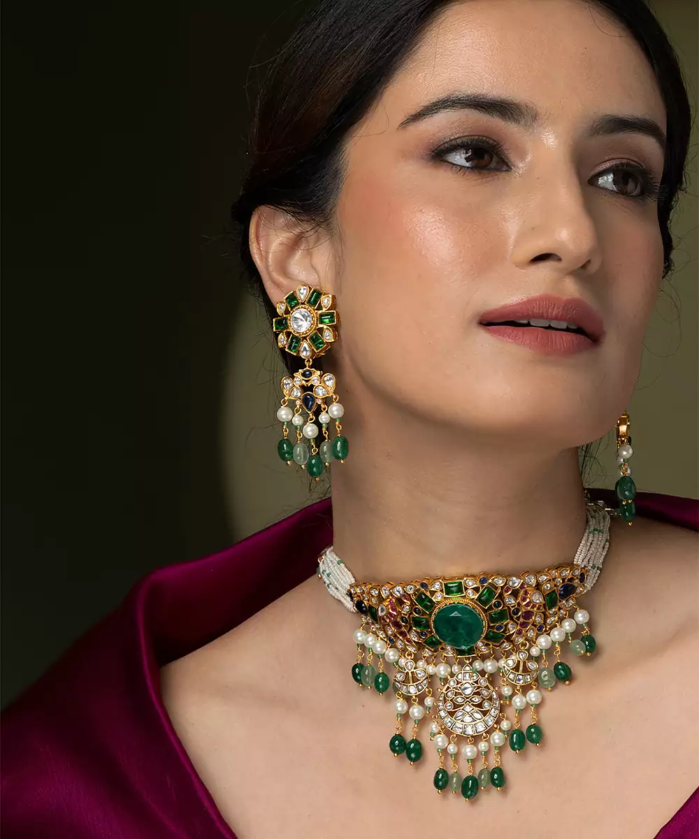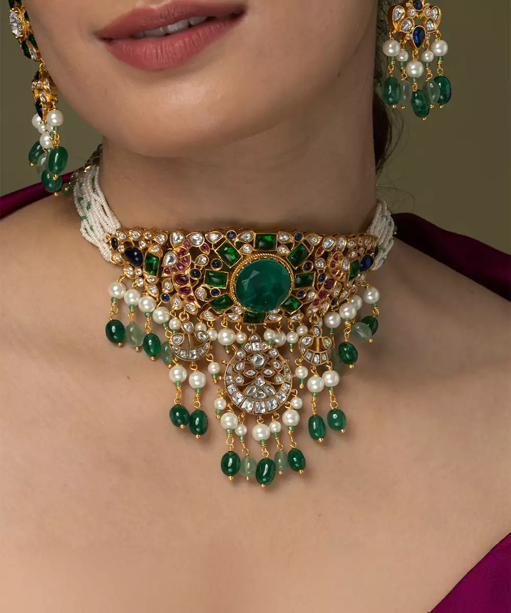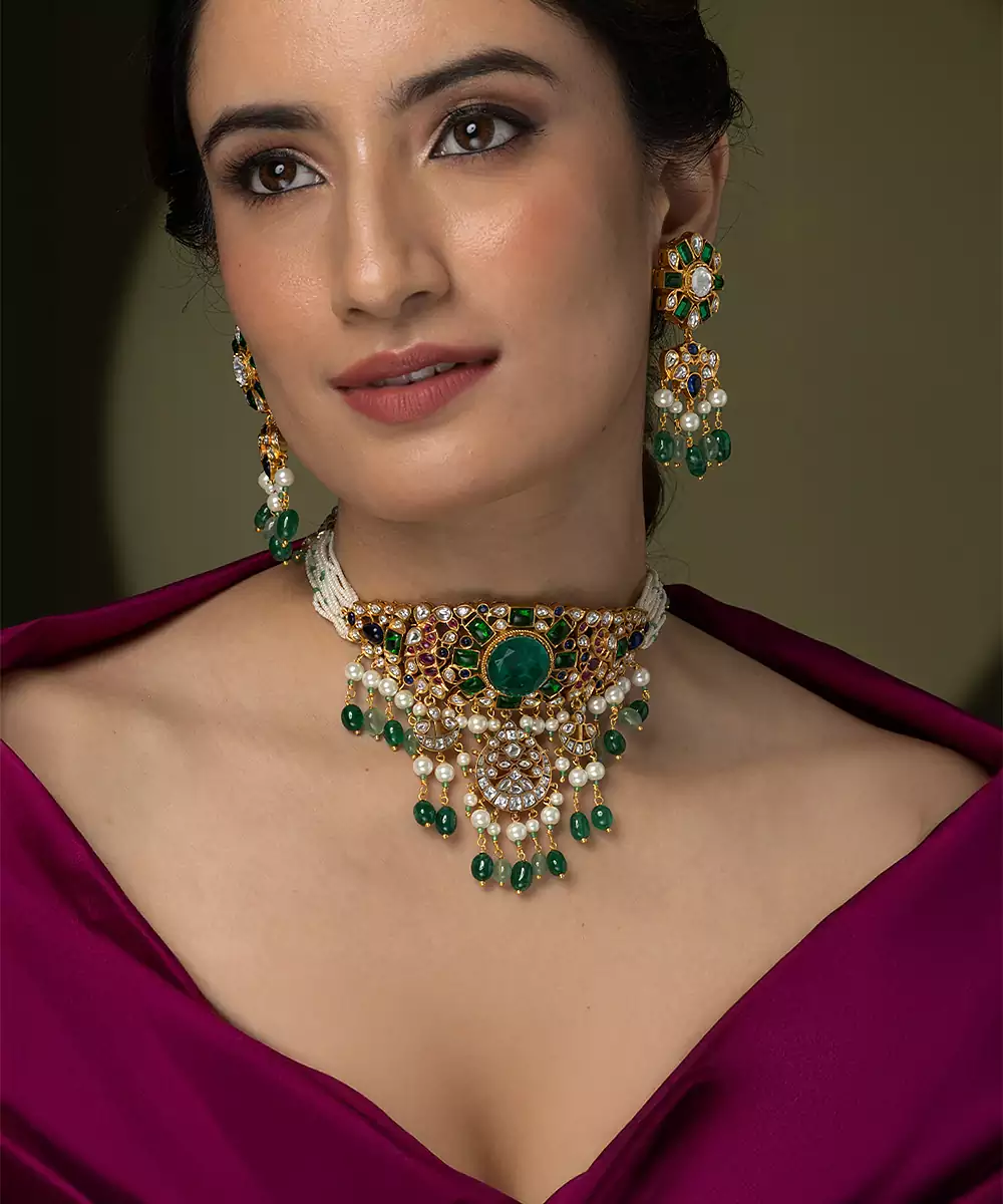 Adorn Yourself In Royal Splendor. This Exquisite Choker Necklace Set Features A Vibrant Mosaic Of Hand Painted Meenakari, Lustrous Kundan Gems, And Cascading Emerald Droplets. A True Celebration Of Heritage Artistry.