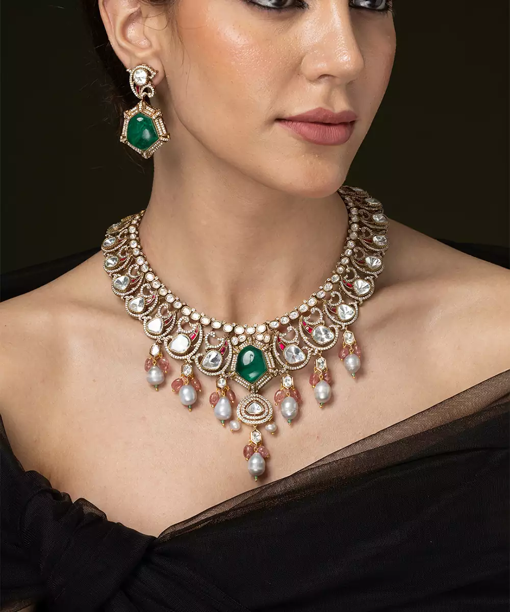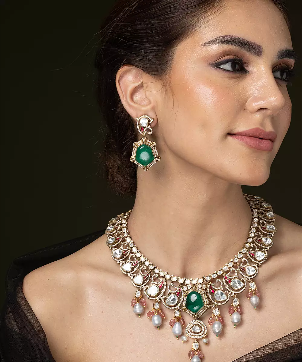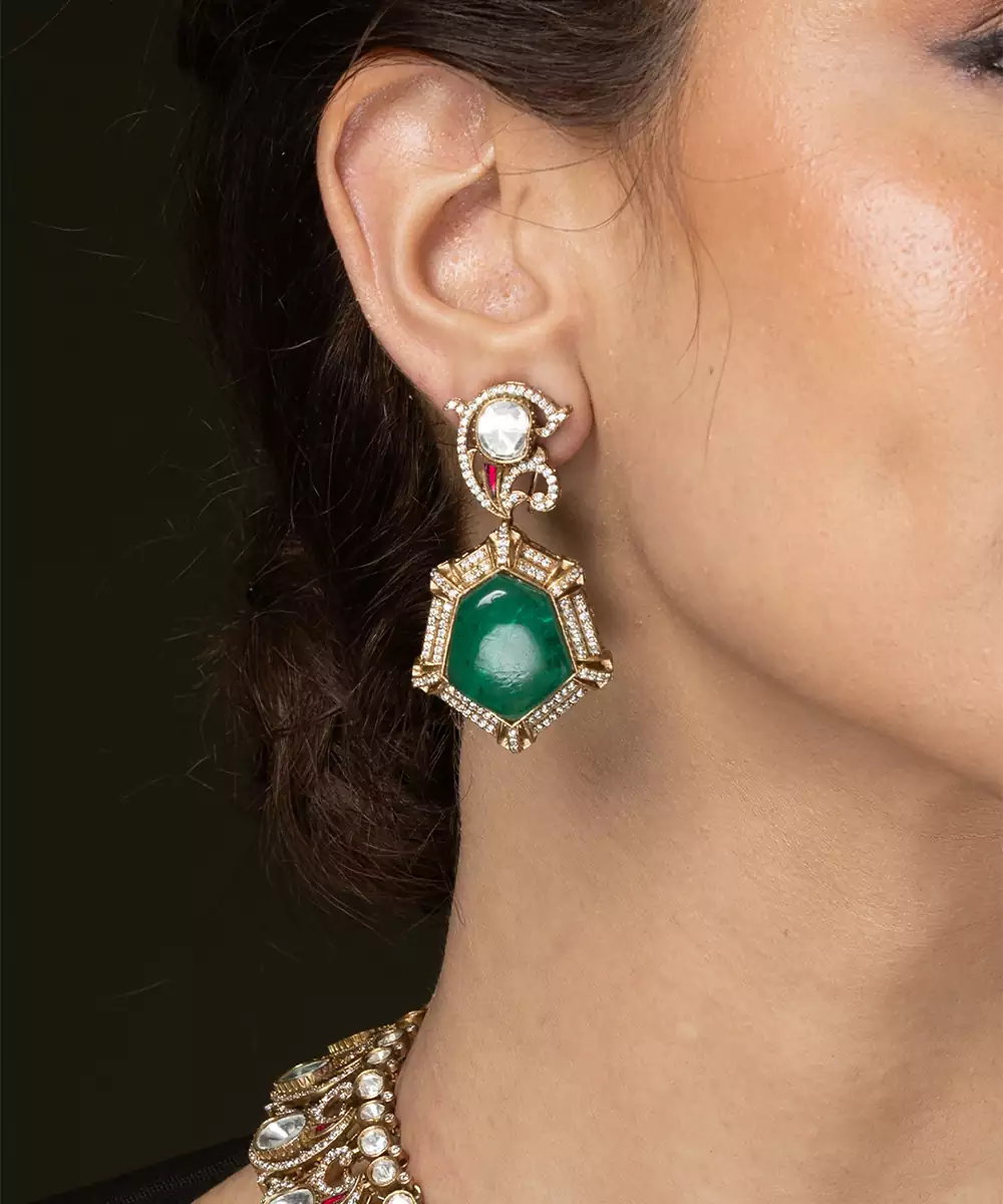This Statement Necklace Set Brings Dazzling Heritage Elegance To Your Look! It Features Beautiful Clusters Of Flat Cut Gems Surrounding A Prominent Central Cabochon Stone, All Finished With Delicate Rounded Drops.