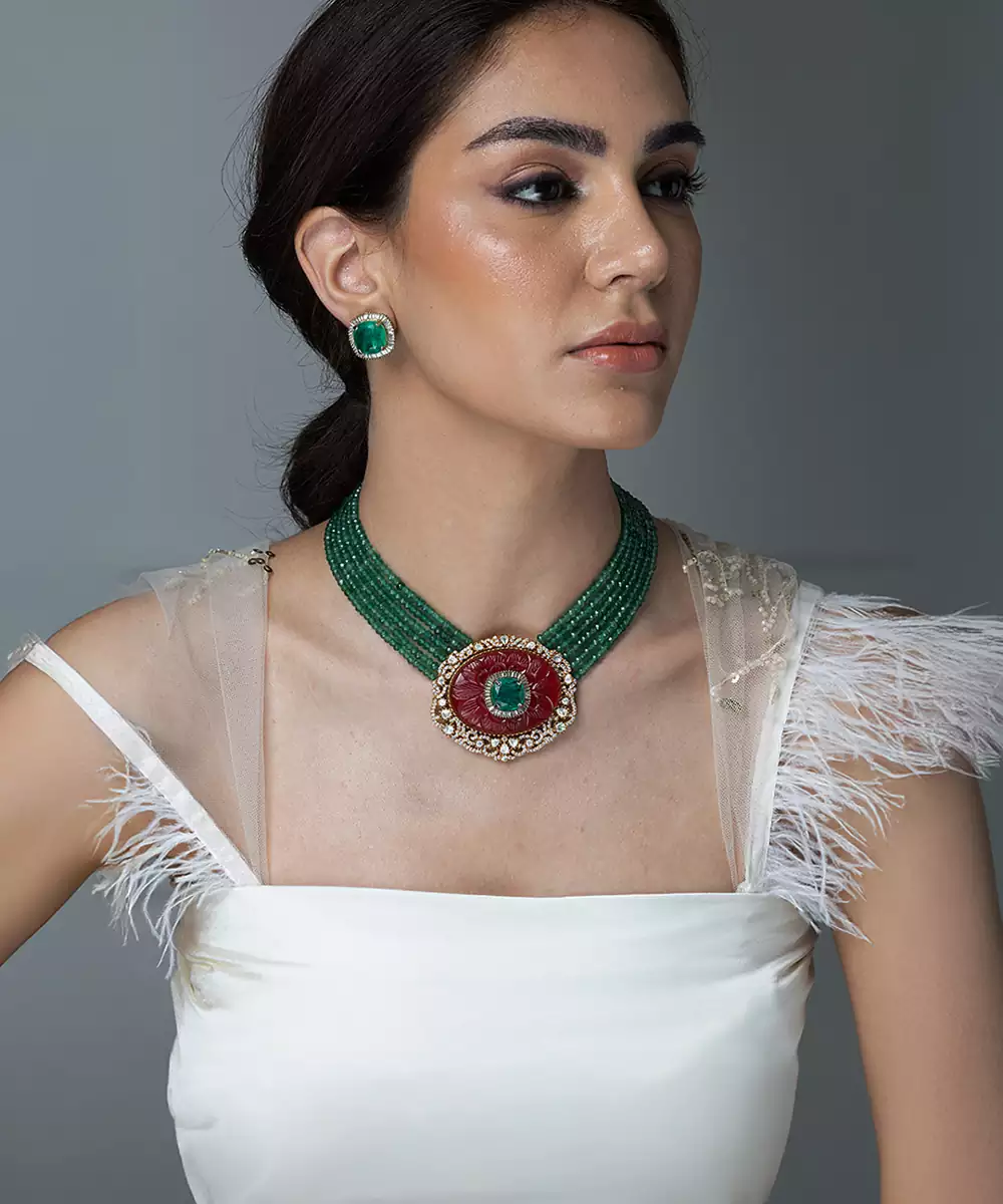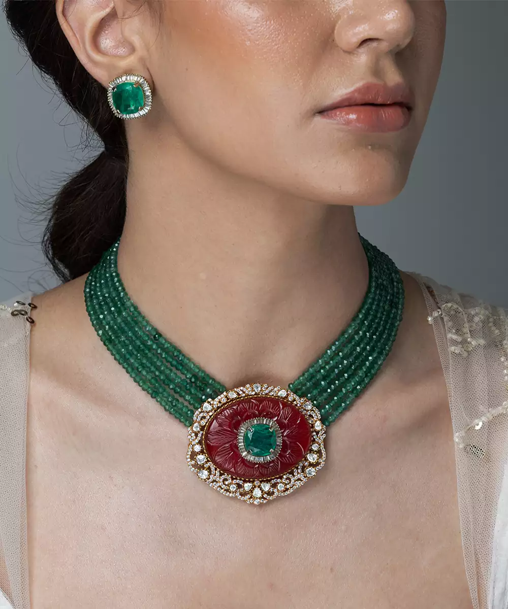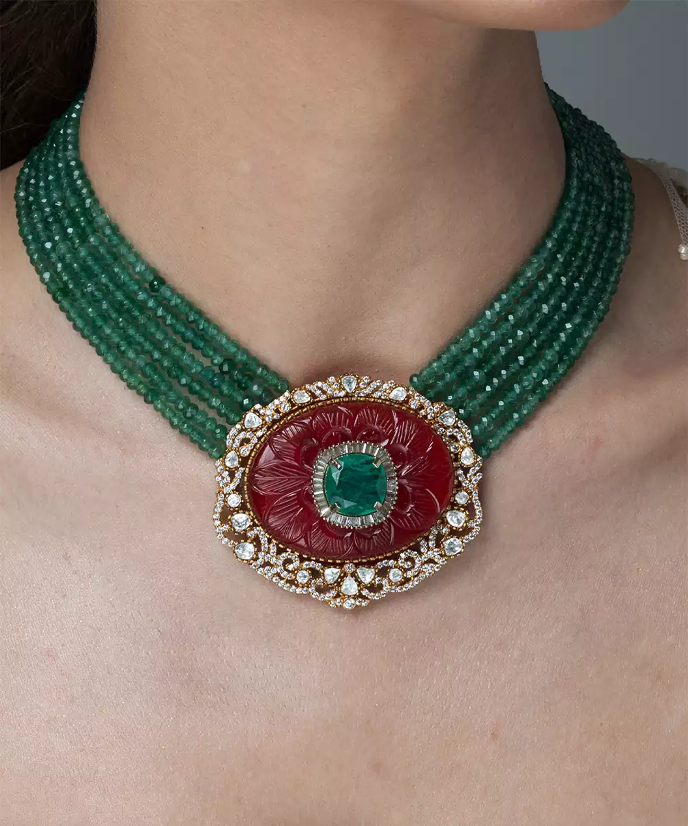 This Bold Shopjbr Necklace Features Vibrant Green Onyx Bead Strands Leading To A Statement Pendant. The Centerpiece Showcases A Carved Ruby Hued Oval And A Central Emerald Style Stone, Beautifully Bordered By Sparkling Settings.