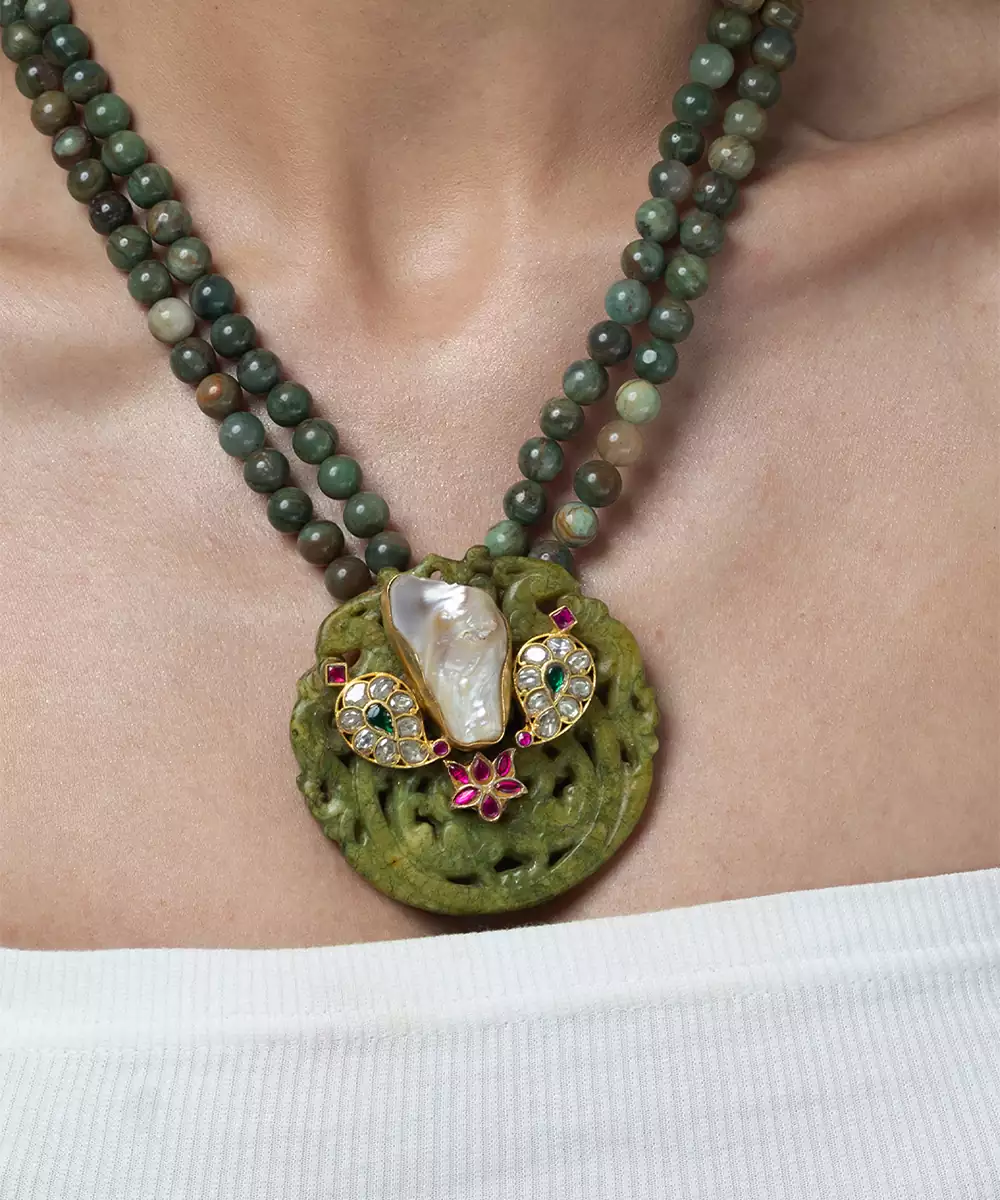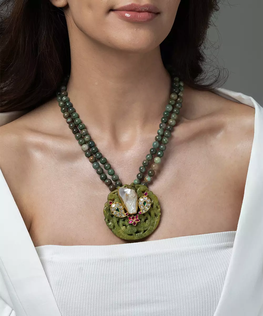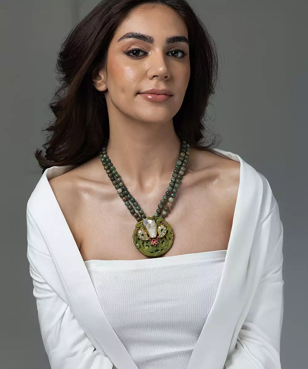 This Elegant Long Necklace Features A Double Strand Design In Soothing Green And Earthy Tones, Highlighted By A Beautifully Detailed Circular Pendant With Subtle Pink And White Accents.