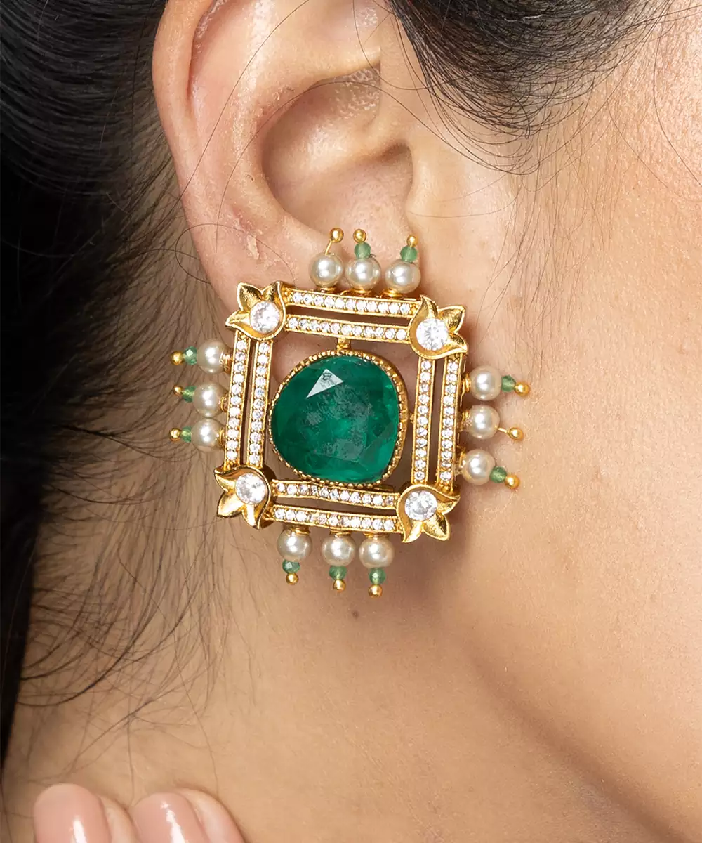 A Magnificent Stud Earring Featuring A Large, Rich Green Square Center Stone Framed By Sparkling Clear Accents And Small Pearl Drops. This Regal Piece Is Perfect For A Truly Special Gift.