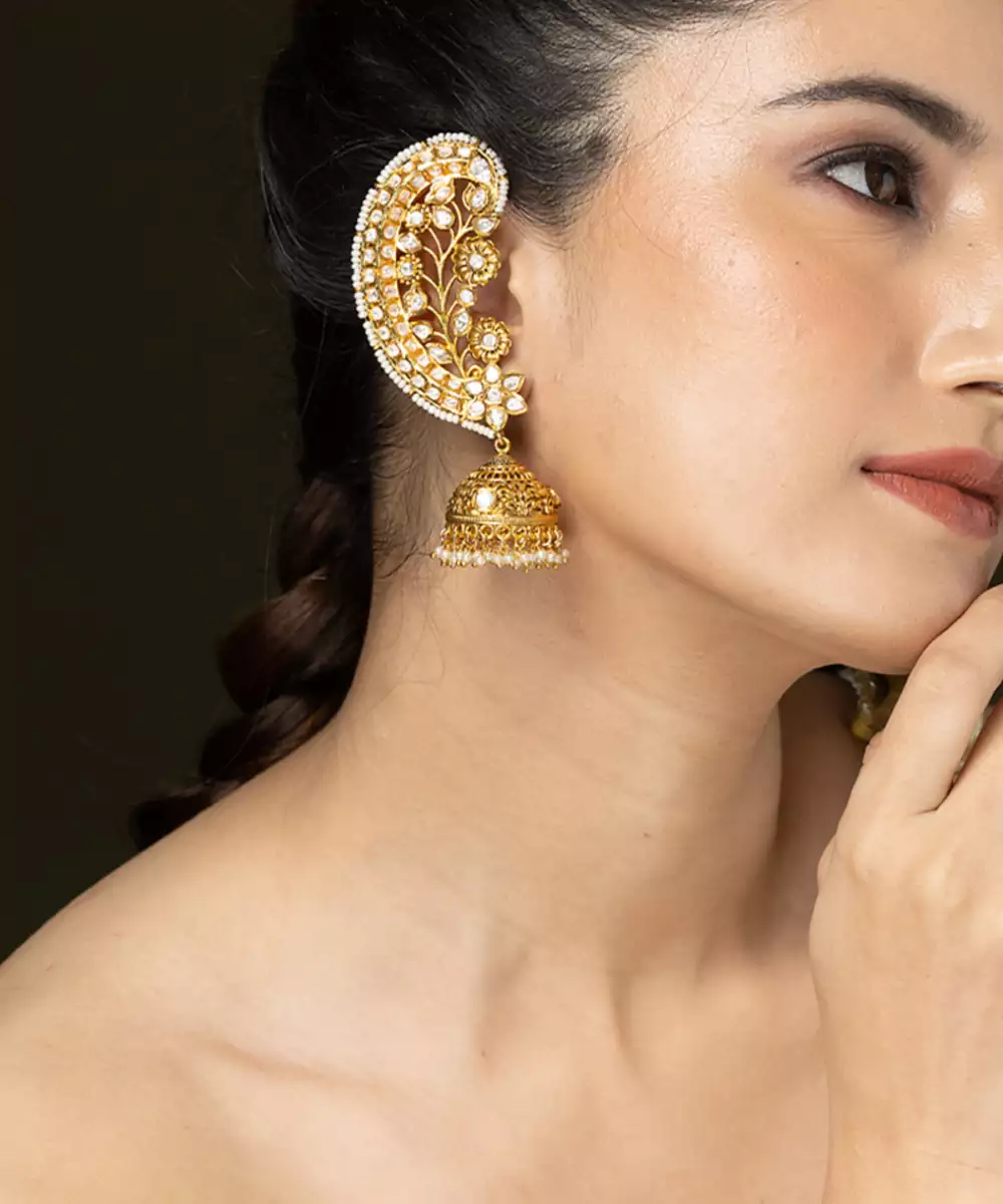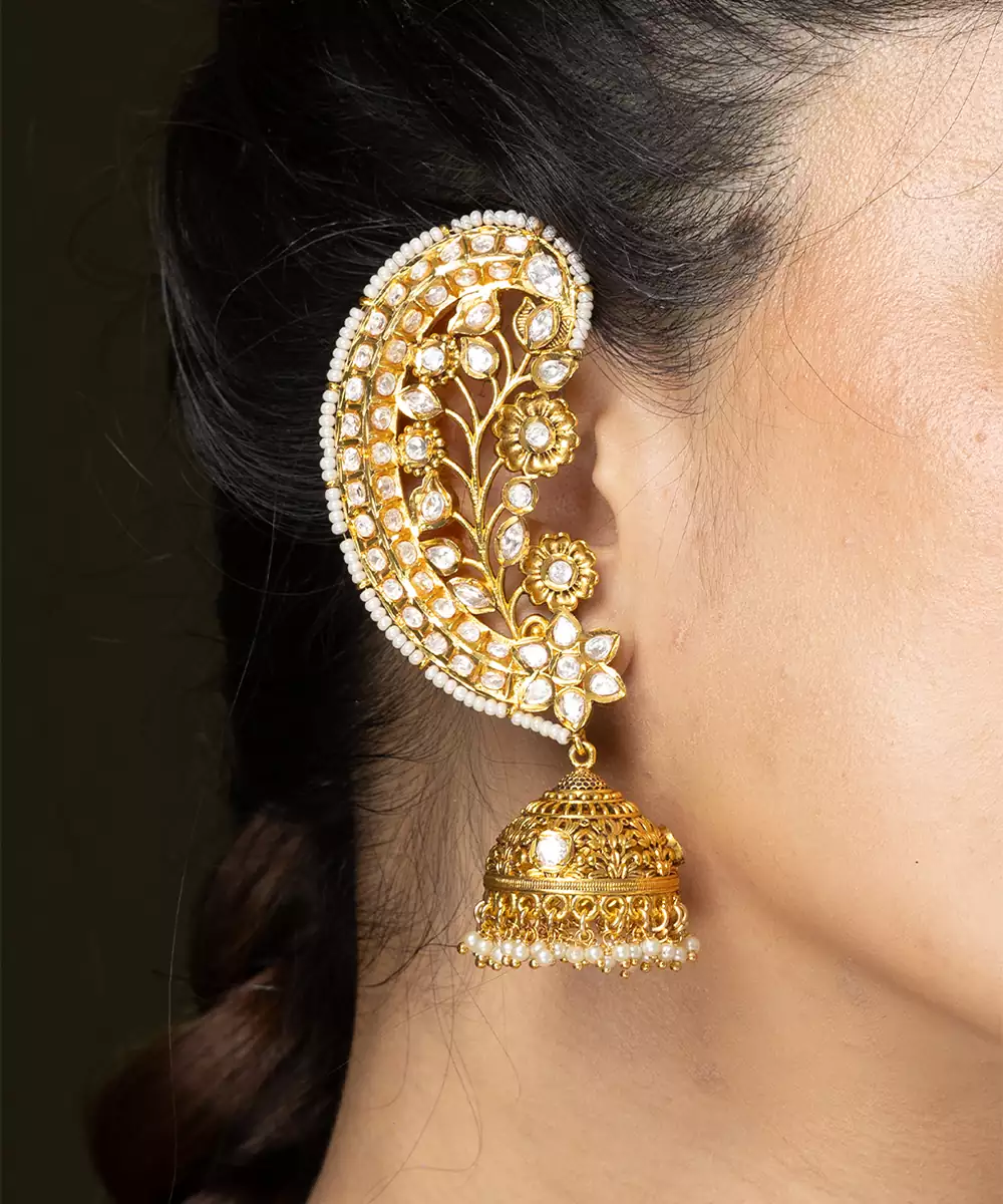 Exquisite Cuff Earrings Style Earrings Featuring A Large Paisley/Mango (Kairi) Motif Adorned With Seed Pearls And Floral Accents. The Piece Elegantly Culminates In An Intricately Crafted Gold Toned Jhumka Drop.