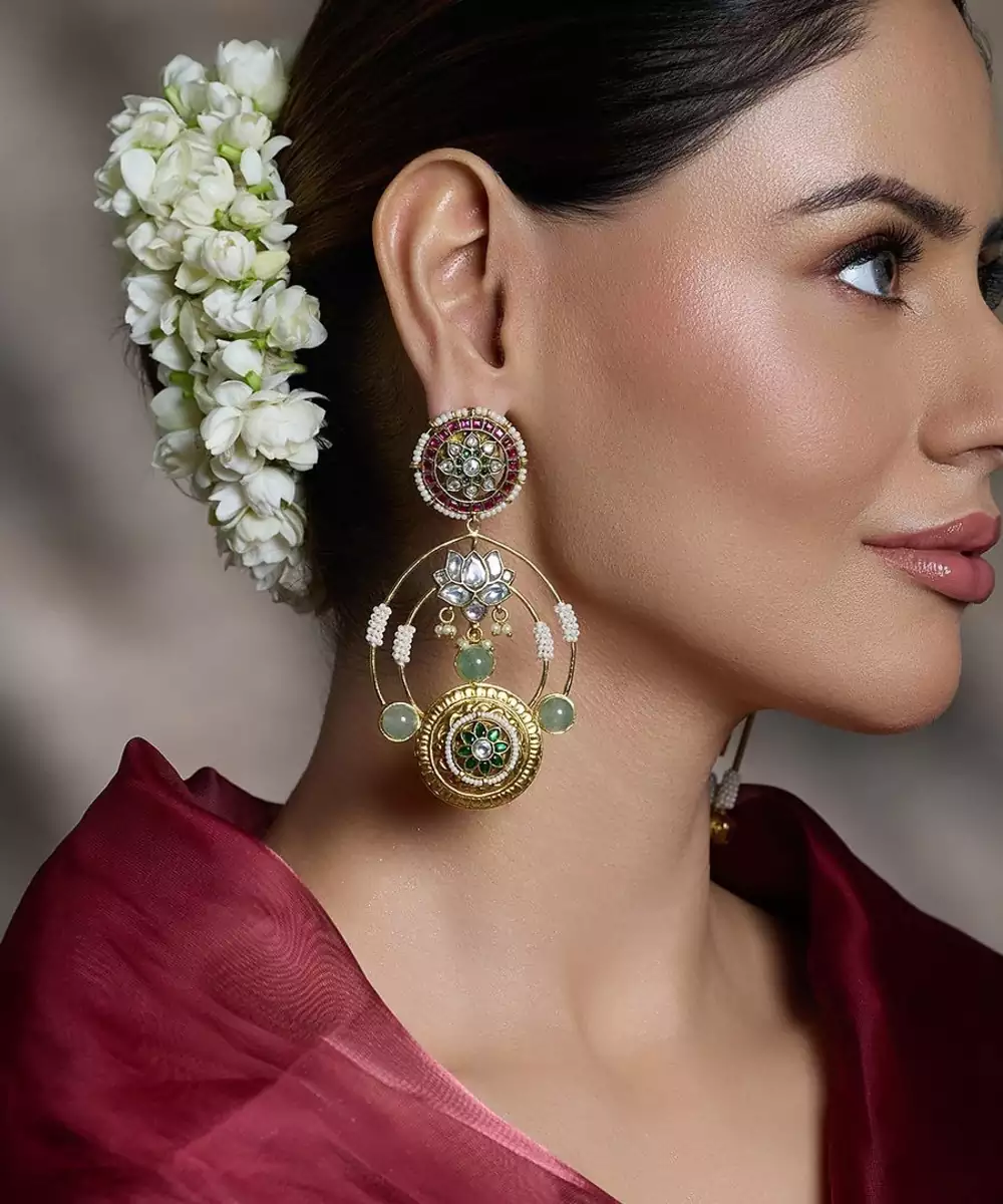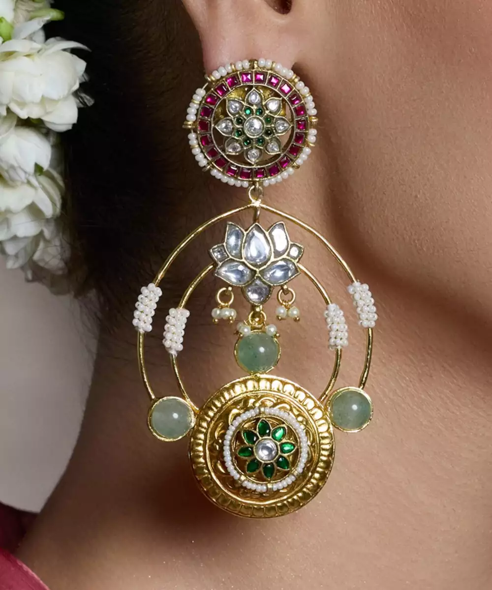 A Stunning Piece Of Traditional Craftsmanship, This Intricate Jadau Earring Dazzles With Pearls, Green Stones, And Gold Detailing.