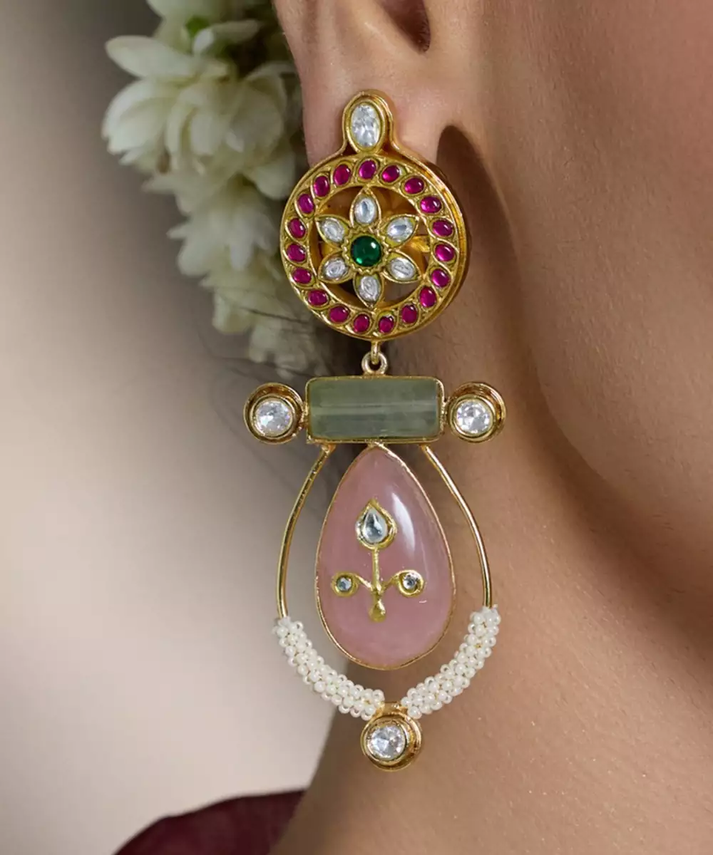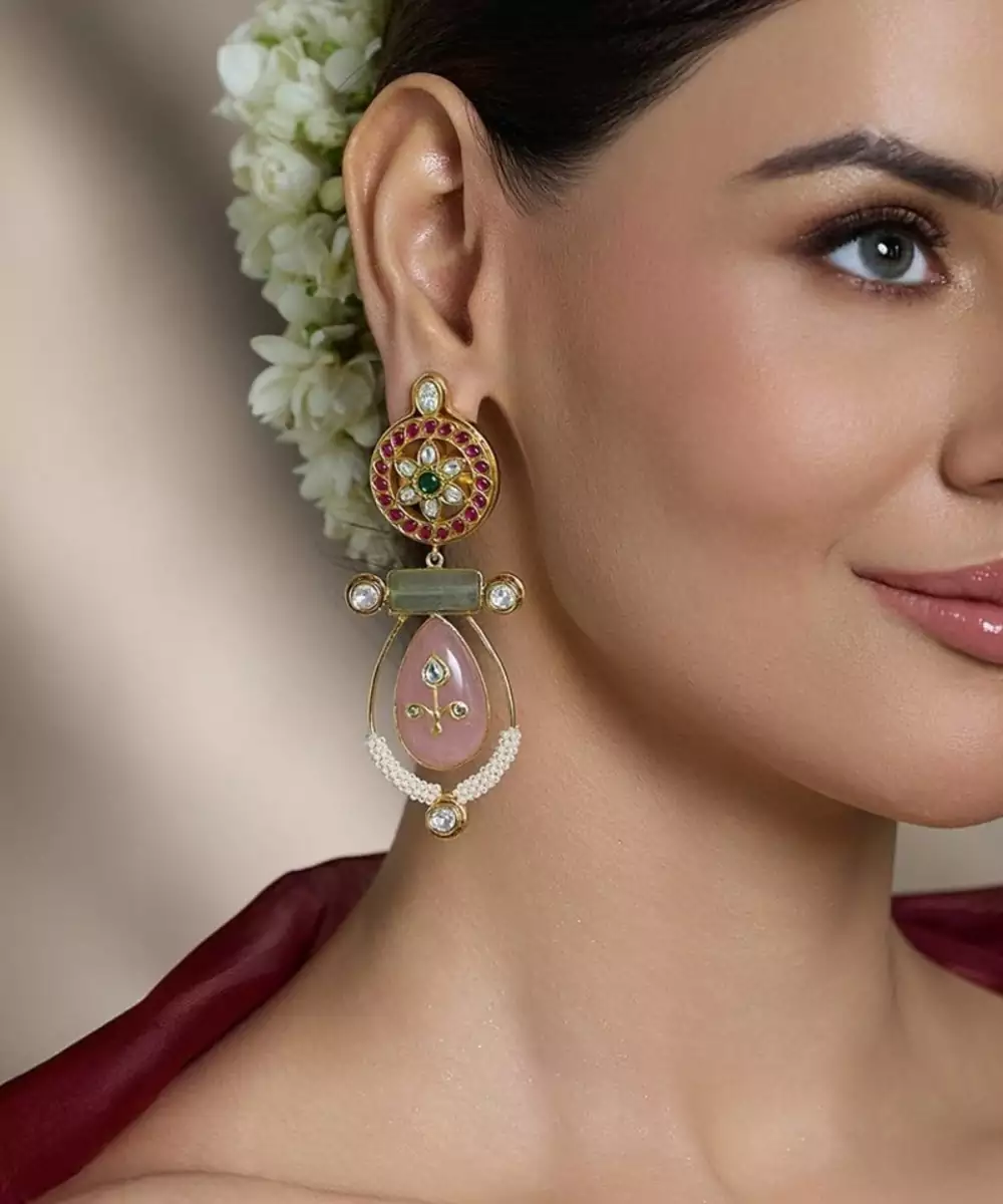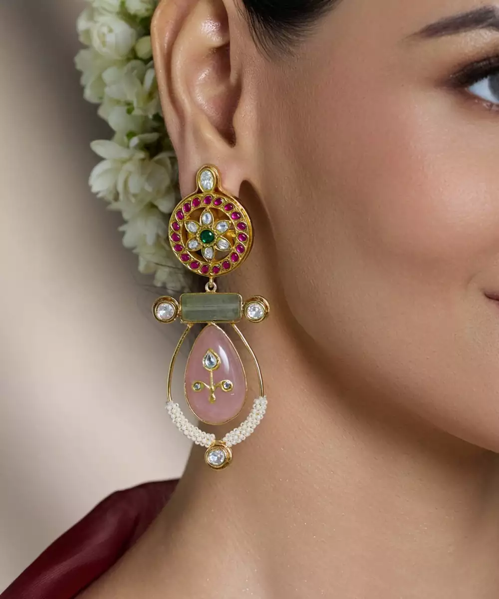 Exude Elegance With These Graceful Pink And Green Kundan Earrings, Featuring Teardrop Stones, Pearl Accents, And Intricate Craftsmanship. Perfect For Pastel Themed Outfits, Festive Occasions, Or Elegant Traditional Gatherings.