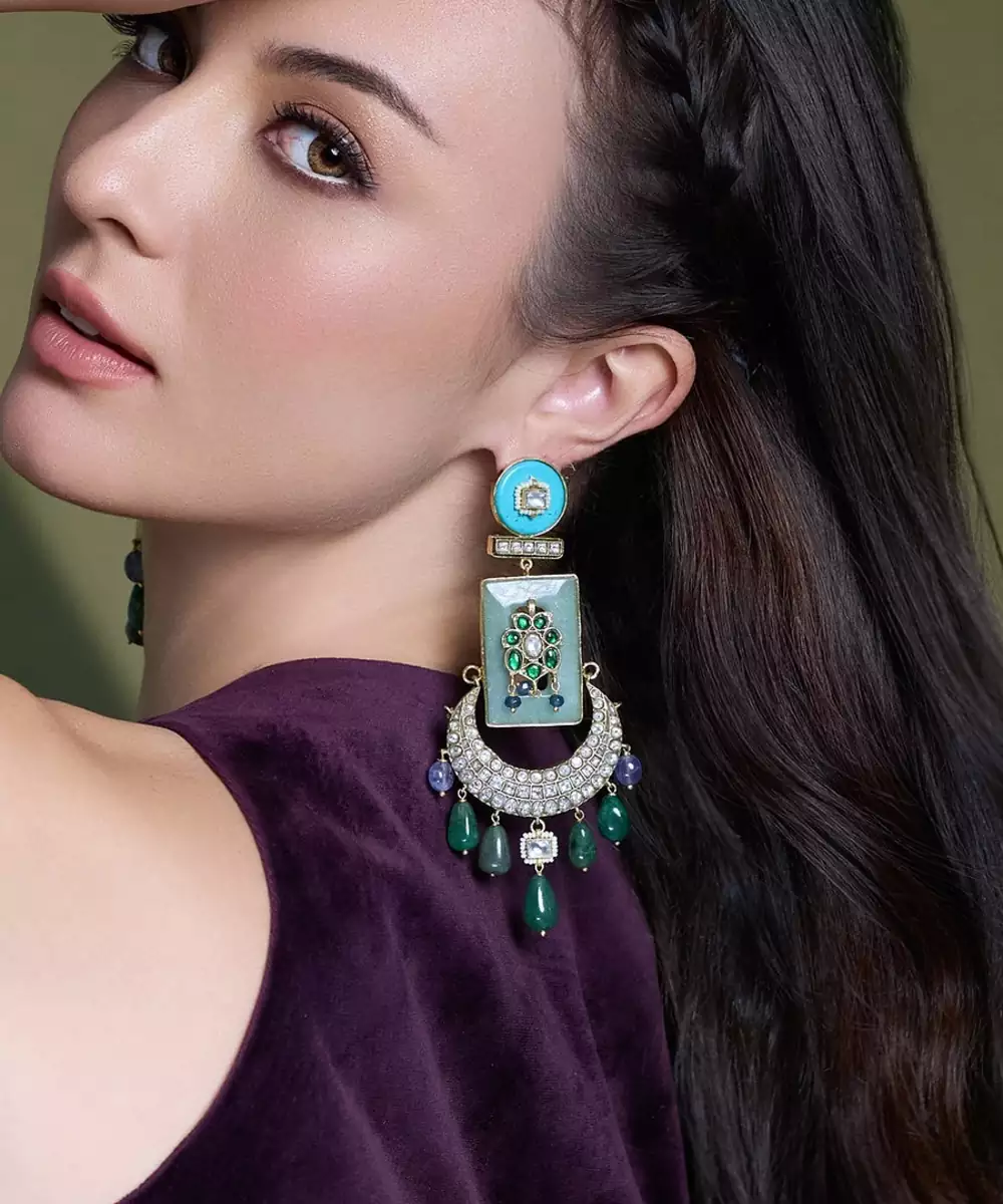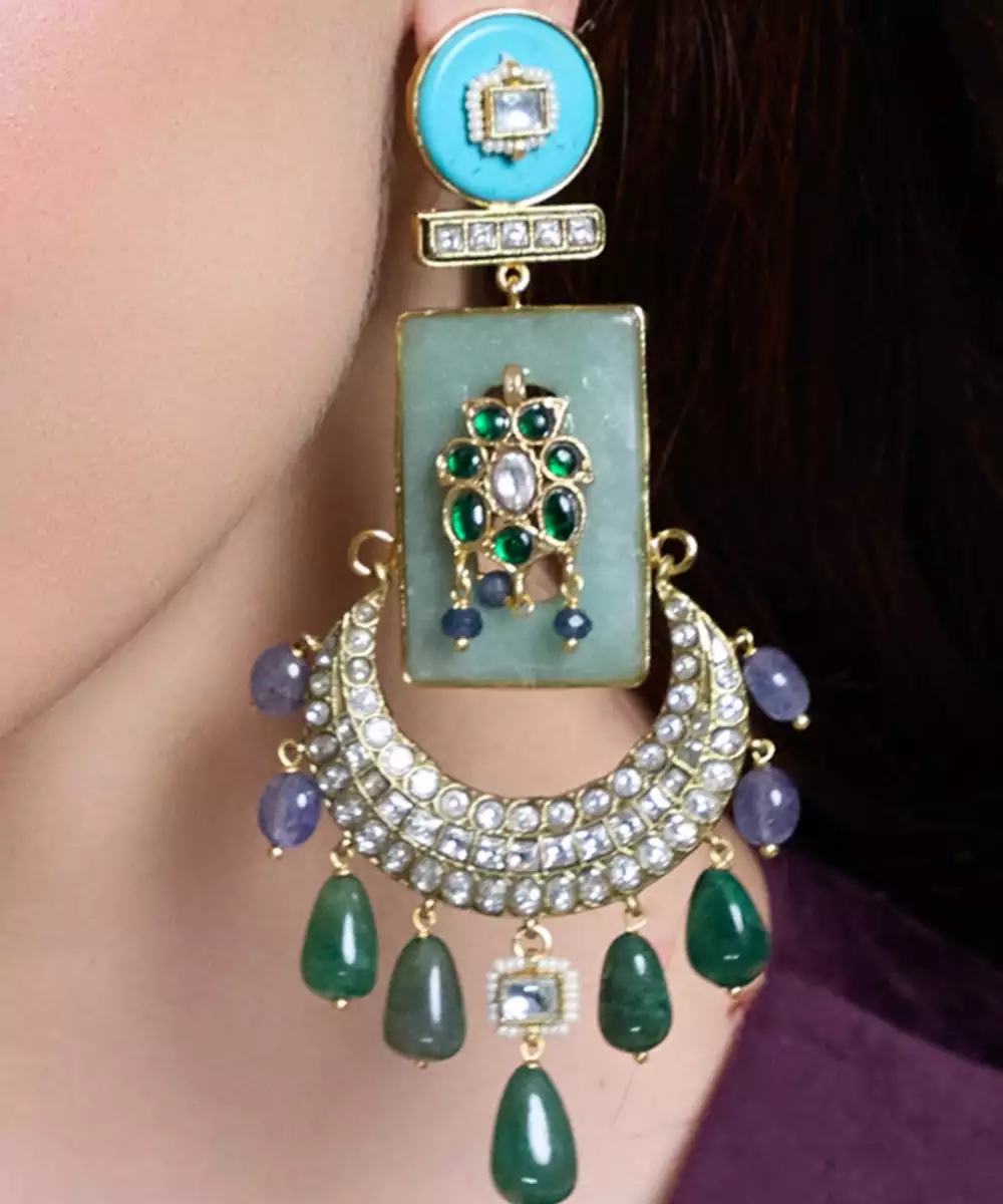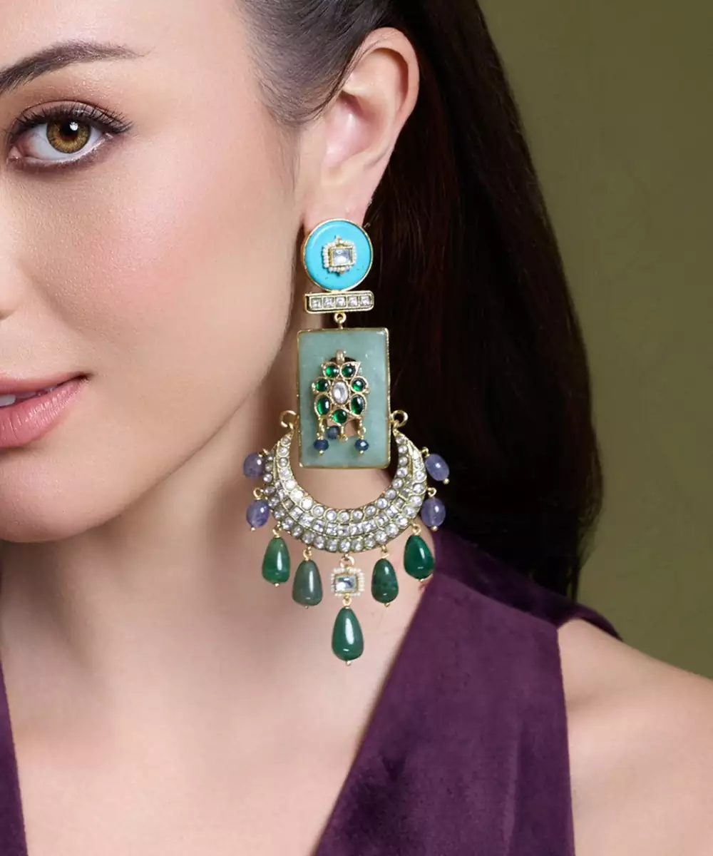 Embrace Elegance With Royal Radiance Meenakari Chandbalis Adorned With Turquoise Enamel, Green Drops, Kundan Stones, And Intricate Artwork.