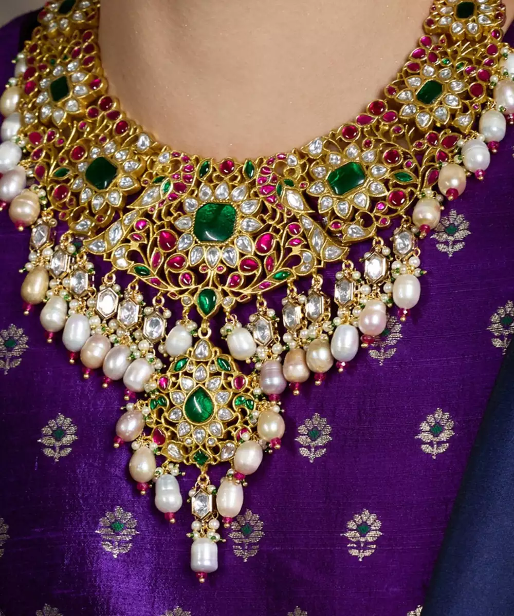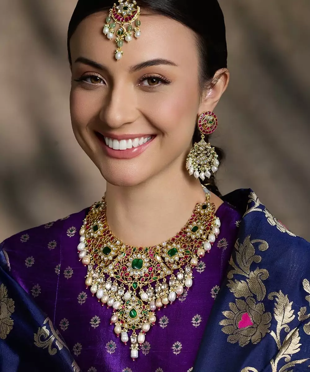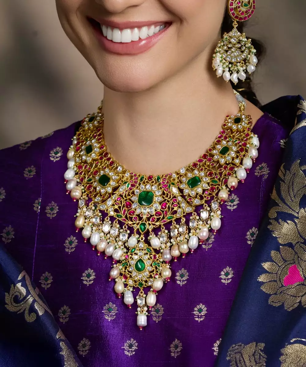 Luxurious Gold Finish Necklace Adorned With Polki Stones And Emerald Accents. Its Grand Design Makes It Perfect For Bridal Wear, Exuding Timeless Elegance And Regal Charm For Special Occasions. Add Matching Maang Tikka To Complete The Look