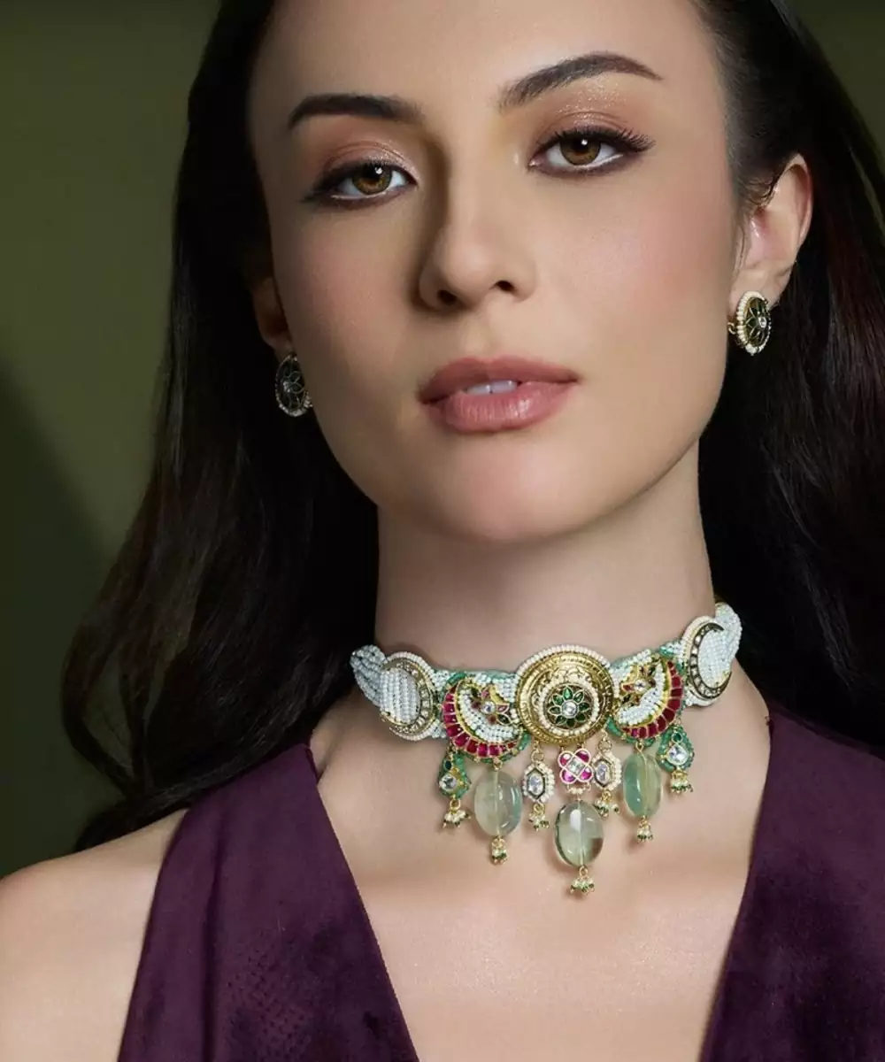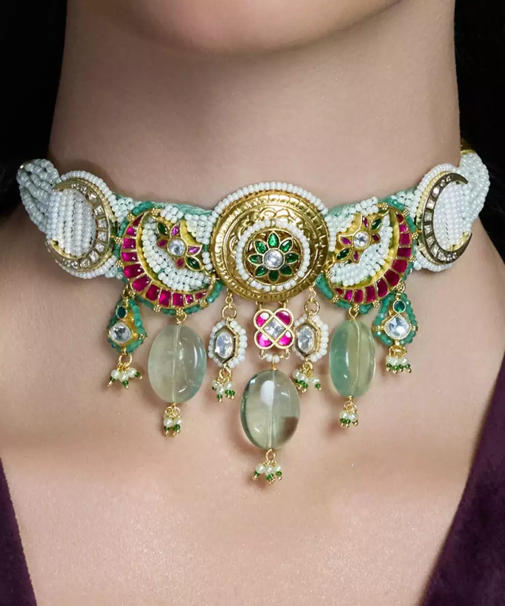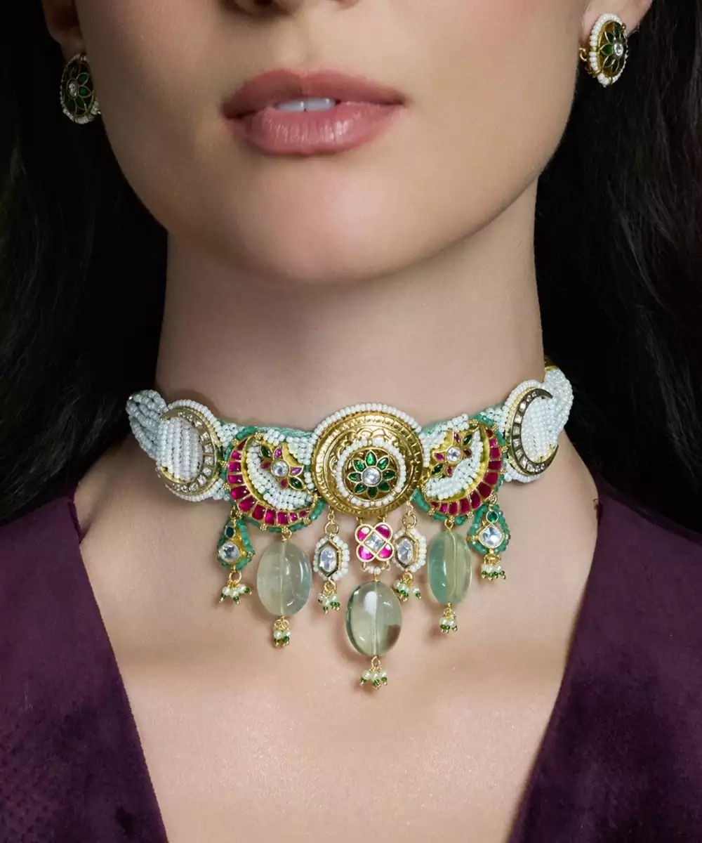 Elegant Necklace With Green Thread Tie Up, Adorned With Kundan Work, Pastel Drops, And A Floral Centrepiece. Includes Matching Studs. Ideal For Festive Or Semi Bridal Wear With Ethnic Outfits.