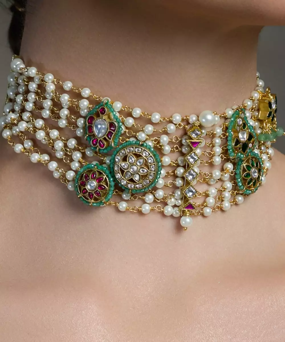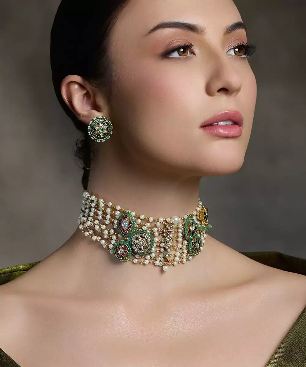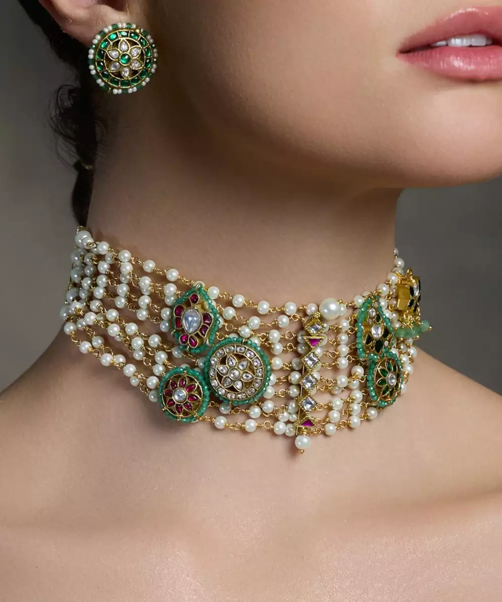 A Stunning Pearl Choker With Intricate Green Gold Accents And Matching Earrings—Crafted To Exude Royal Elegance For Weddings, Festivities, And Grand Celebrations.