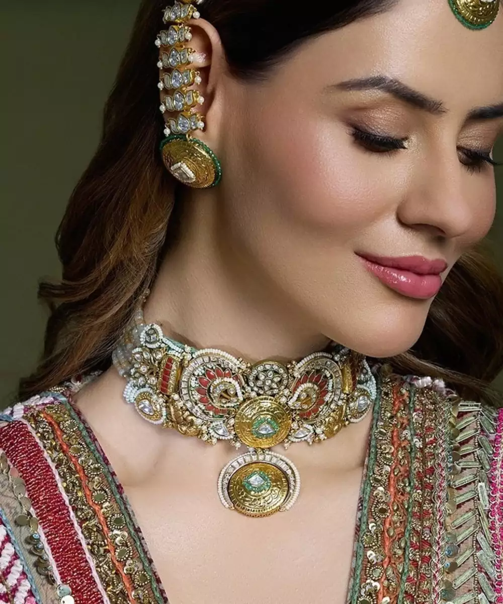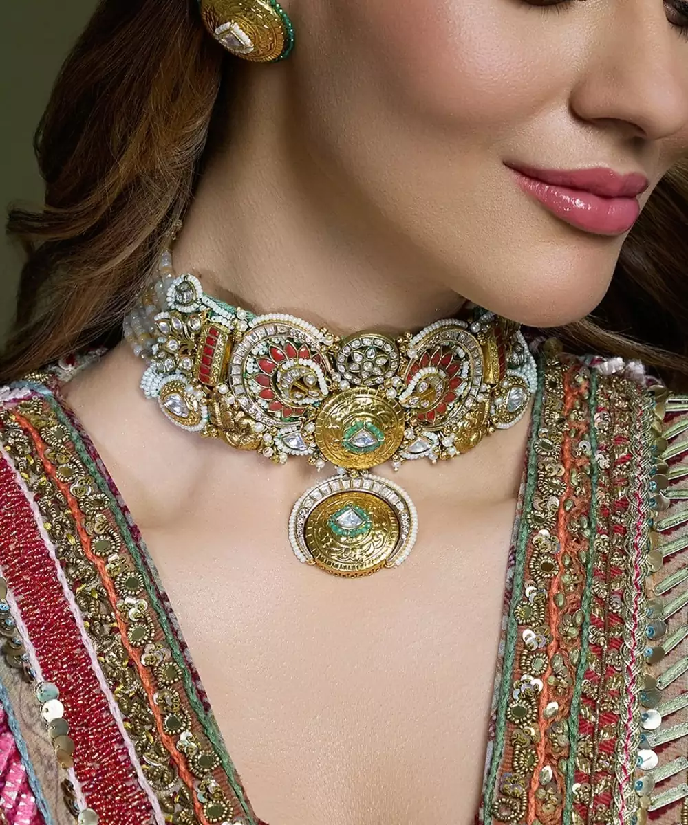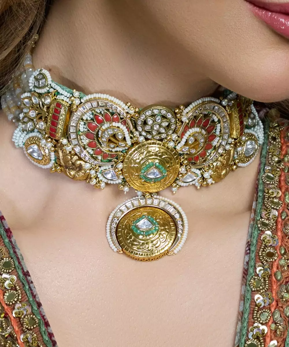 This Amazing Necklace Radiates Old World Elegance With Its Blend Of Circular And Teardrop Motifs In Gold And Silver Tones. Ideal For Pairing With Silk Saris Or Vintage Bridal Wear, This Piece Whispers Tales Of Timeless Beauty And Ancestral Grace. Add Matching Earrings & Accessories To Complete The Look.