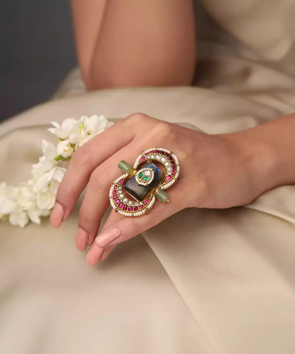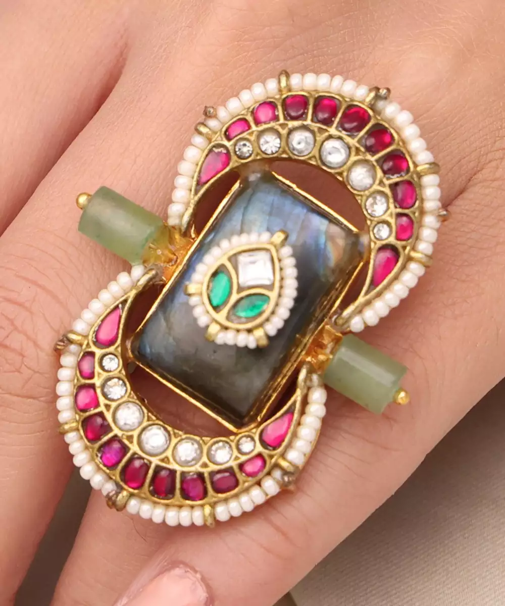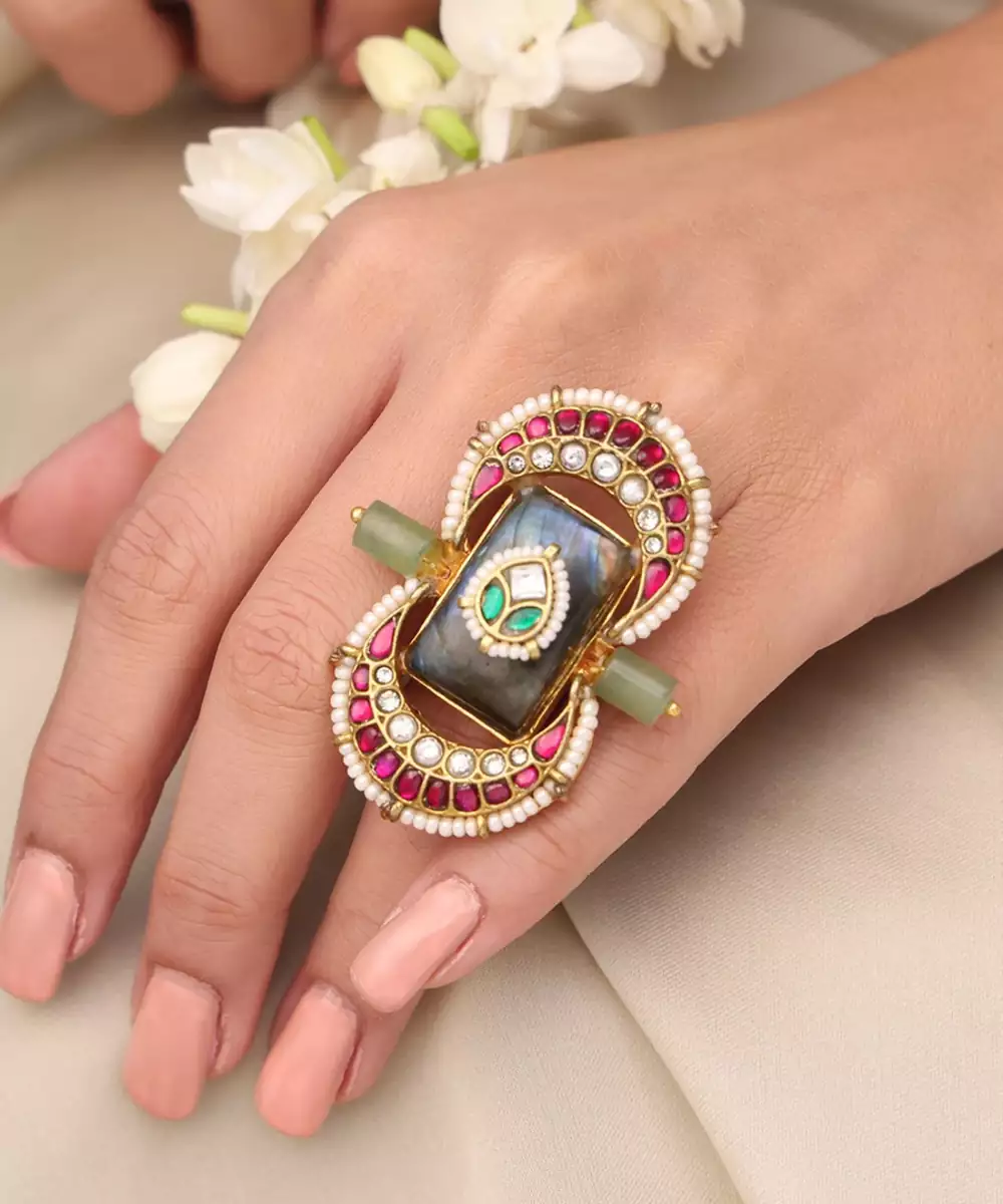 Our Meenakari Green Royale Ring Highlights Traditional Enamel Artistry With Green Gemstones. Its Timeless Design Makes It Perfect For Festive Events, Weddings, Or Cultural Occasions, Radiating Regal Heritage Charm.