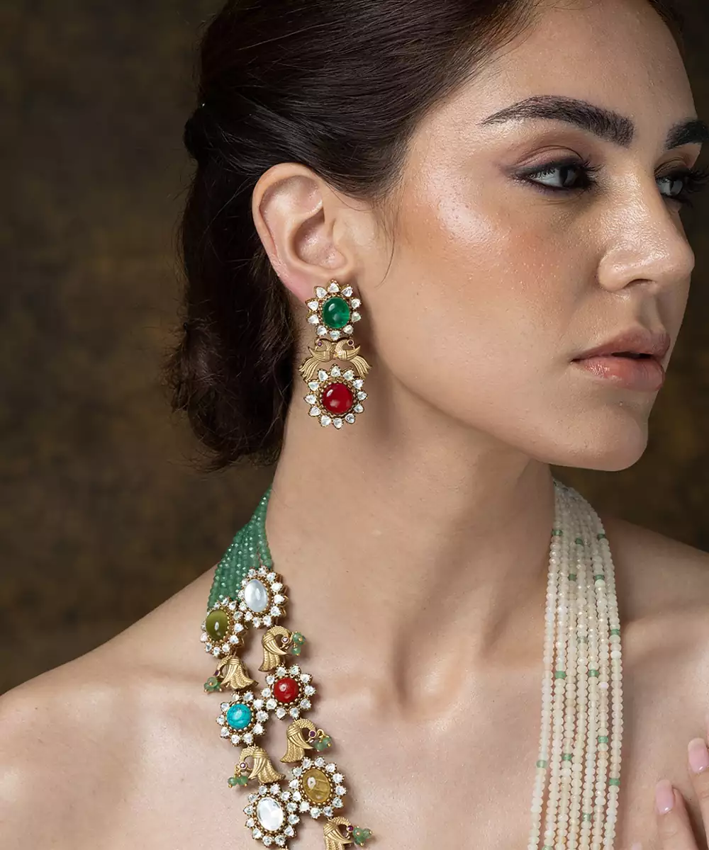 This Exquisite Necklace Set Features Multiple Strands Of Luminous Tiny Pearls Meeting A Side Clasp Accented With Vibrant, Multi Colored Large Stones. A Beautifully Unique Piece, Perfect For Gifting Occasions.