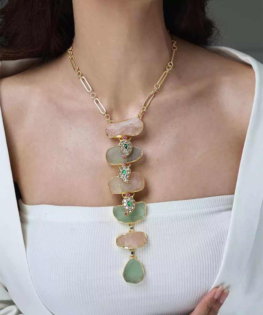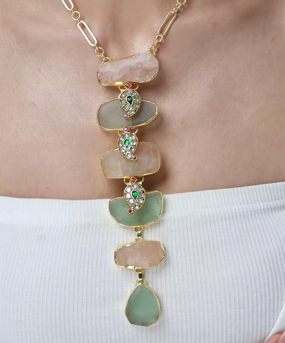 This Opulent Shopjbr Long Necklace Features A Dense Cluster Of Rose Quartz And Emerald Hued Stones Set In Style Frames. The Lavish Design Is Completed With Tiny Pearl Drops, Creating A Stunning Centrepiece For Your Wedding Attire.