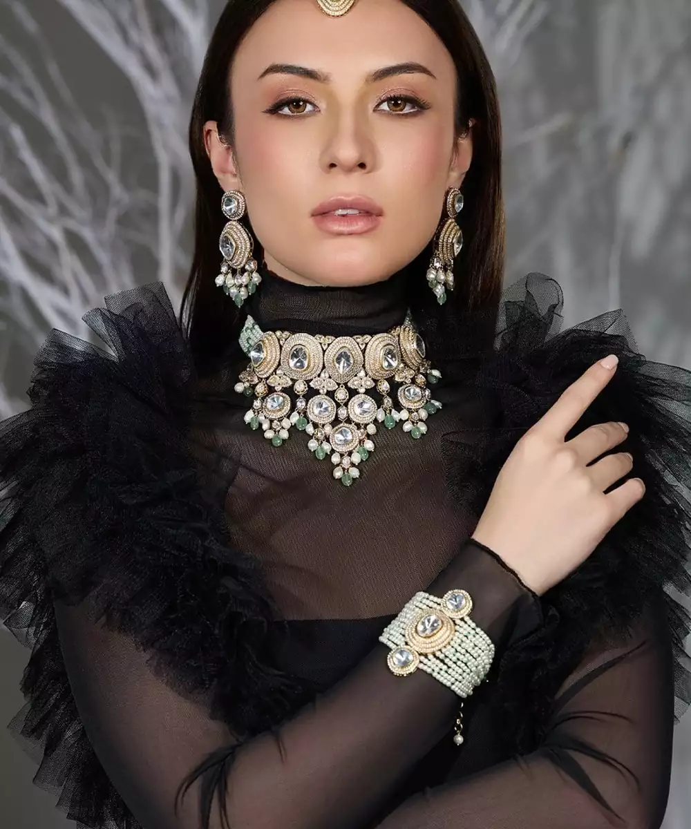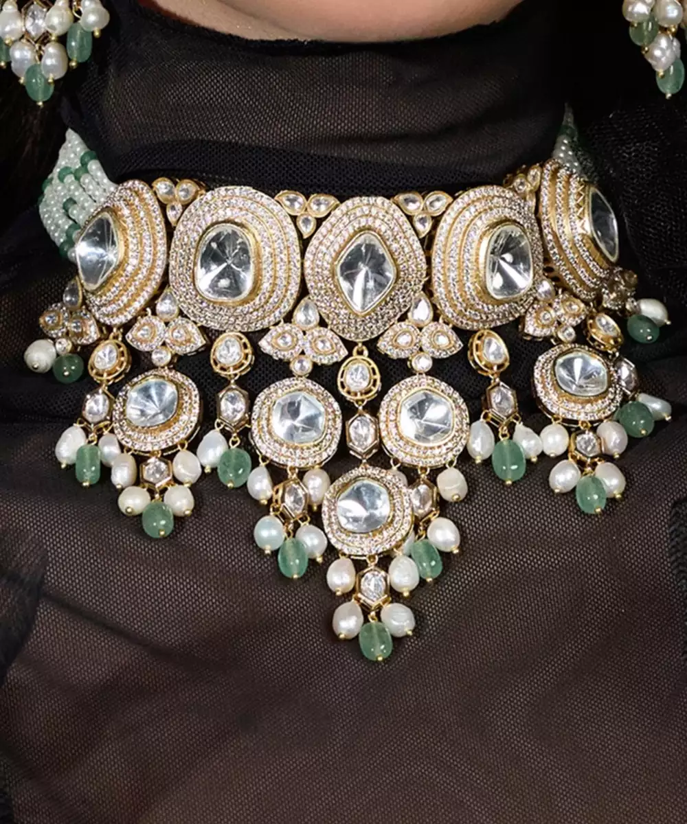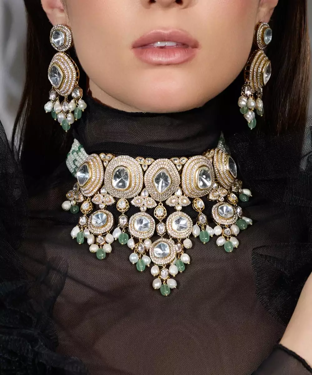 Delicate And Dazzling, The Pastel Colored Necklace Set Features Crystal Clear Stones And Light Green Accents. Perfect For Adding A Graceful, Ethereal Charm To Weddings, Sangeet Nights, Or Festive Evenings.
