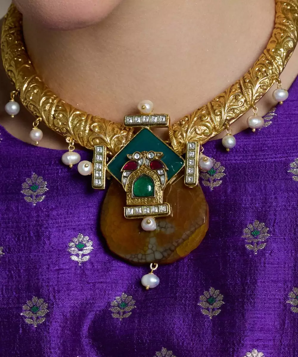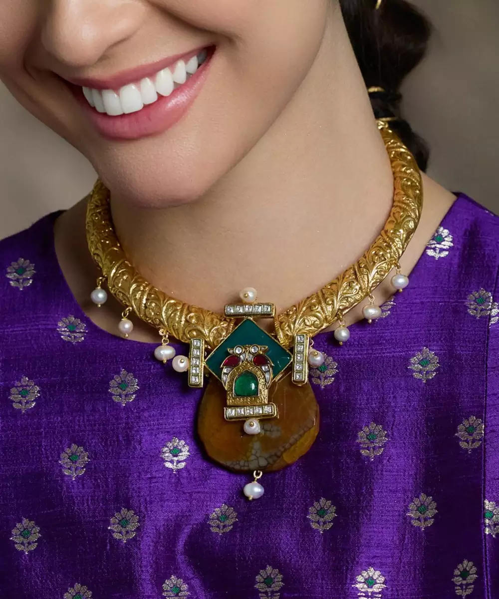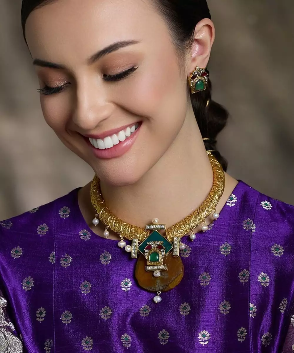 Adorned With Pearls And Rich Hues, This Majestic Necklace Pairs Golden Textures With Bold Design—An Exquisite Piece For Grand Celebrations And Royal Inspired Style.