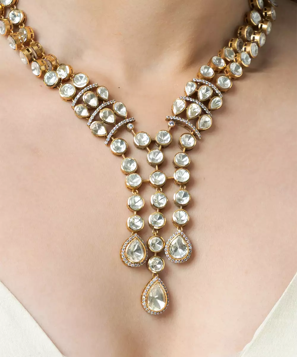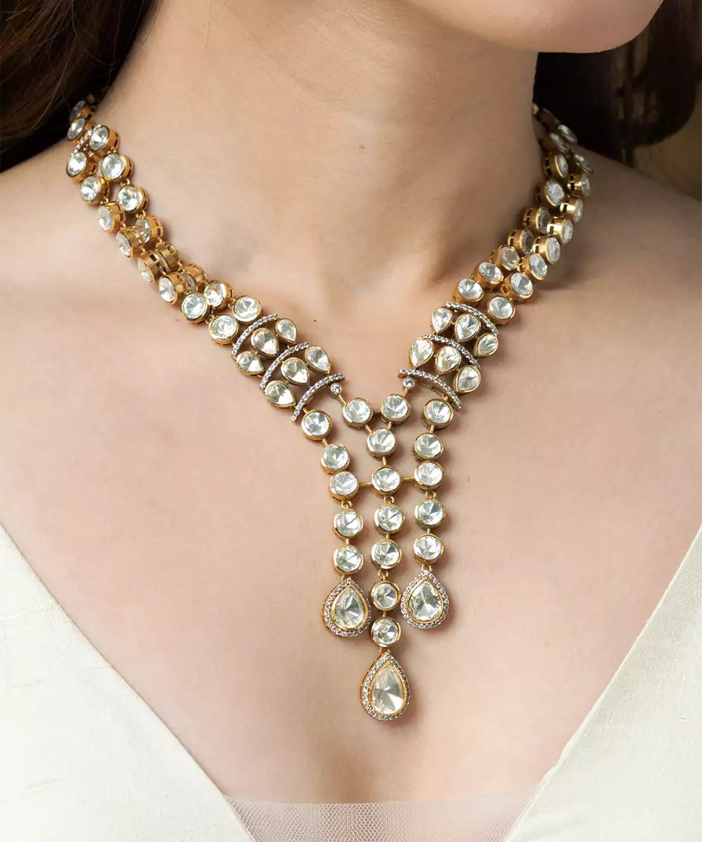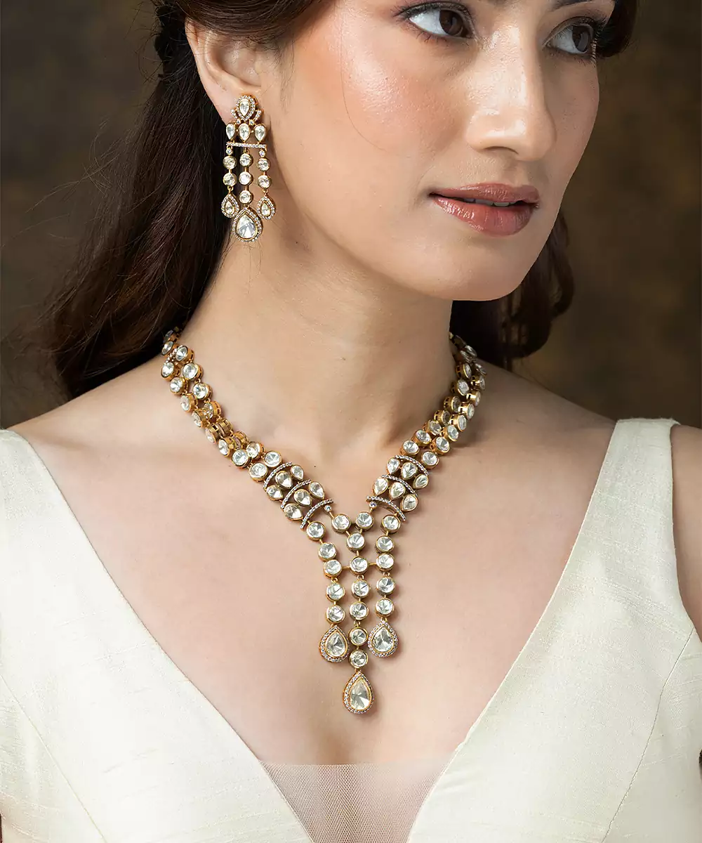 This Elegant Necklace Set Features Multiple Flowing Strands Of Luminous Small Pearls That Converge Into Dangling Pearl Clusters At The Center. Its Subtle Grace Makes It A Timeless And Perfect Choice For Gifting.