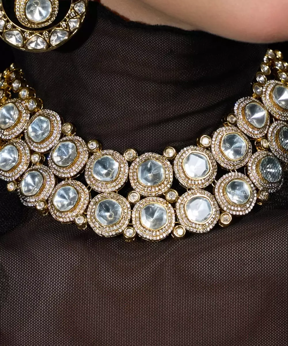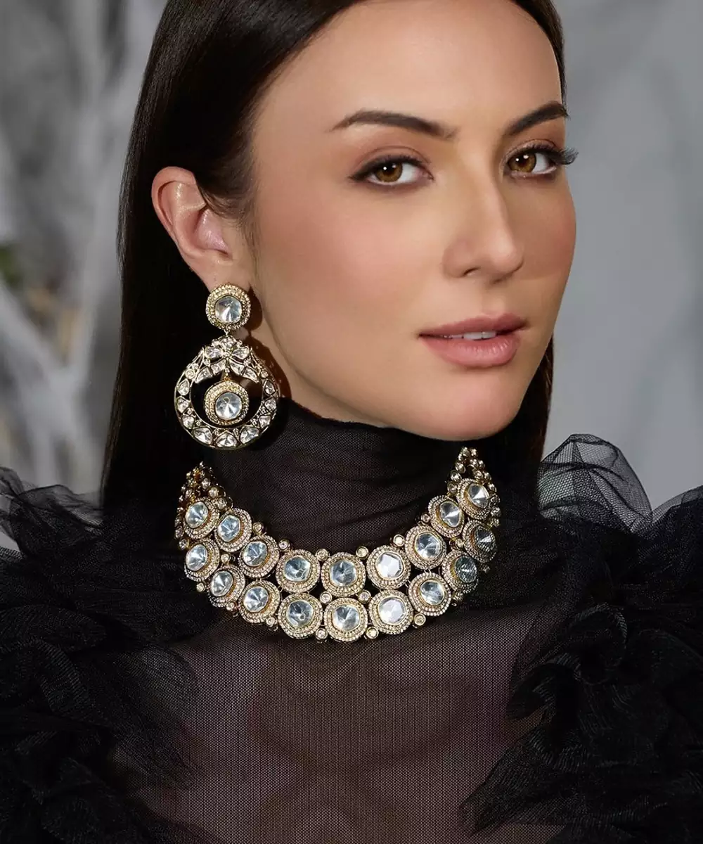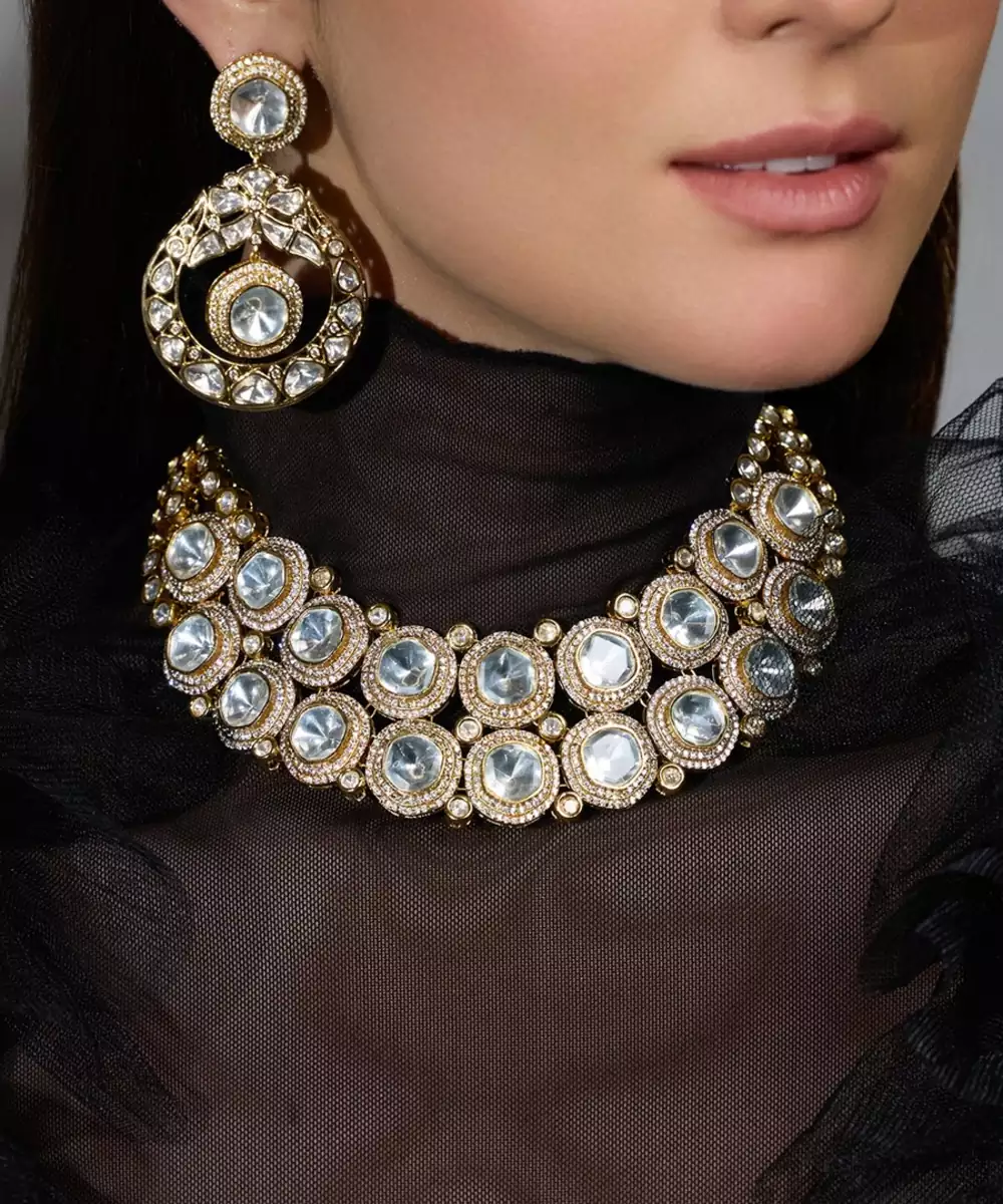 Elegant Gold Finish Choker Necklace Set Embellished With Sparkling Kundan Stones And A Matching Maang Tikka. Ideal For Weddings And Festive Events, Adding A Touch Of Refined Traditional Glamour. Add Matching Earrings & Accessories To Complete The Look.