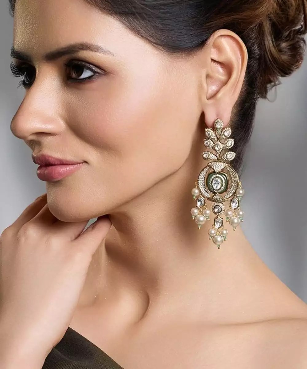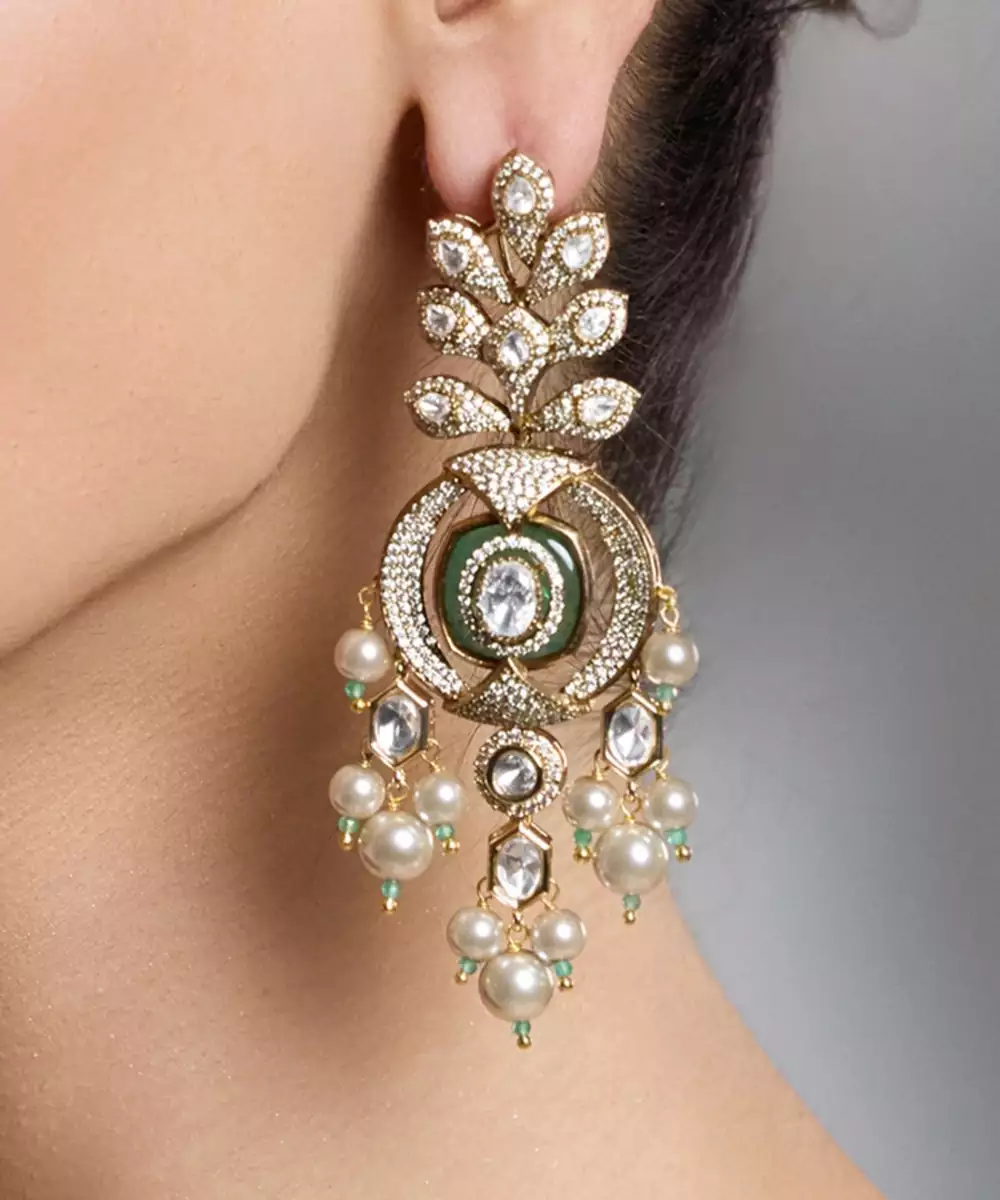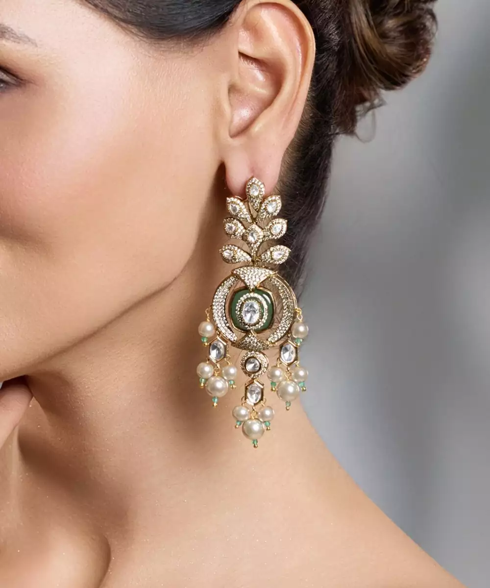 Add Royal Charm To Your Look With Pearl Cascade Polki Earrings Featuring Intricate Detailing, Uncut Stones, And Delicate Pearl Drops For A Perfect Blend Of Tradition And Elegance.