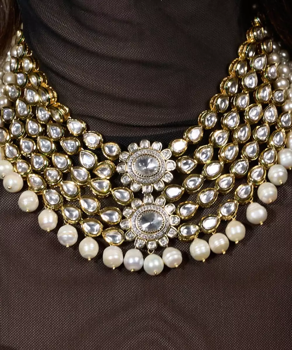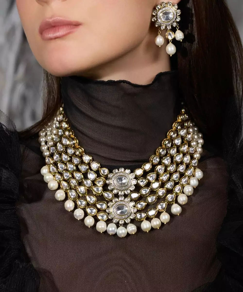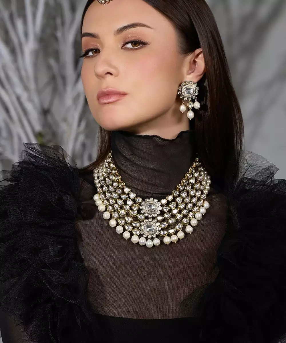 Radiate Star Like Glow With This Multi Layered Pearl And Gold Toned Necklace Set, Complete With Matching Earrings—Crafted To Elevate Your Elegance With Bold, Graceful Sophistication.