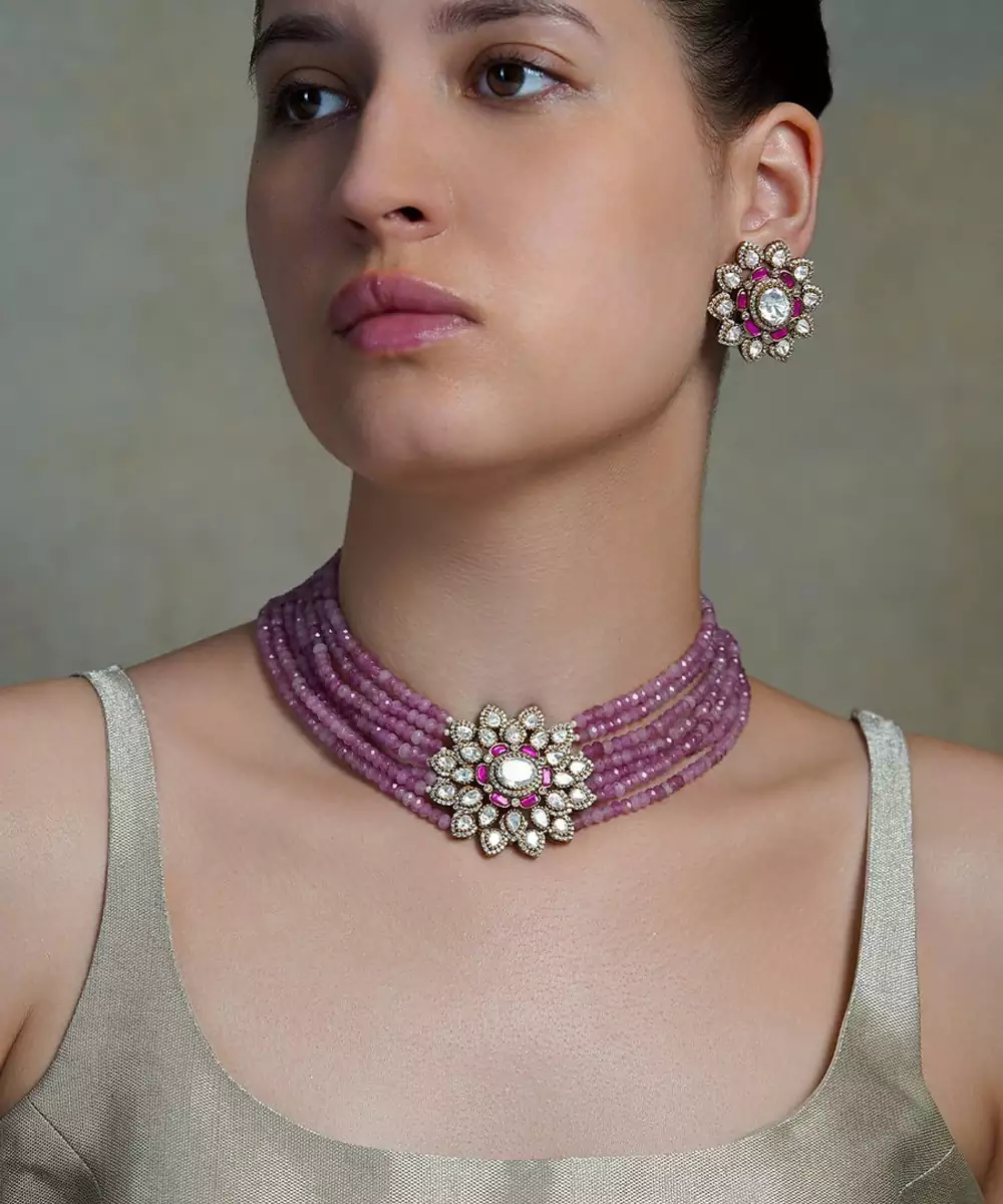 Turn Heads With The Lilac Glow Floral Choker Set—A Stunning Choker Set Featuring Lilac Toned Florals And Shimmering Accents For A Dreamy, Elegant Look. Color: Pink Material: Gold Plated Components: 1 Necklace / 1 Pair Earring