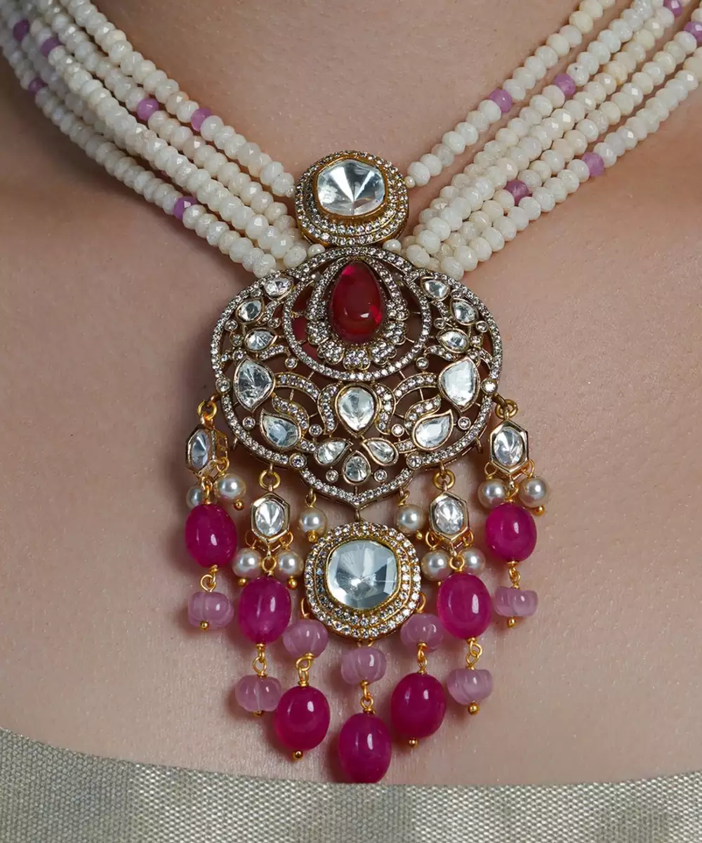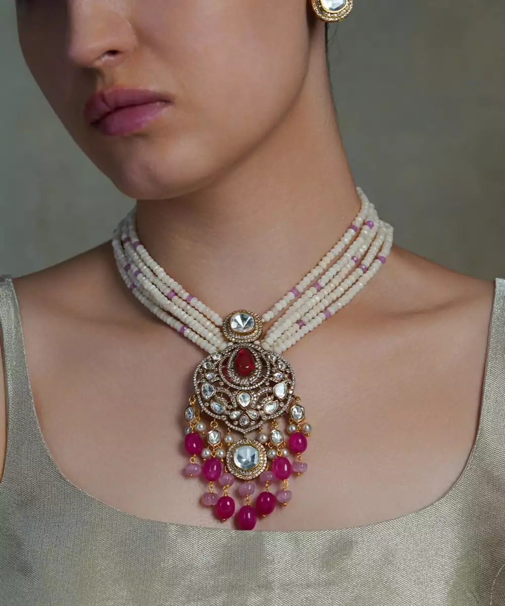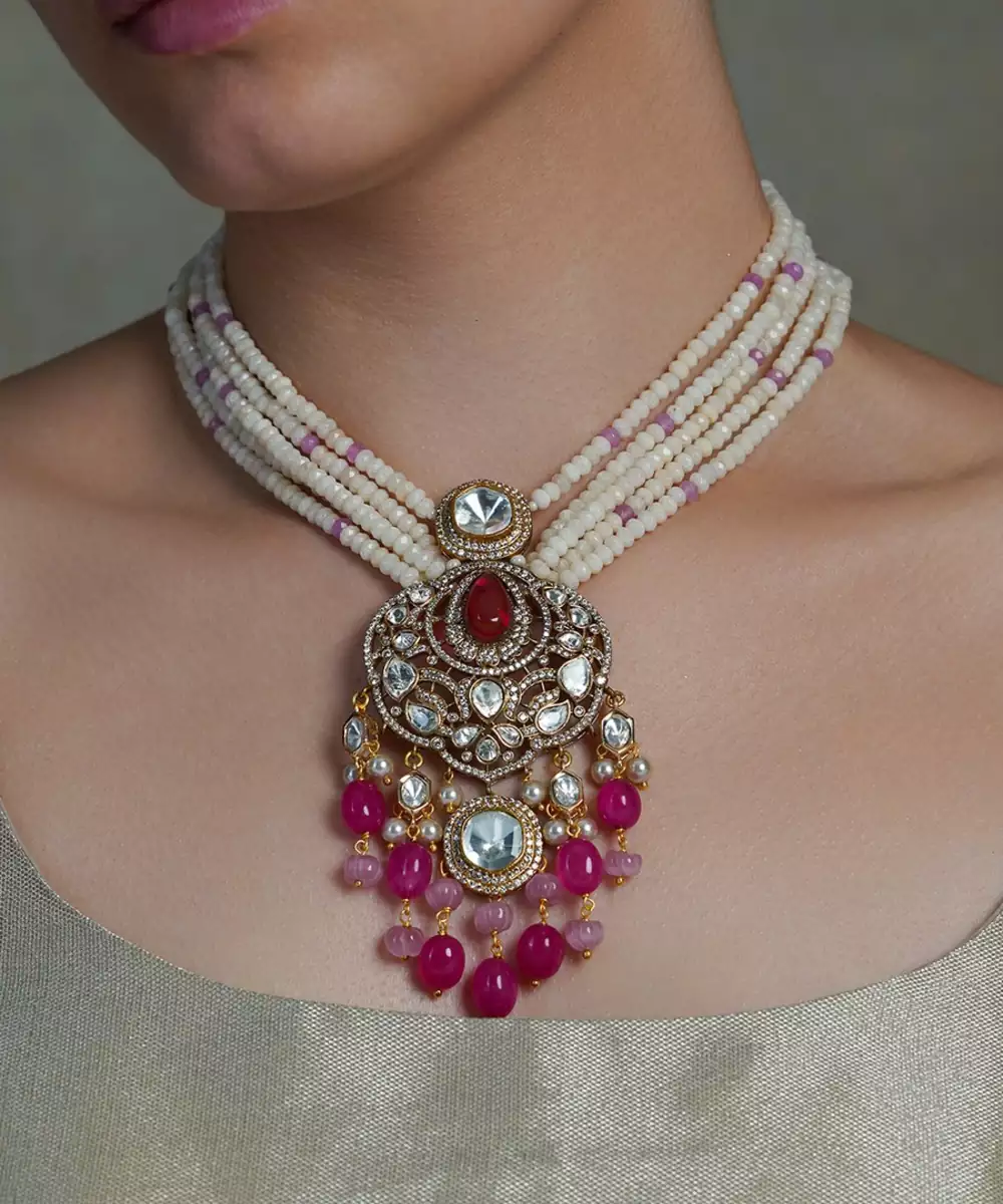 Experience Traditional Grandeur With The Rubypearla Cascade Rani Haar Set, Showcasing Cascading Ruby Hued Beads And Radiant Pearls In A Majestic Design.