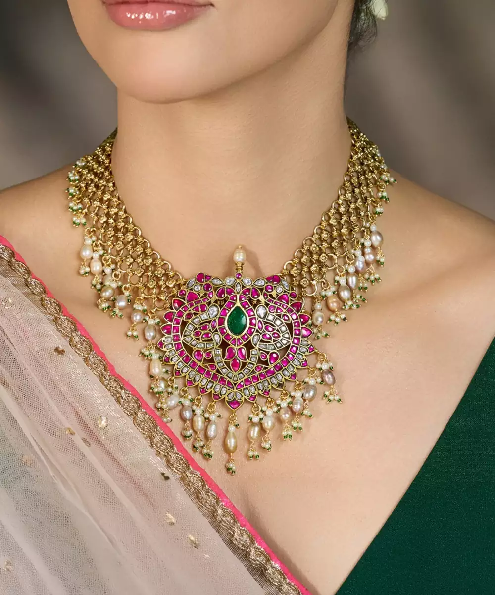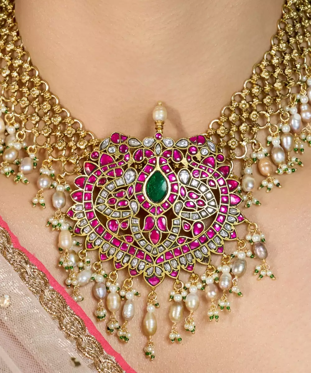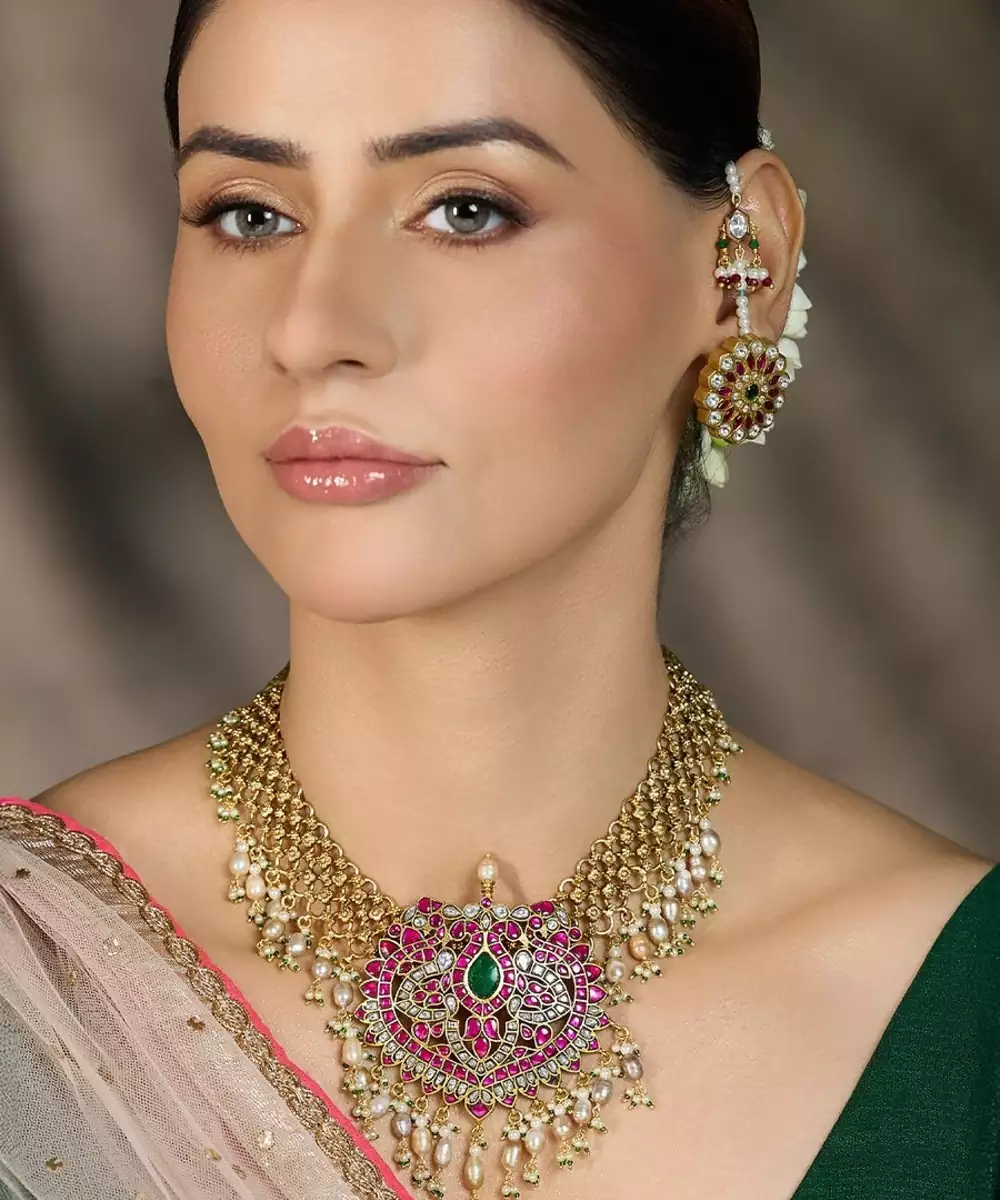 This Exquisite Gold Toned Necklace Features A Cascading Fringe Design With A Radiant Heart Centerpiece Adorned In Red And Green Stones, Adding Regal Charm And Festive Brilliance To Any Traditional Ensemble. Perfect For Grand Occasions. Add Matching Earrings & Accessories To Complete The Look.