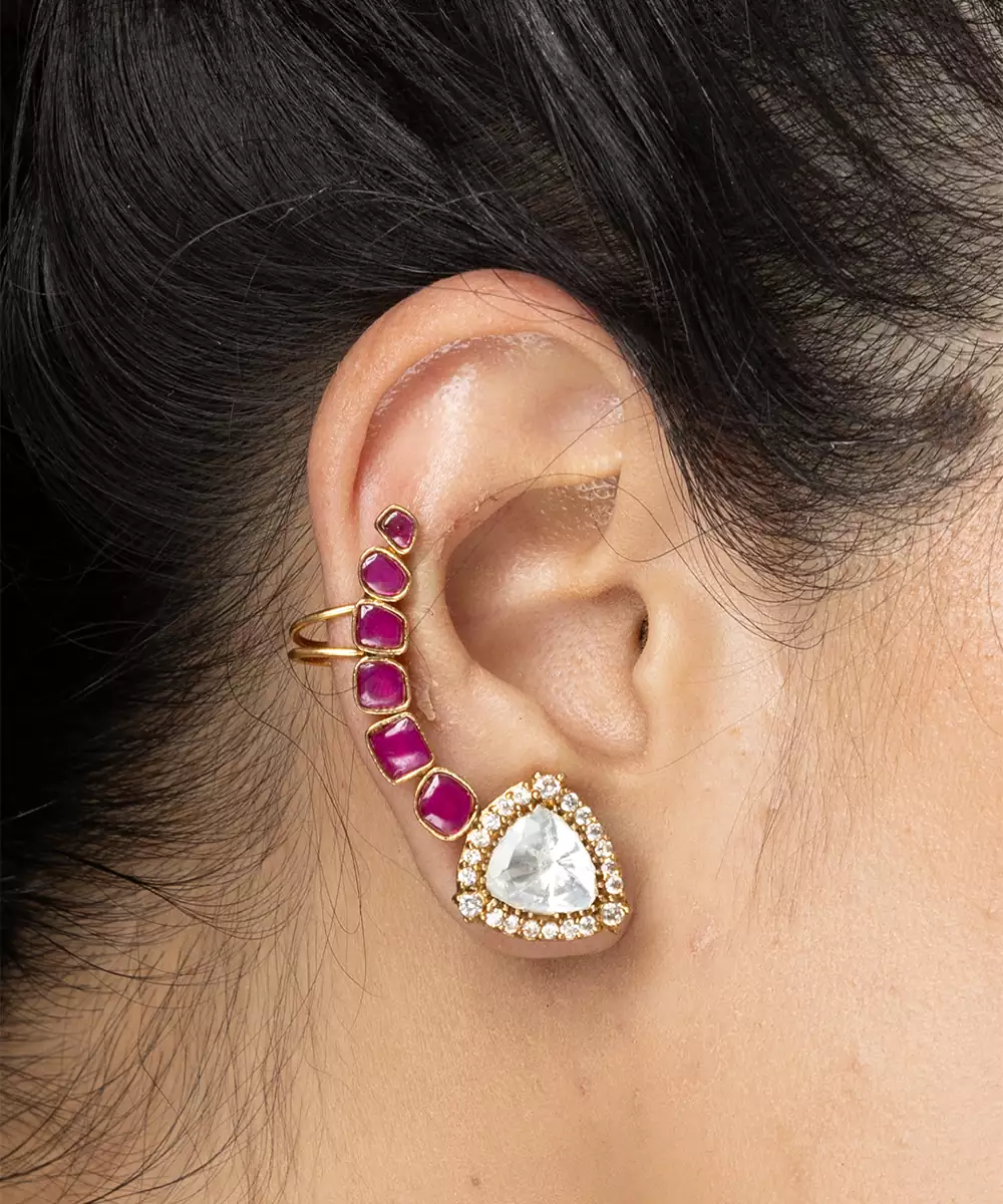 Make A Bold Statement With These Ruby Serpent Cuff Earrings. Designed With Intricate Curves, Gleaming Gold Finish, And Striking Ruby Accents, They Bring A Royal Flair To Your Look. Perfect For Festive Occasions Or Glamorous Evenings.