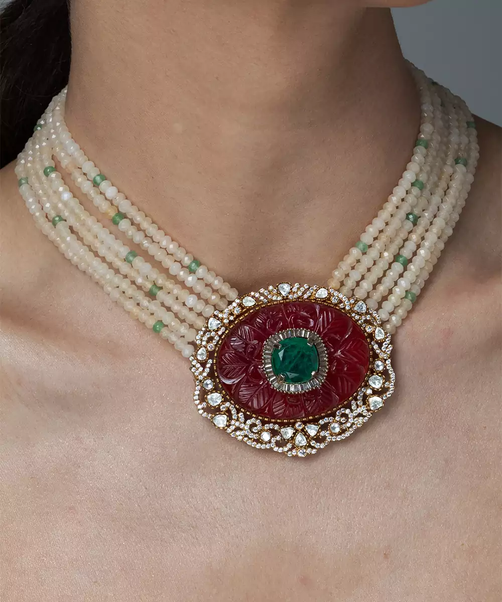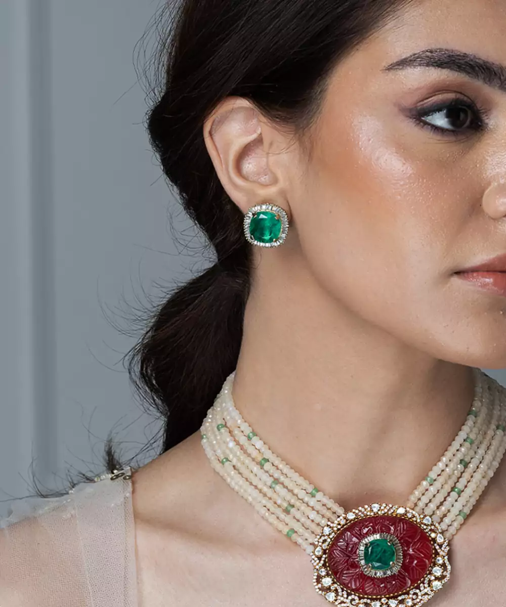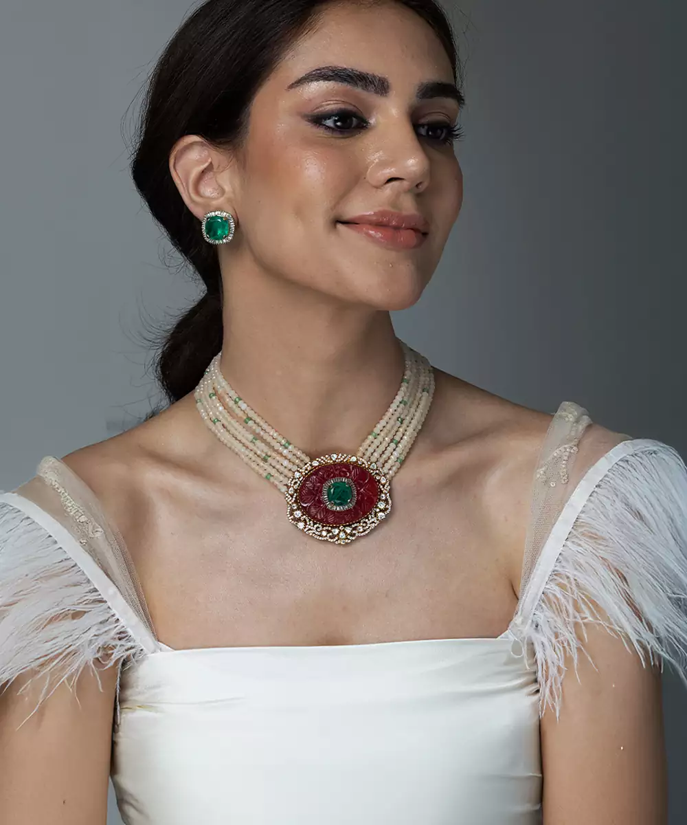 This Gorgeous Shopjbr Necklace Features Multiple Strands Of Delicate Pearls Culminating In A Striking Kundan Style Centrepiece With Ruby And Emerald Accents. It Is Paired With Elegant Matching Stud Earrings, Making It Perfect For Any Grand Celebration