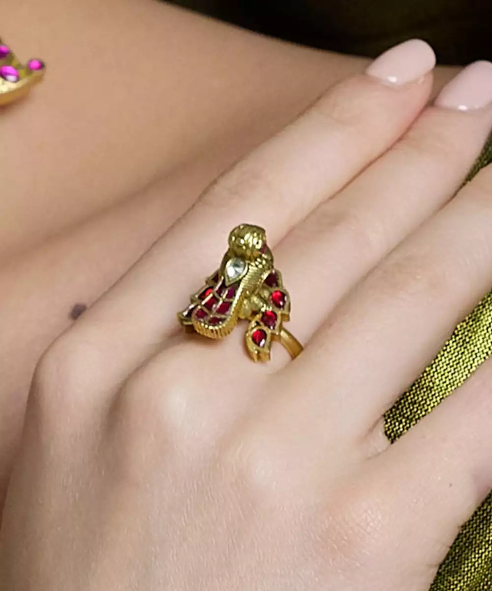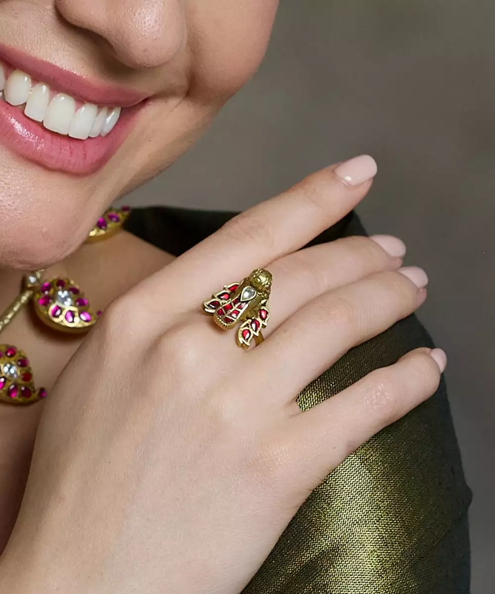 The Golden Temple Drop Ring Blends Traditional Elegance With Intricate Detailing, Featuring A Radiant Gold Finish And Temple Inspired Design—Perfect For Ethnic Ensembles And Festive Celebrations.