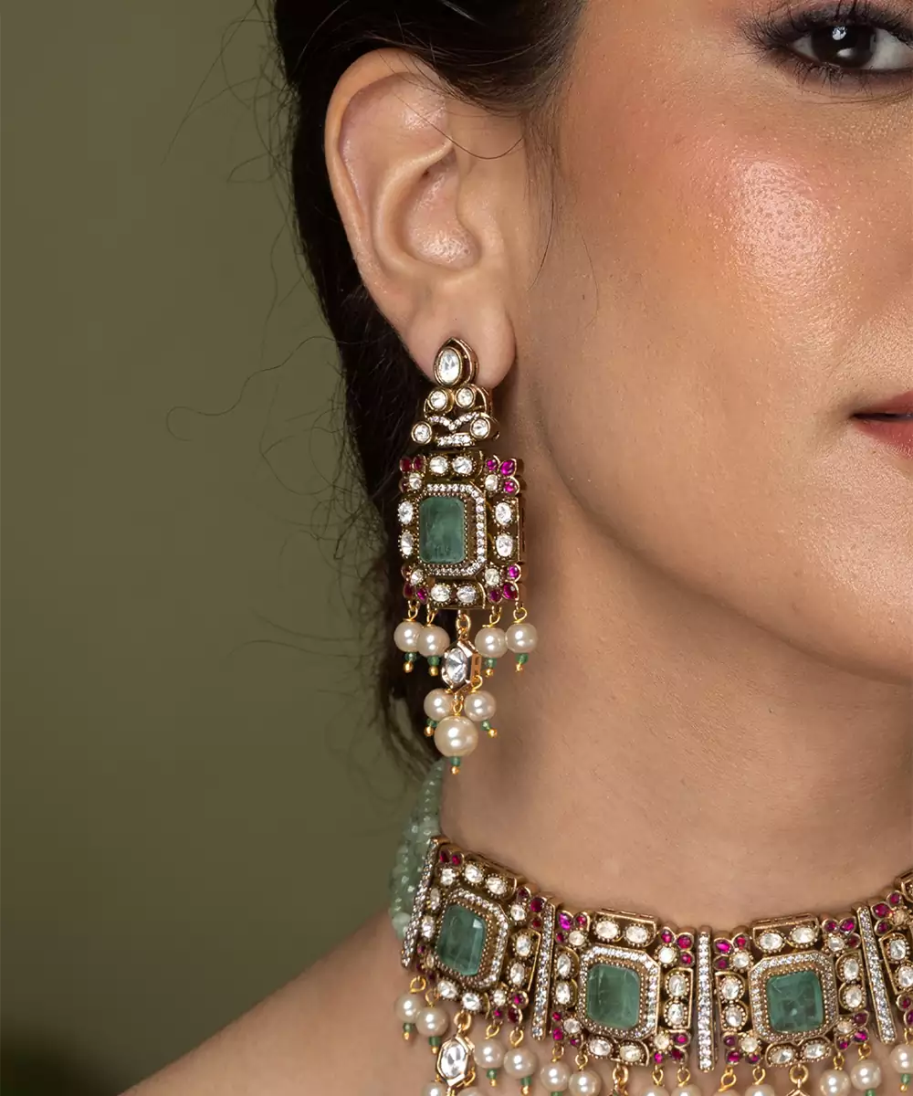An Elegant Choker Set Featuring Square Green Stone Sections Separated By Accents Of Ruby Toned Stones And Hanging Small Pearls. The Matching Green Beaded Strand Makes It An Ideal And Sophisticated Gift.