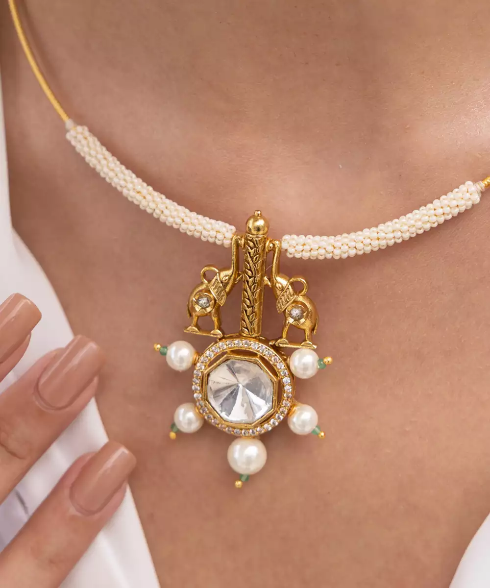 Centering Around A Dramatic Floral Motif With Pearl And Kundan Accents, This Necklace Offers A Poised Balance Of Structure And Sparkle. A Flawless Pick For Statement Making Elegance At Sangeet Nights Or Modern Festive Gatherings.