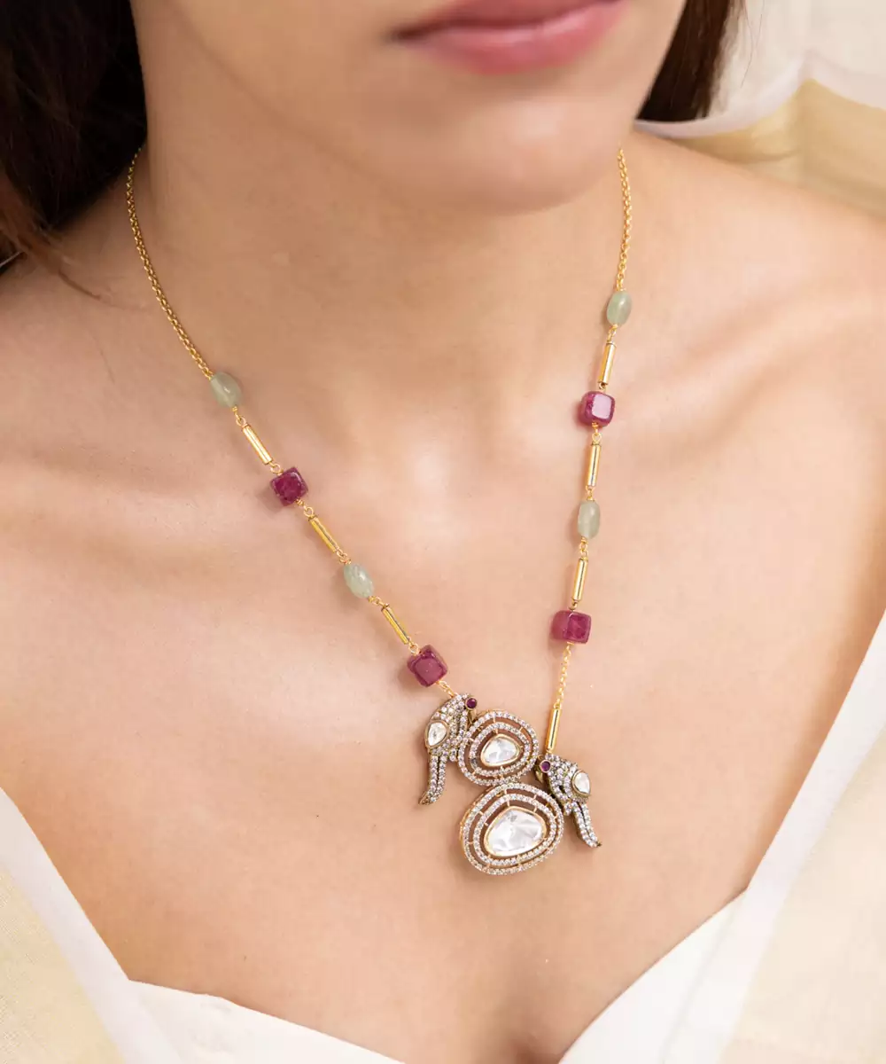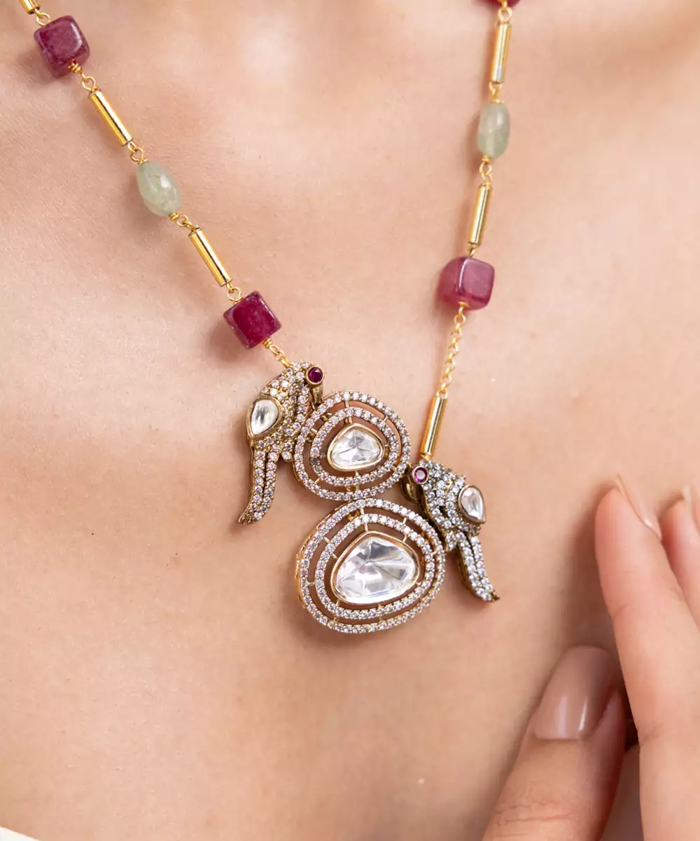 A Vibrant Necklace Featuring Multicolored Beads Interspersed With Kundan Work And An Ornate Pendant. Full Of Youthful Flair And Bird Motif Artistry, It Feels Like A Celebration In Every Strand. Ideal For Haldi, Mehendi, Or Boho Themed Ceremonies.