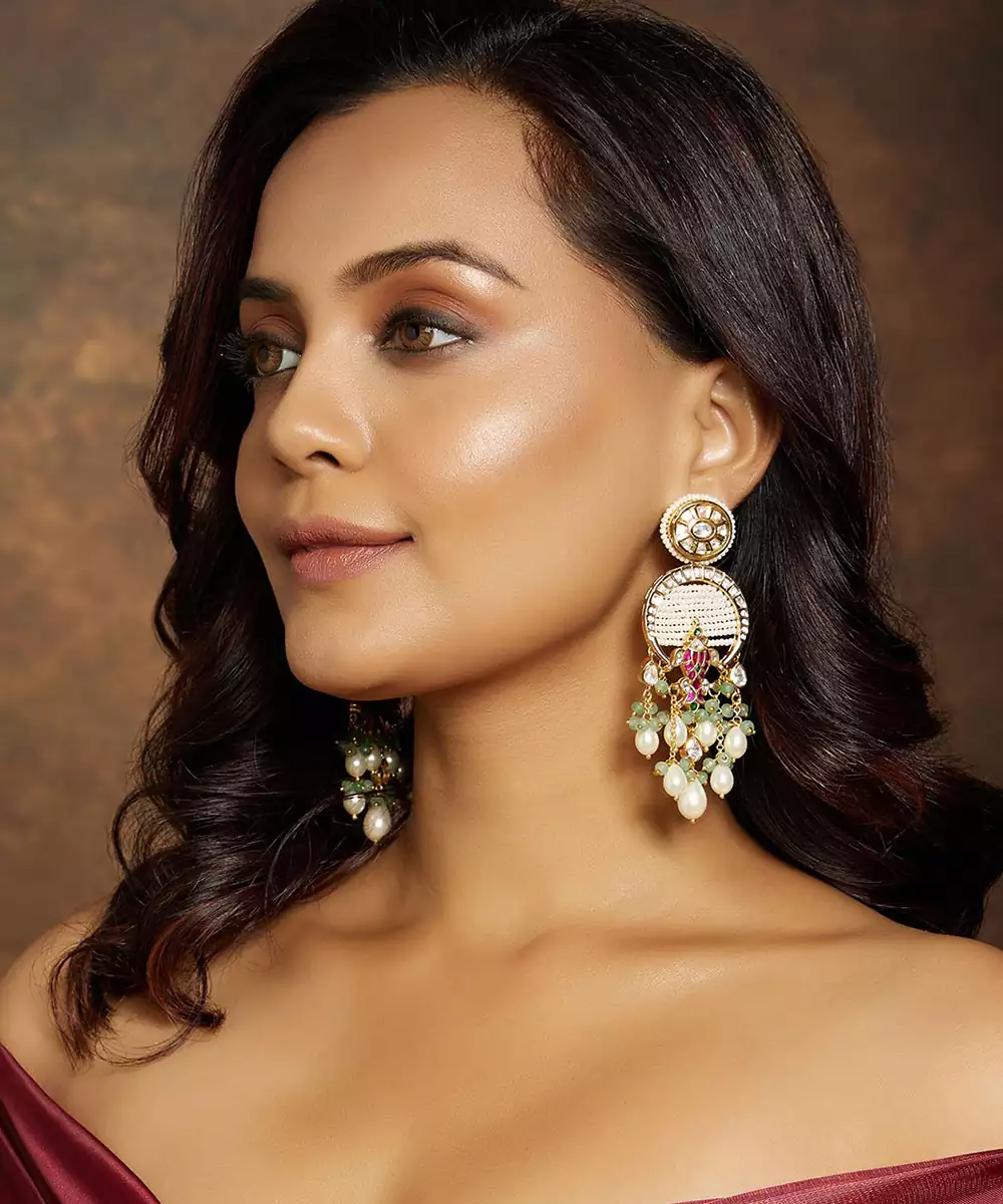 This Designer Chandelier Earring Is Handcrafted With Drop Polkis & Completed With Beautiful Strands Of White Clasic Pearls With Hydro & Green Beads. The Beautiful Motif In The Centre Is Made With Rich Artisanal Work Of Hydro Rubies & Emerlads. Ideal To Be Worn On Festive, Wedding & Party Occassions On Your Indian & Fusion Attire. Every Artistic Piece Is Made With Real Semi Precious Stones Only, Giving It A Regal Look & Feel.