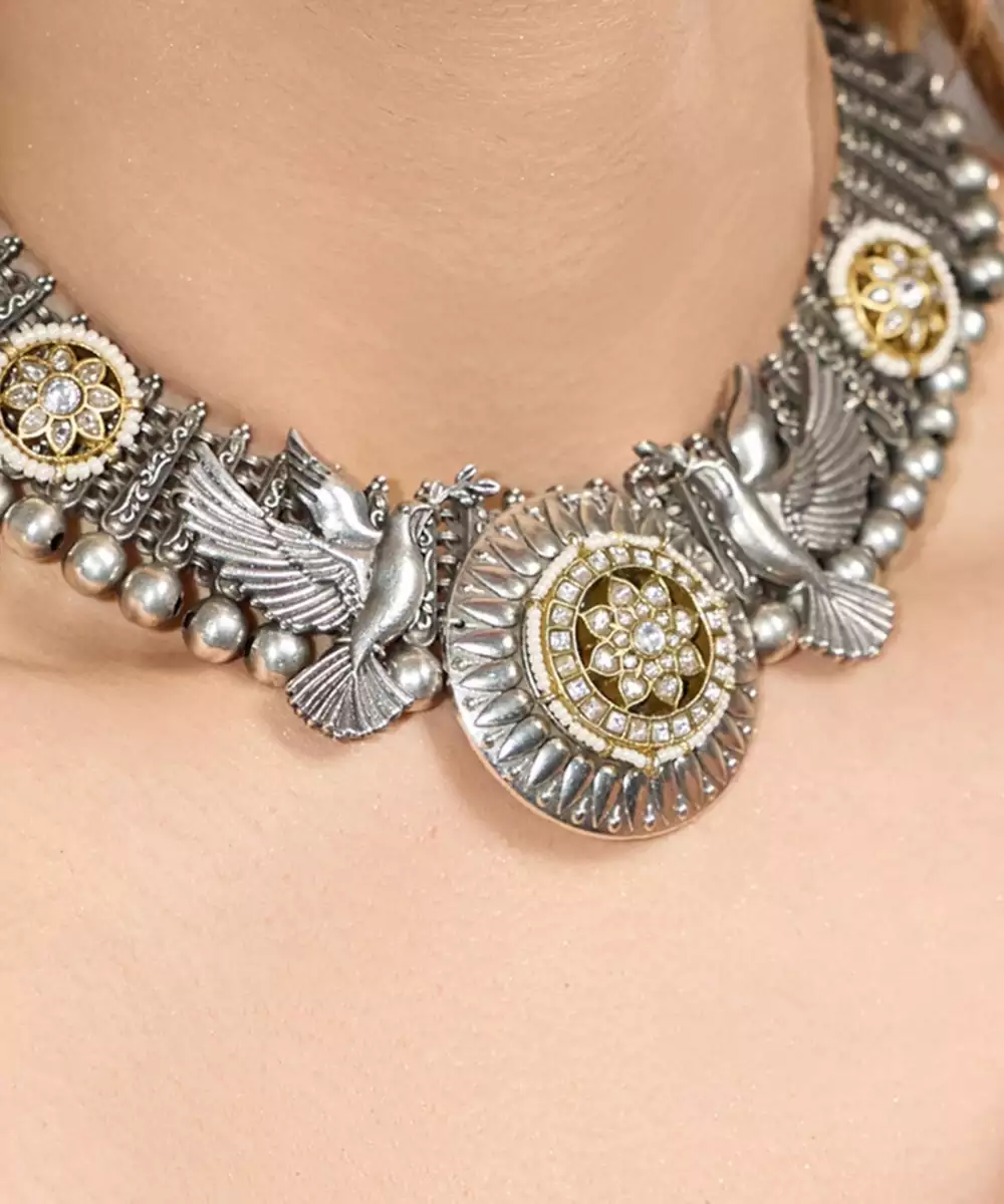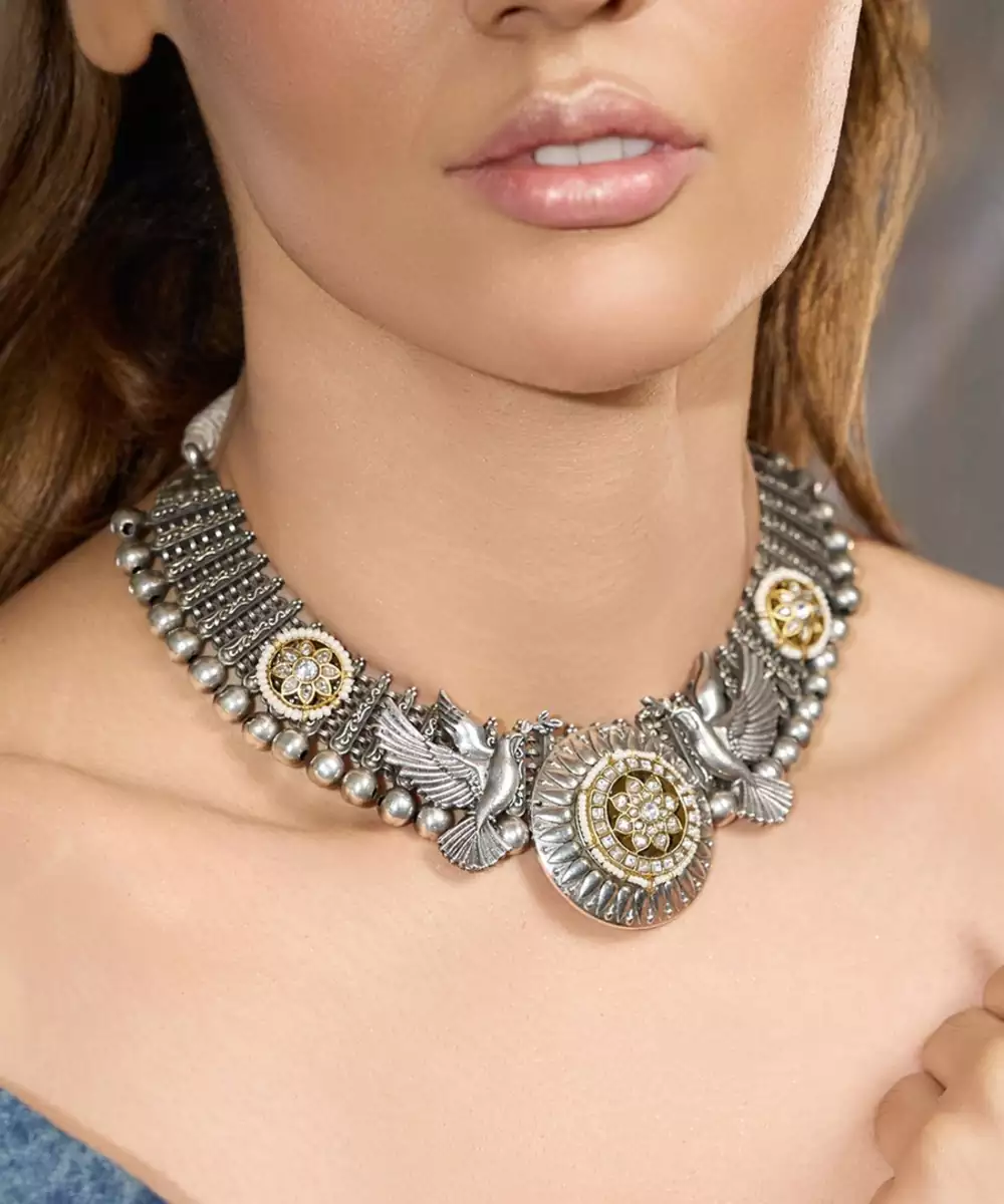 A Blend Of Elegance And Traditional Look, This Choker Showcases Intricate Oxidized Detailing With Antique Gold Accents And Floral Motifs. Perfect For Pairing With Ethnic Wear Or Boho Fusion Outfits.