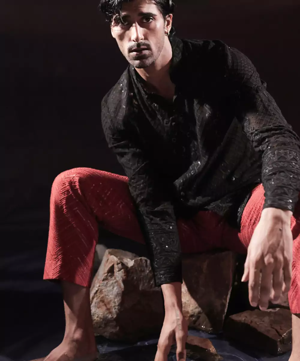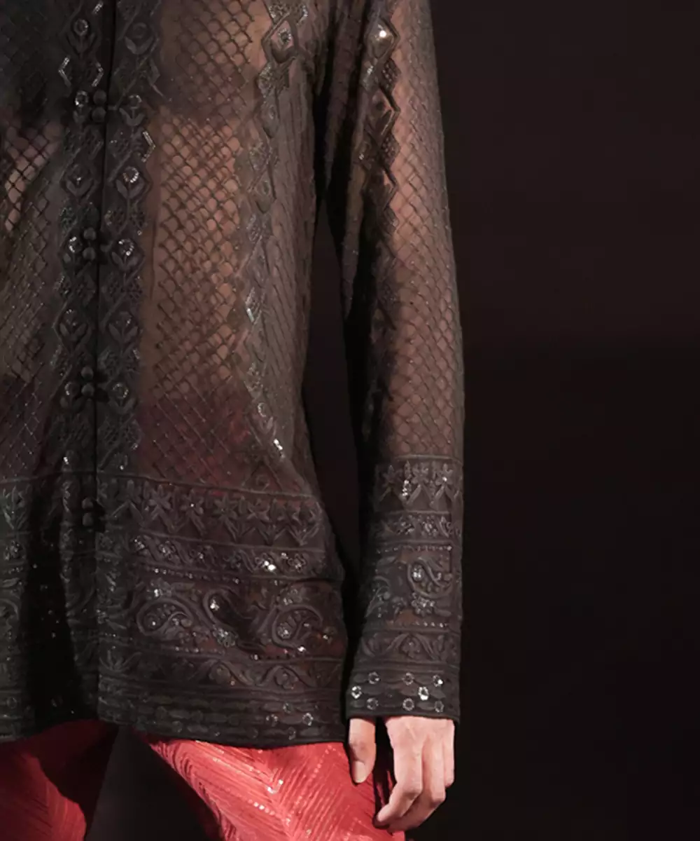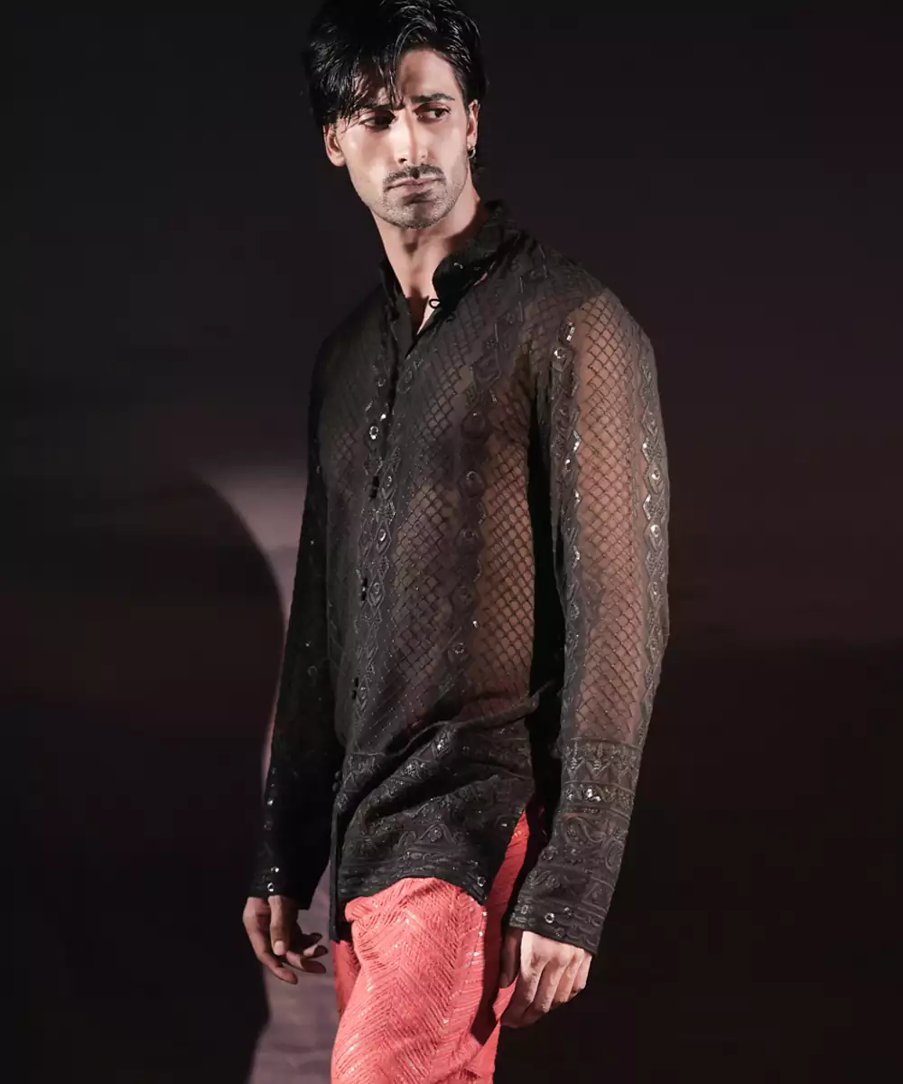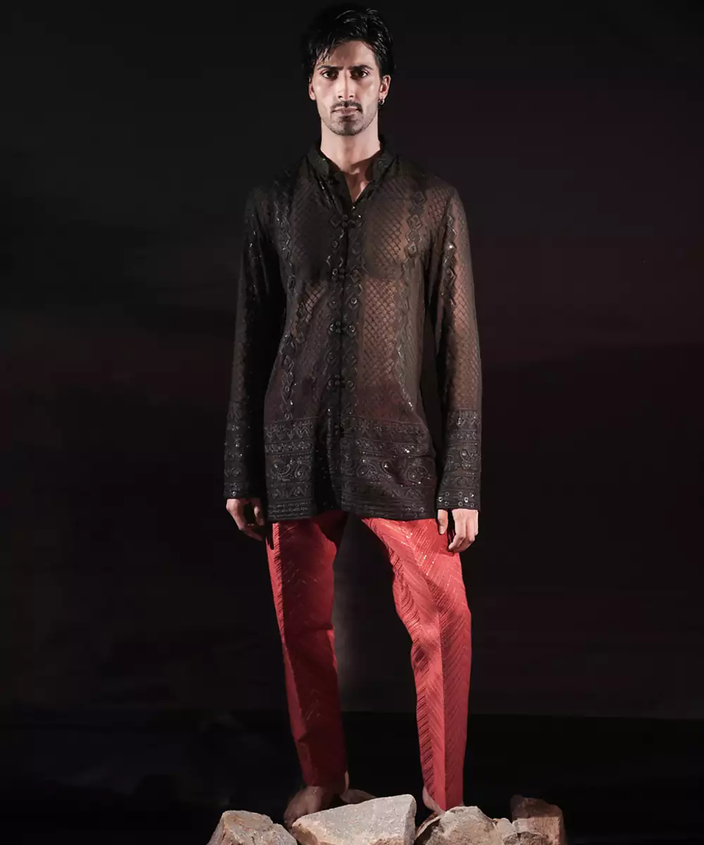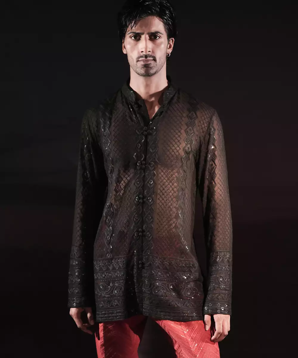 Step Into Elegance With Our Black Chikankari Georgette Short Kurta, Finished With A Front Opening Adorned With Potli Buttons