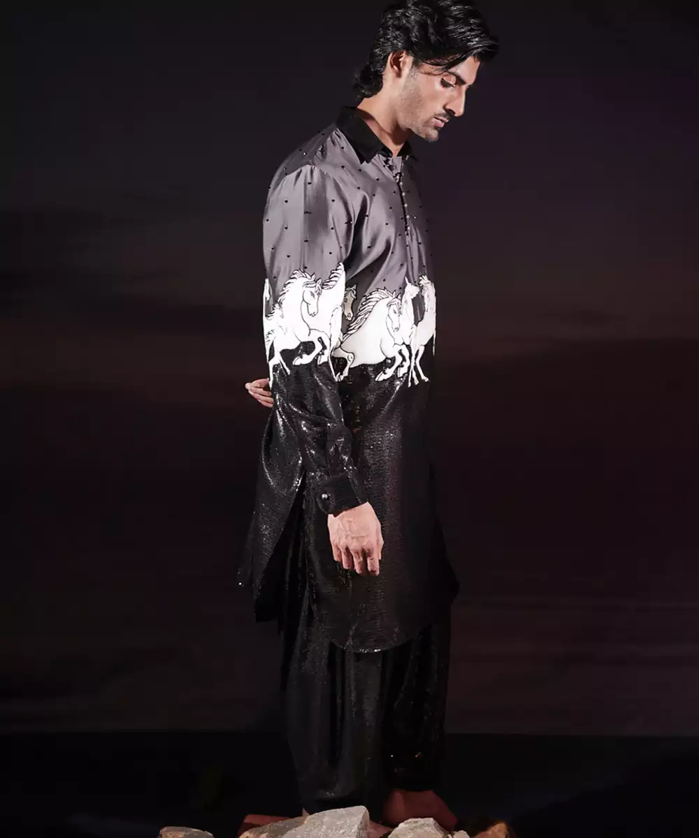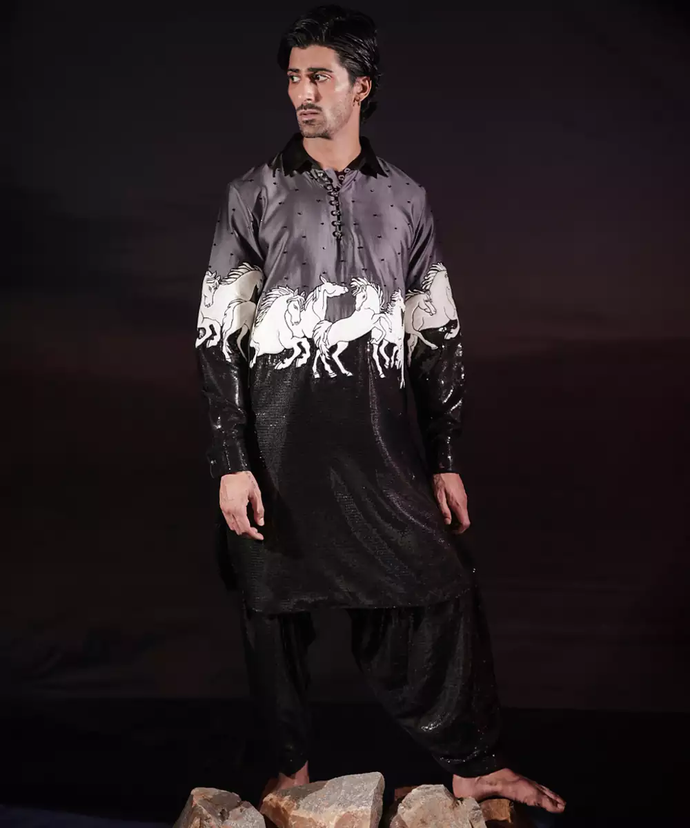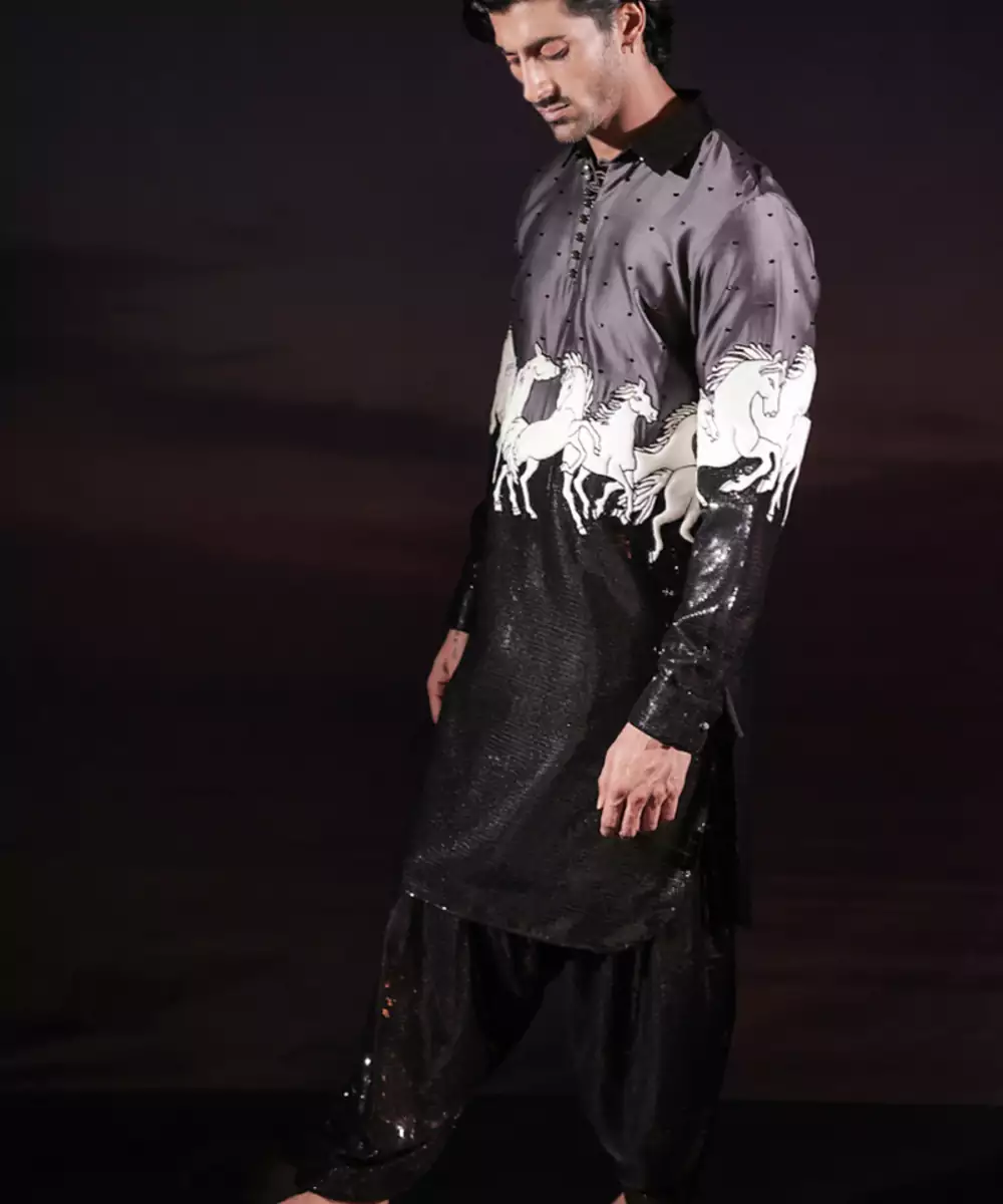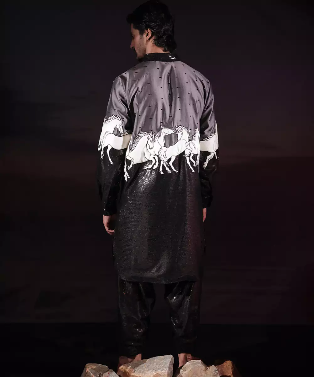 A Black Sequined Georgette Pathani Kurta Paired With Salwar Pants, Featuring White Velvet Quilted Patchwork Of Running Horses Across The Chest, Sleeves And Back. The Look Is Completed With A Grey Cotton Silk Yoke, Delicately Embellished With Crystal Bead Dots For Added Texture And Refinement