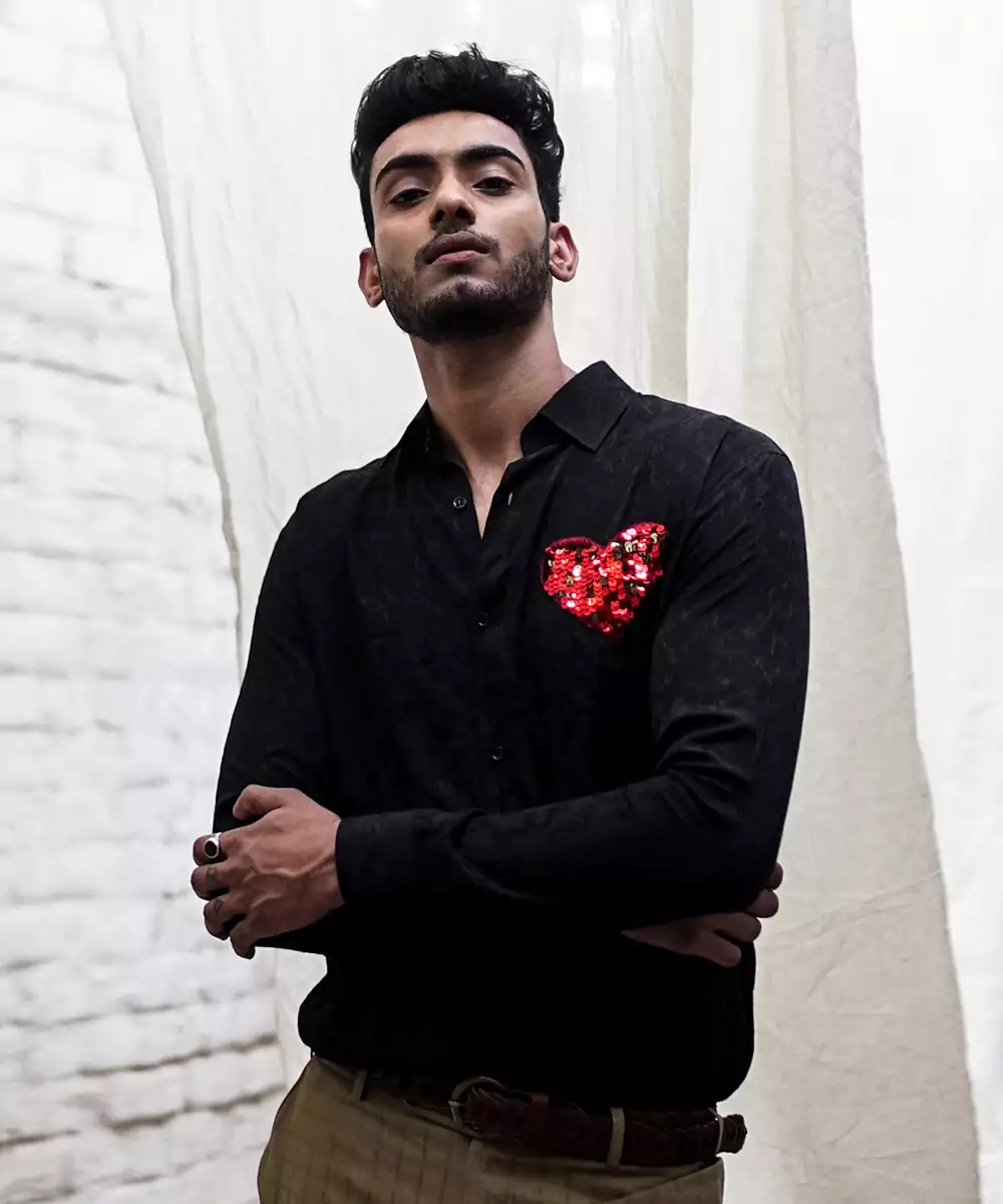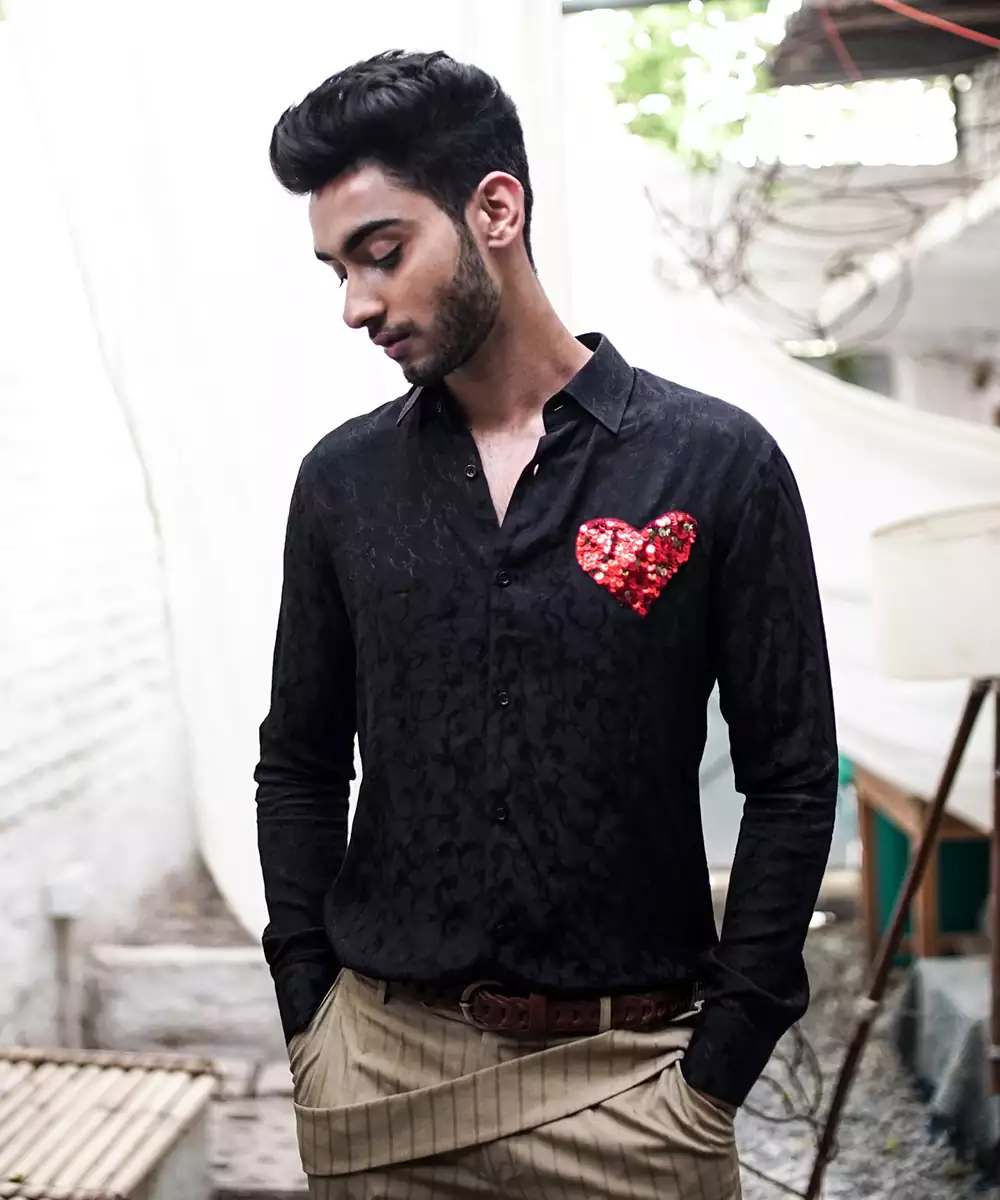 Black Jacquard Shirt With Hand Embroidery Sequin Heart.