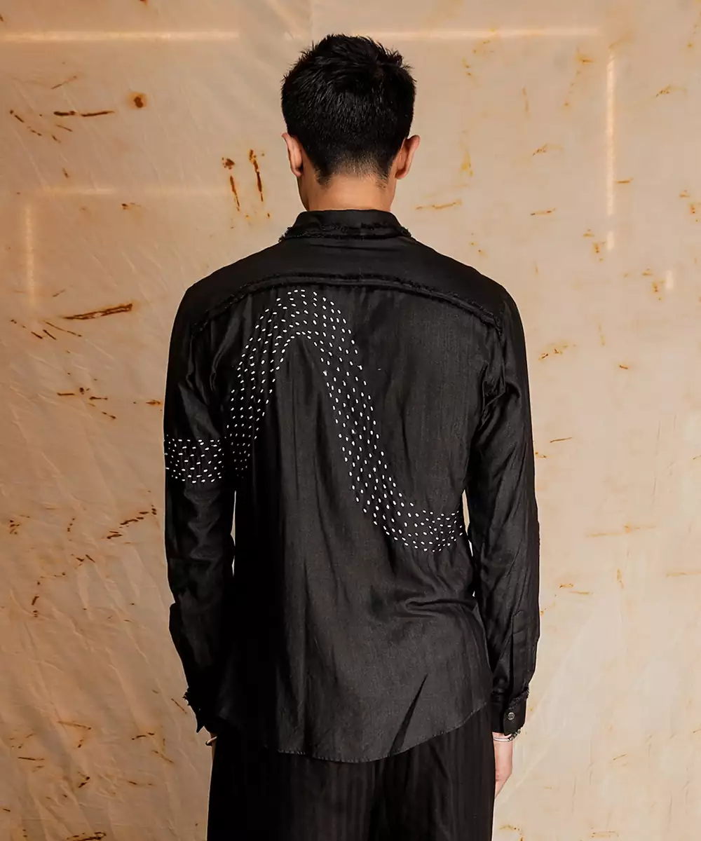 Charcoal Black Shirt With Fray Edge And Kantha Stitch Details.