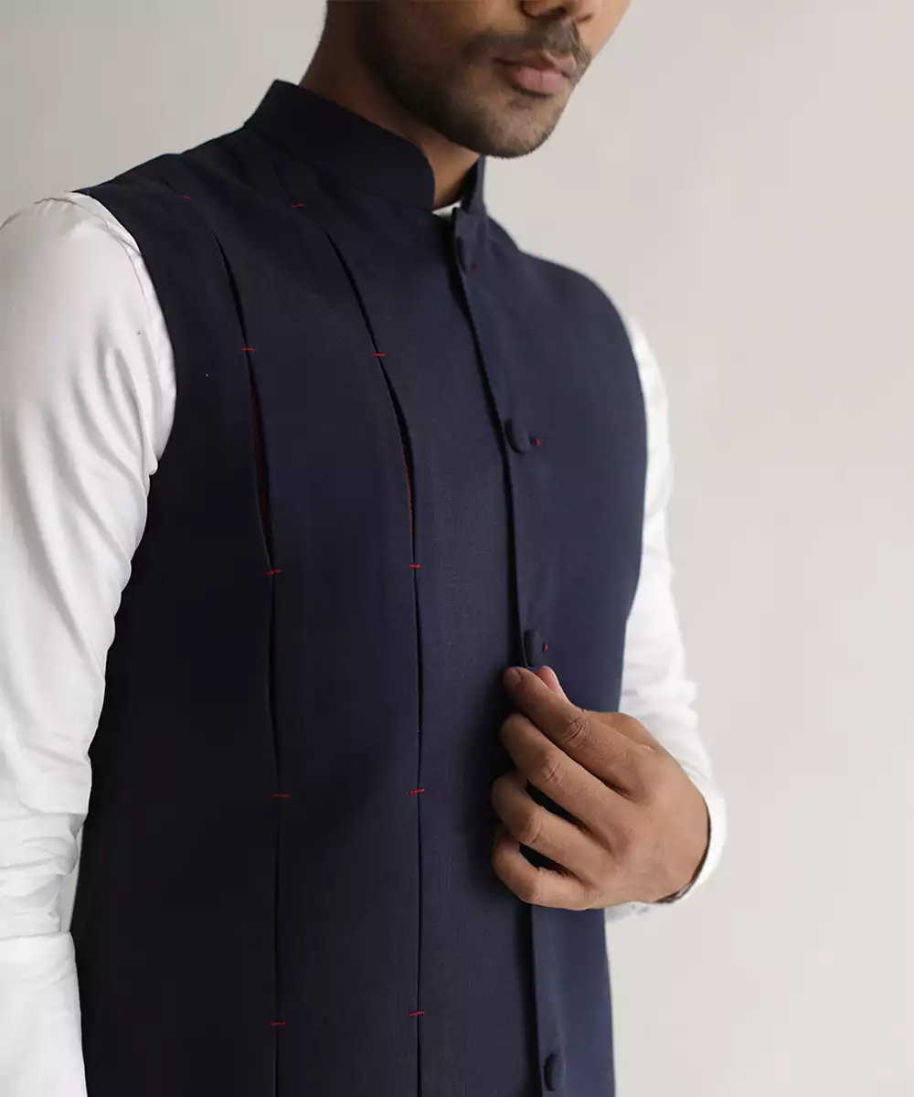 Buttoned Up Nehru Jacket. One Of Our Bestsellers. Box Pleat Jacket With Hidden Katha Lines. Fabric Buttons. Detailing With Handwork In Red Color.