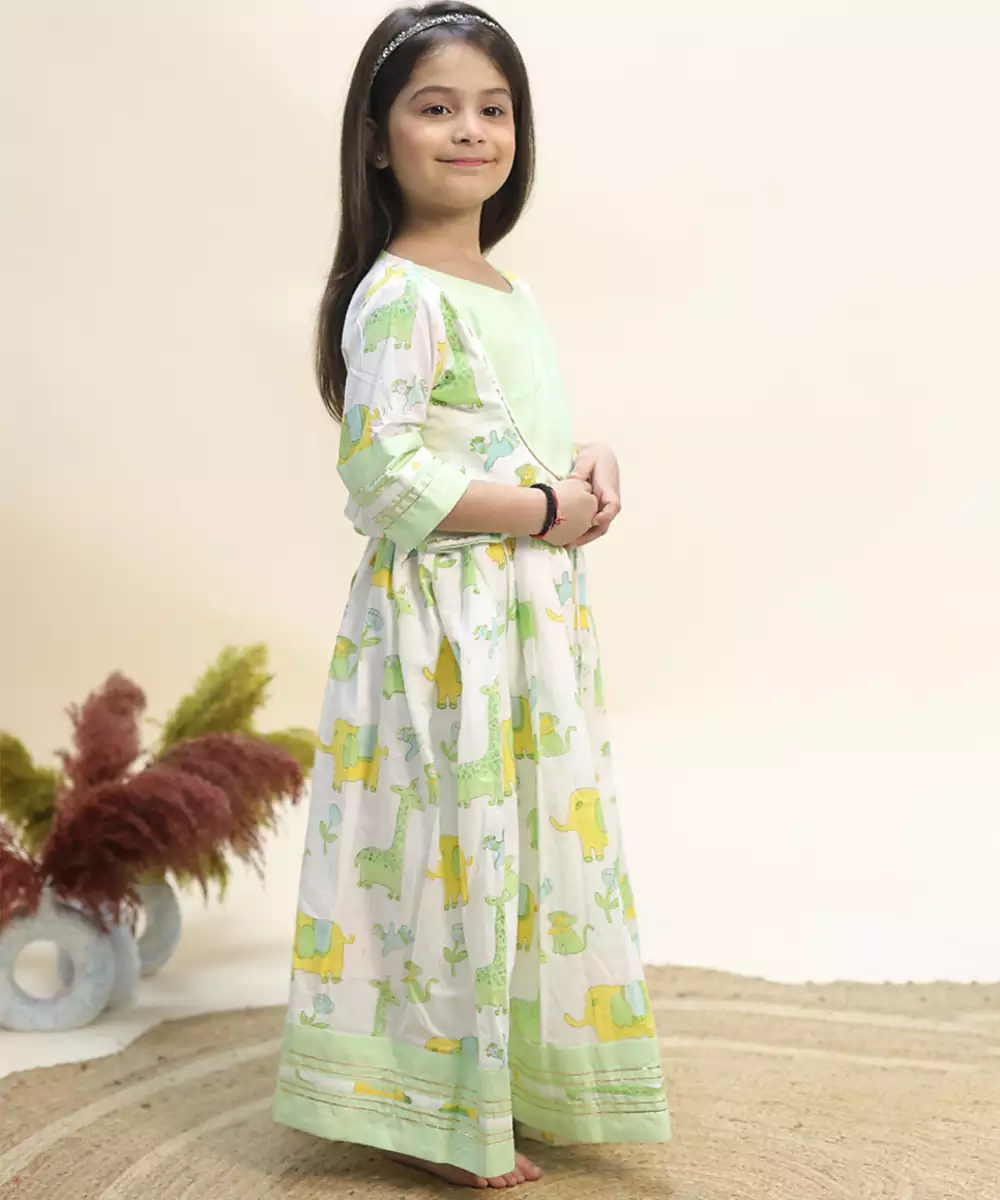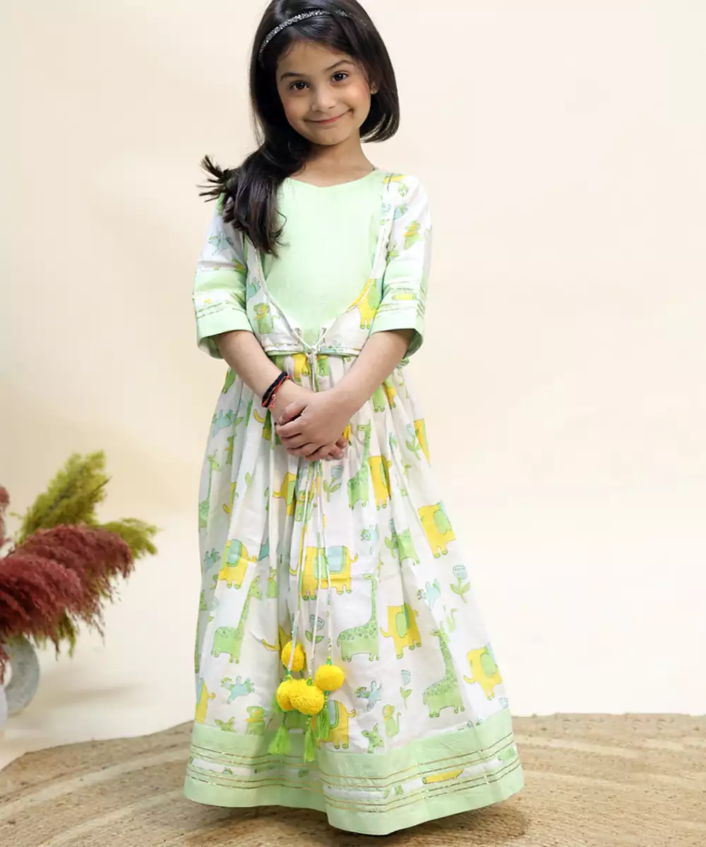 A Stylish Green Indo Western Lehenga Set Highlighted With Vibrant Prints For A Contemporary Ethnic Look. Crafted From Breathable Cotton, It Offers Comfort With Graceful Flair. Perfect For Festive Occasions And Cultural Gatherings, This Ensemble Merges Traditional Silhouettes With Modern Printed Artistry.